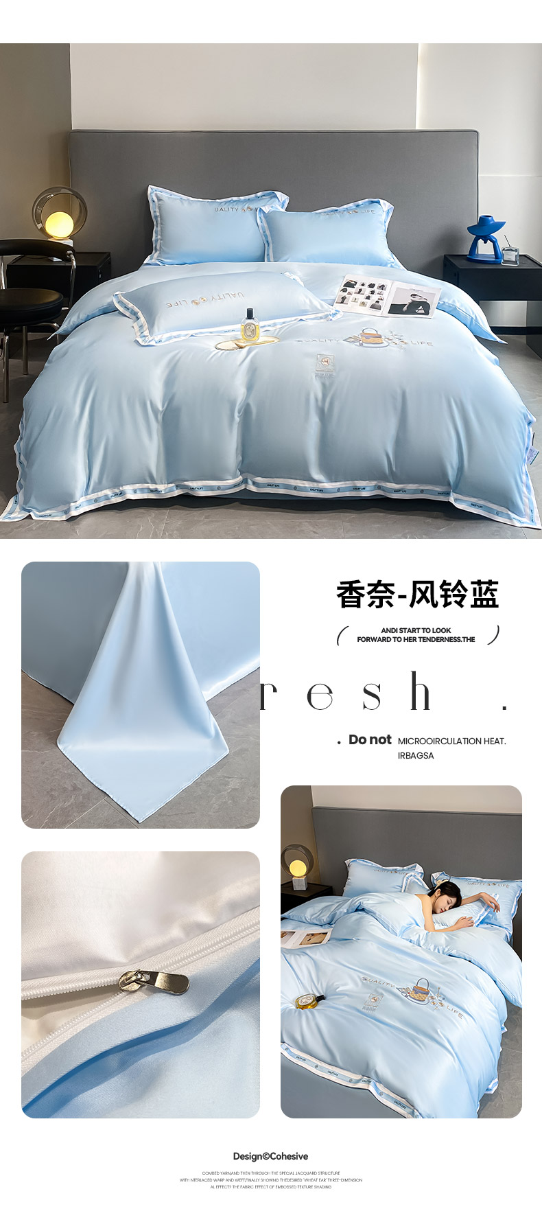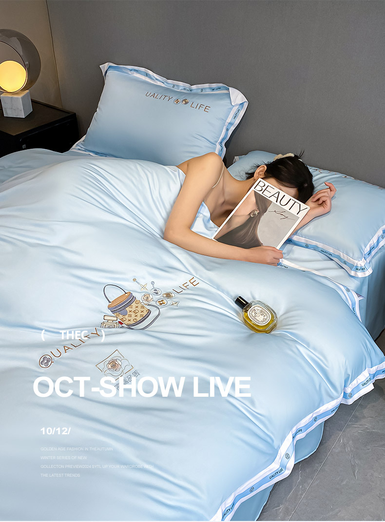欧冠家纺 2024新款大牌风60S水洗真丝刺绣床笠被套四件套香奈系列 香奈-风铃蓝