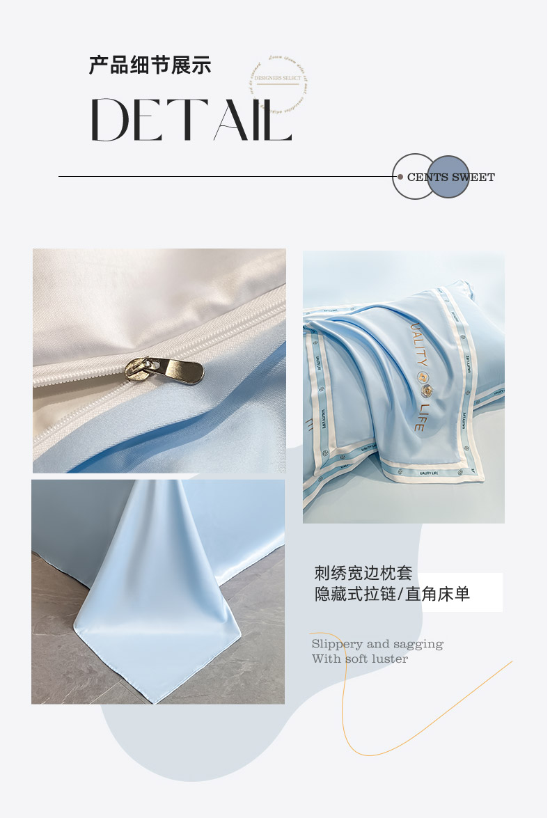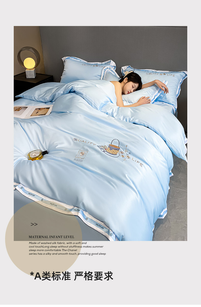 商品名称:欧冠家纺 2024新款大牌风60S水洗真丝刺绣床笠被套四件套香奈系列 香奈-风铃蓝