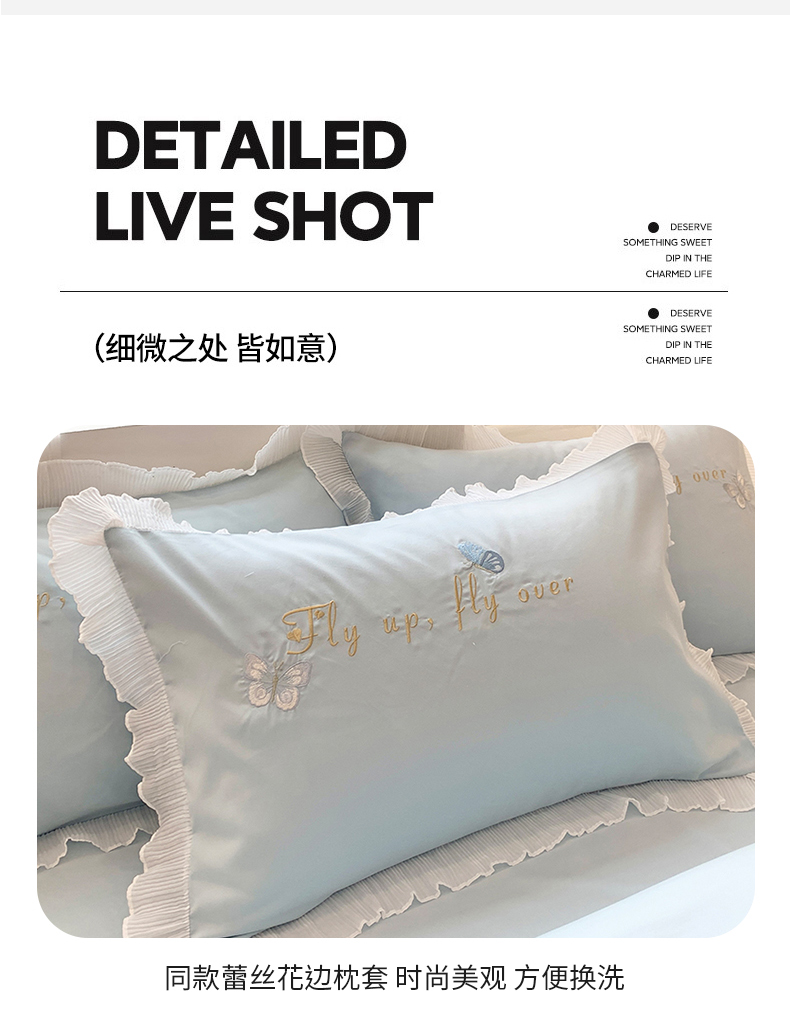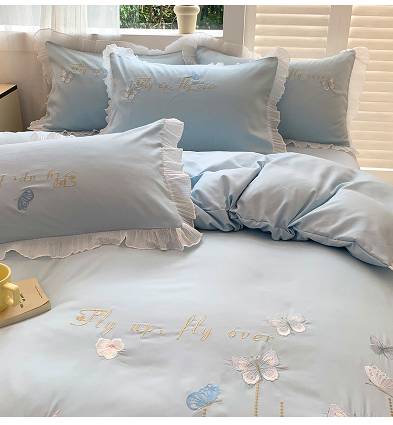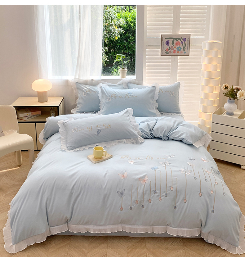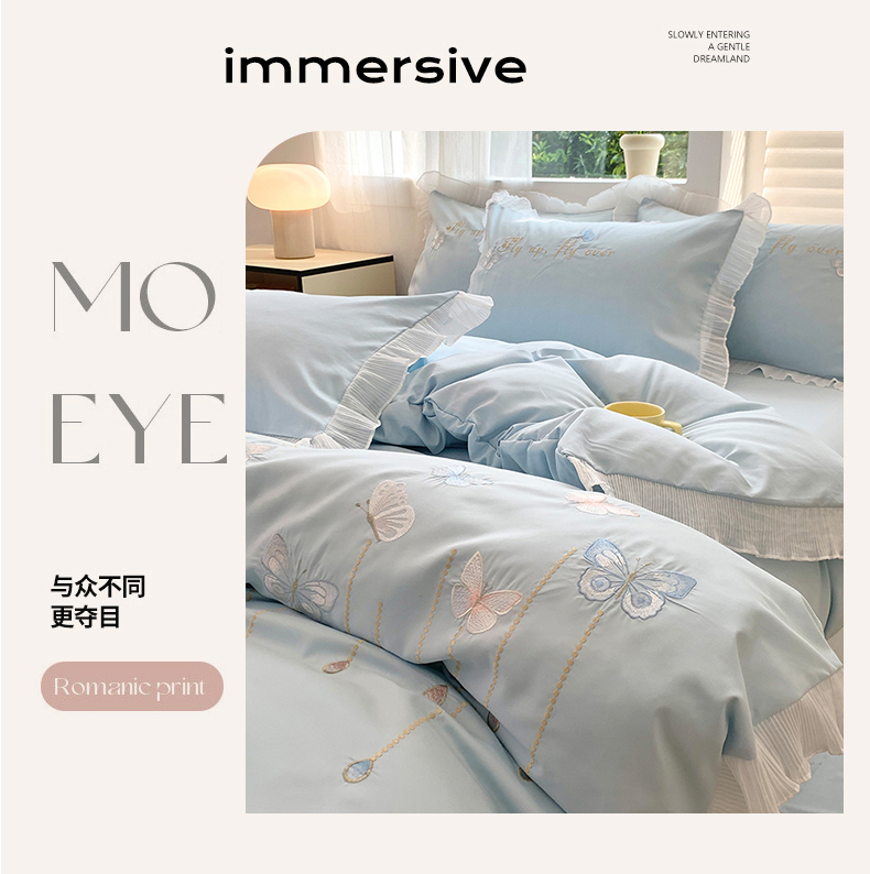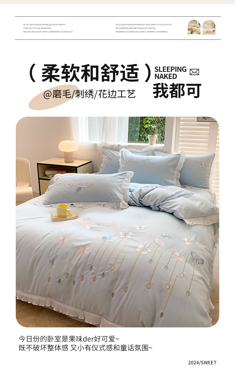 凯艾玲 2024新款简约轻奢磨毛细斜纹四件套-翩碟物语 蓝色