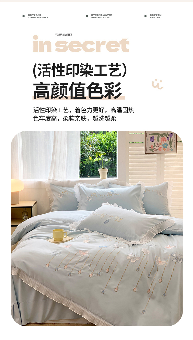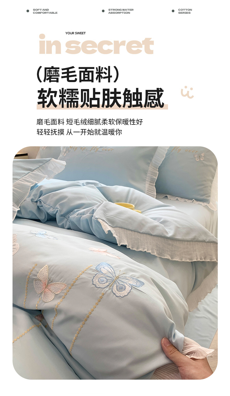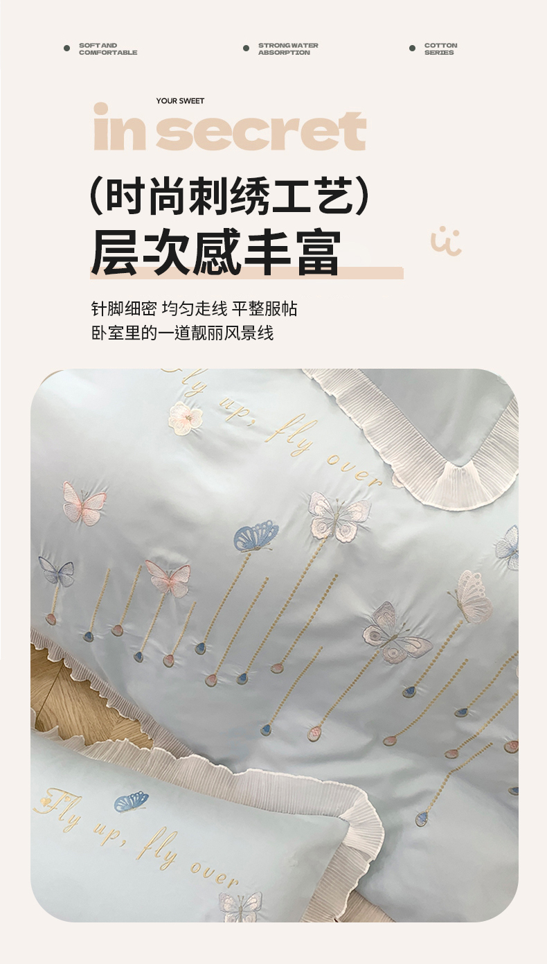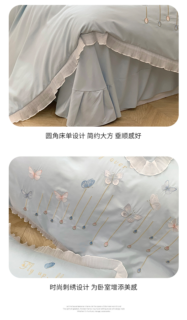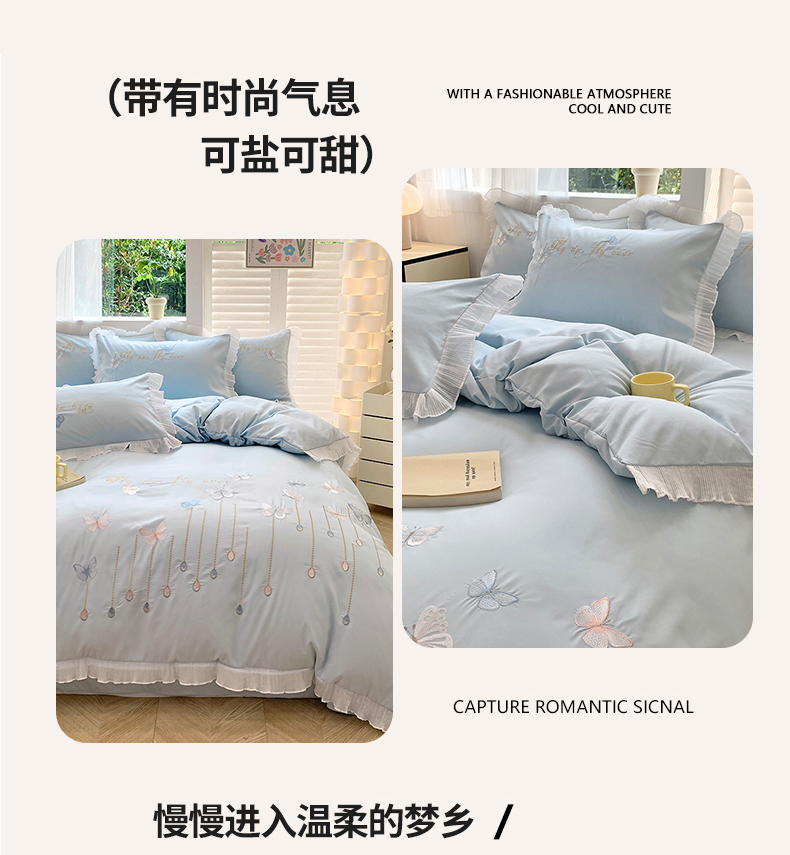 商品名称:凯艾玲 2024新款简约轻奢磨毛细斜纹四件套-翩碟物语 蓝色
