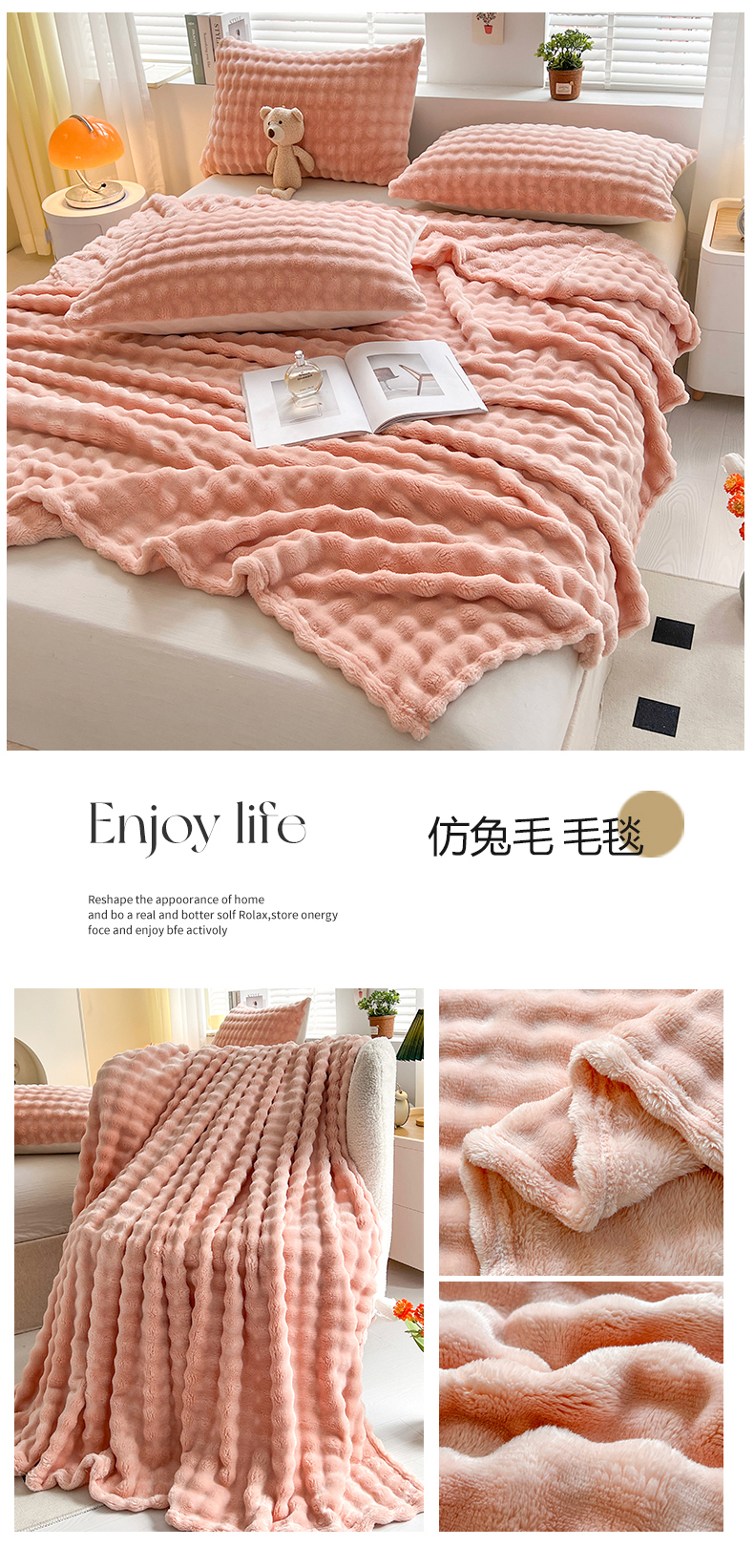 商品名称:芸锦豪 2024新款仿兔毛泡泡绒毛毯-卷边款毛毯 樱花粉-卷边