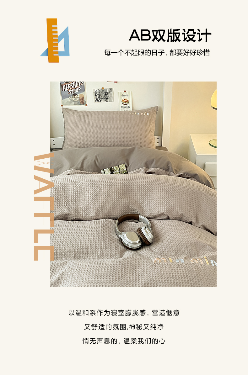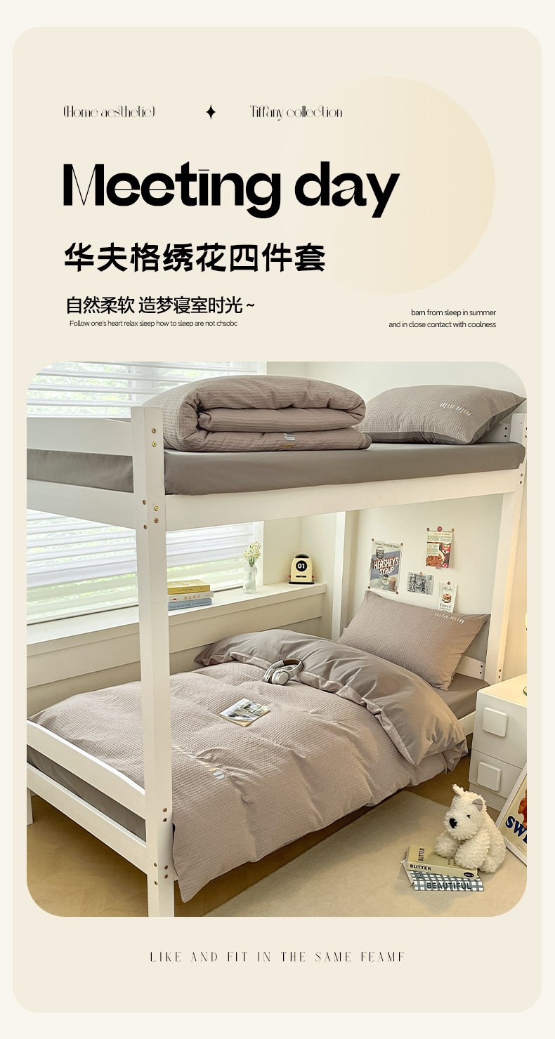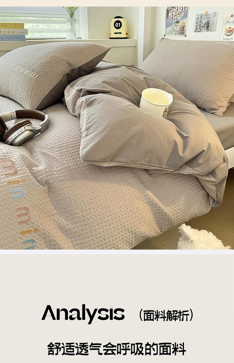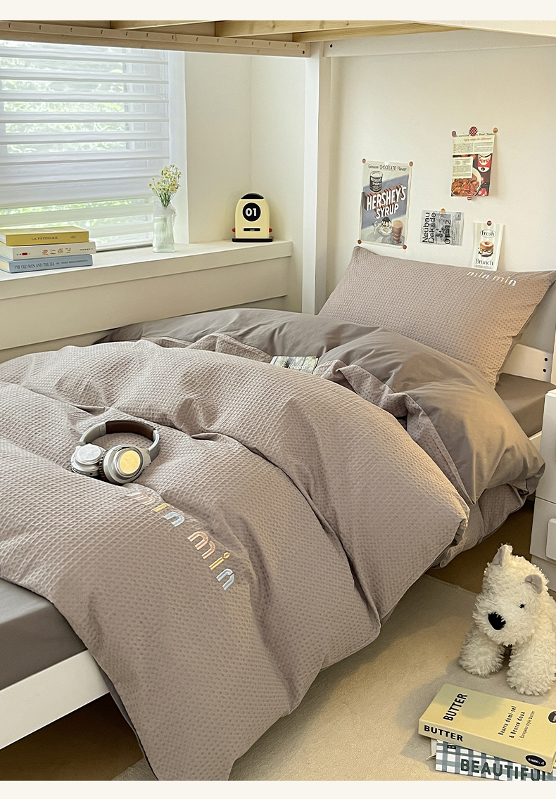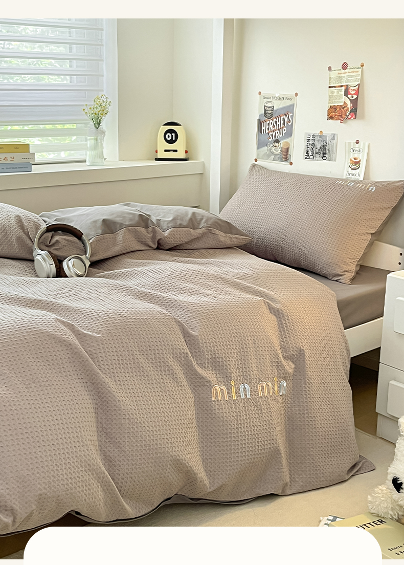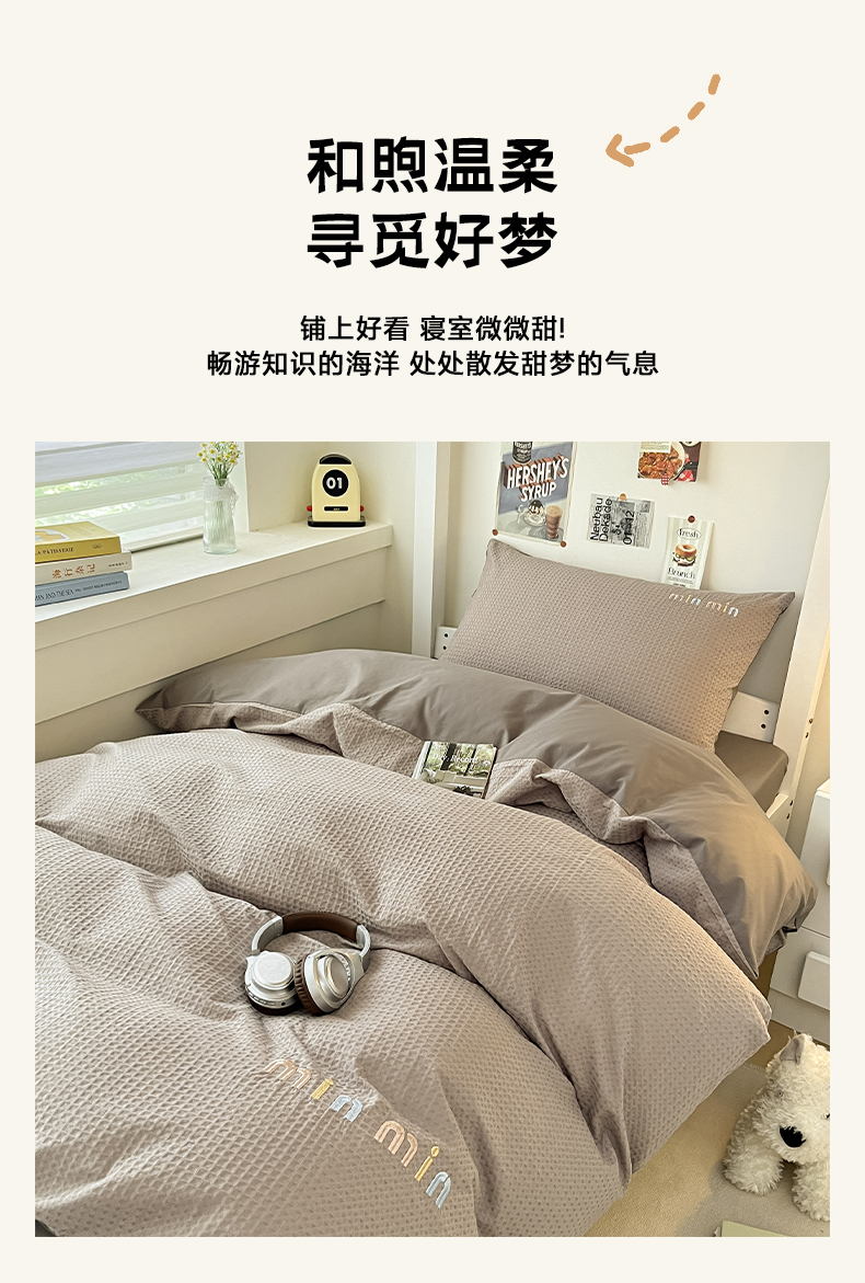 当前位置: 91家纺网 > 商品网购 > 床品套件 > 四件套 > 全棉普通四件套 > 雅居纺家纺 2024新款开学季全棉A类华夫格绣花四件套-Min Min-浅灰