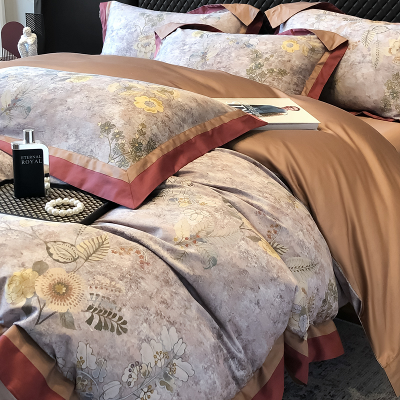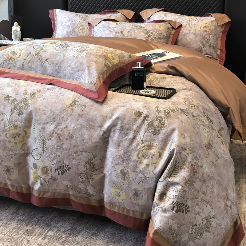 东方名伶 2024新款50S全棉数码印花长绒棉四件套 繁华似锦-黑咖,繁华似锦-黑咖