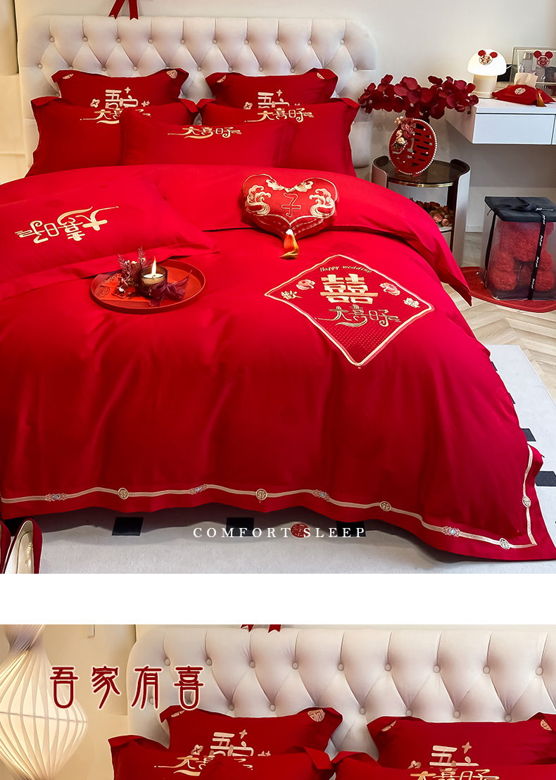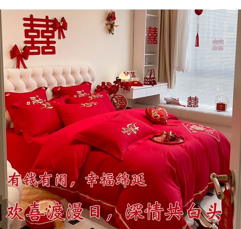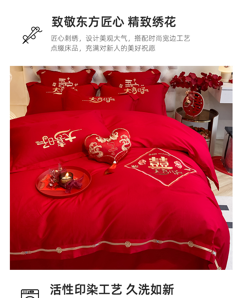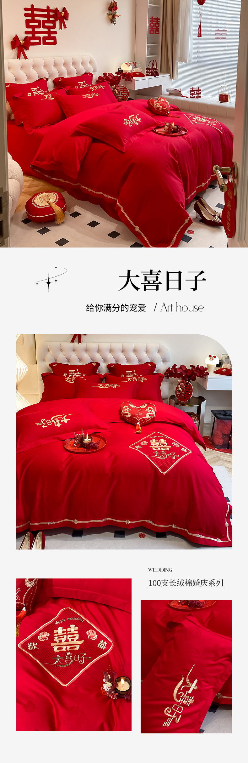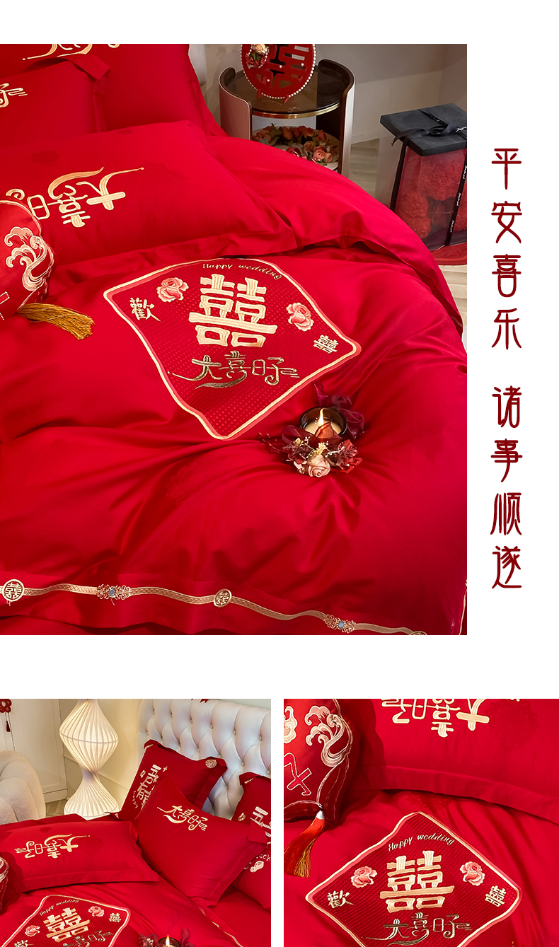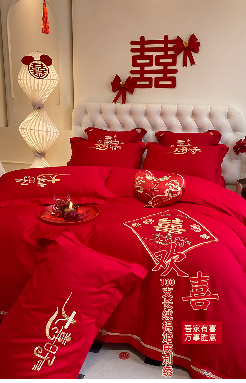 当前位置: 91家纺网 > 商品网购 > 床品套件 > 四件套 > 婚庆四件套 > 玉雅家纺 2025新款100支长绒棉高档提花刺绣婚庆四件套 大喜日子