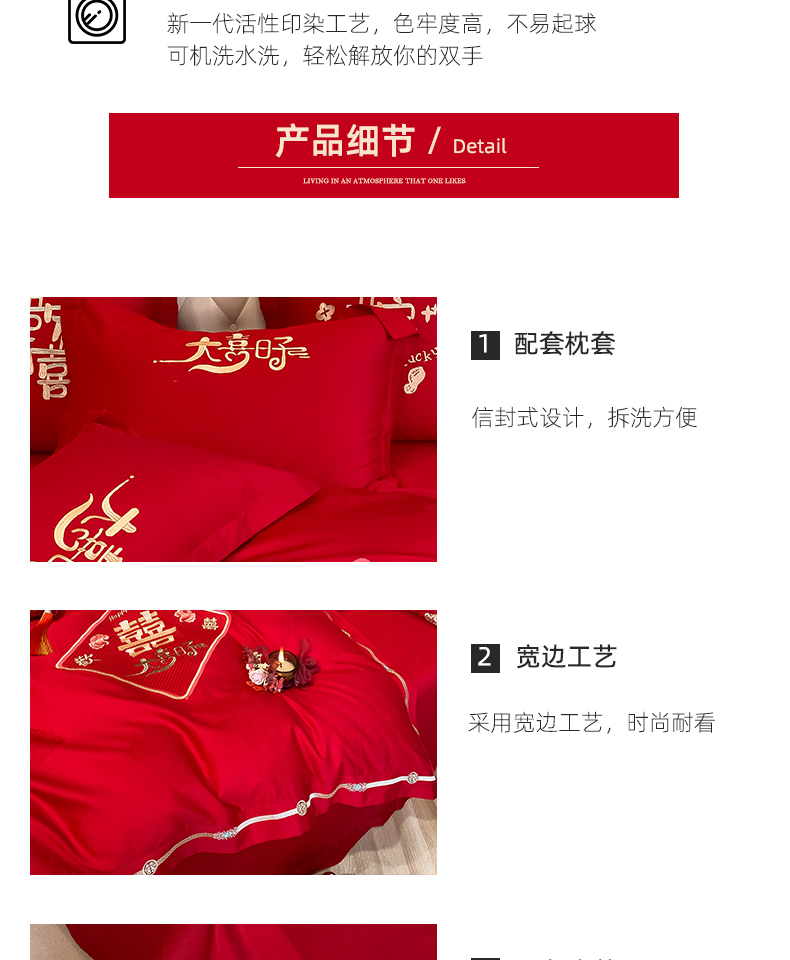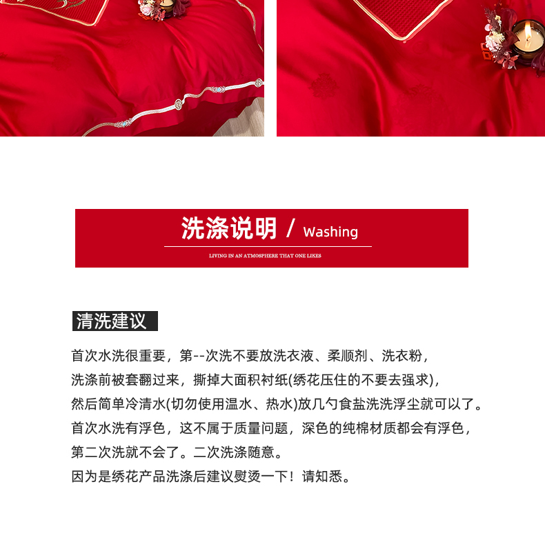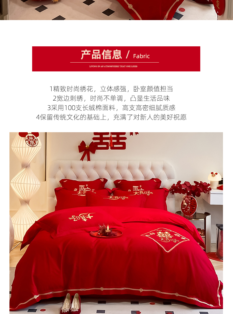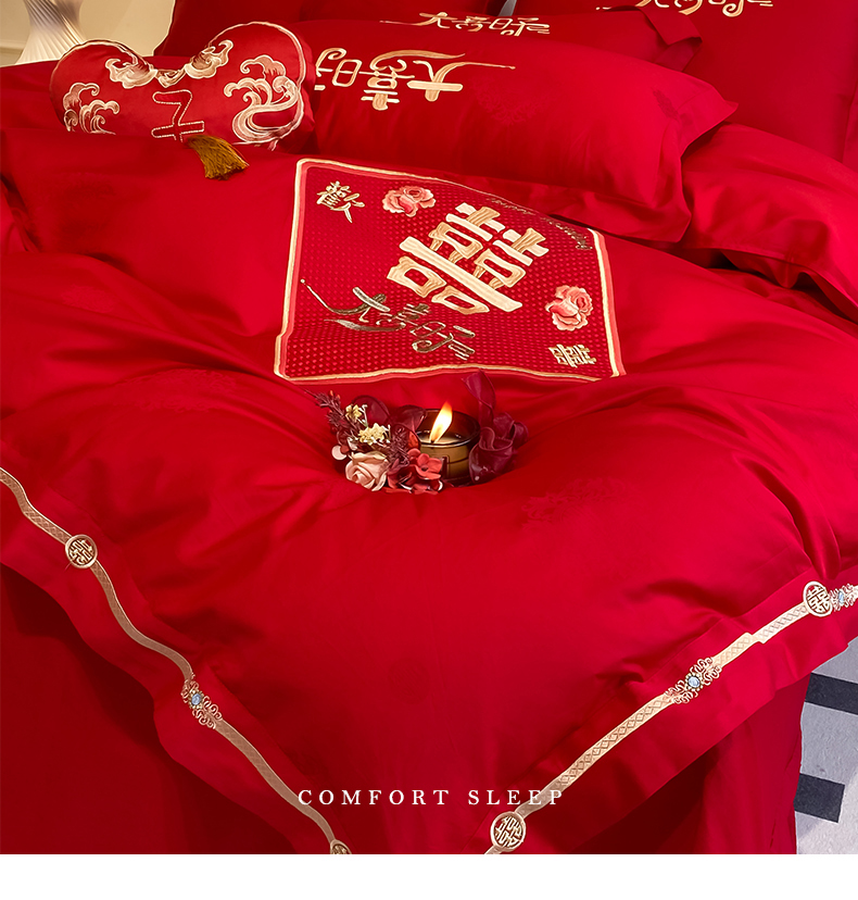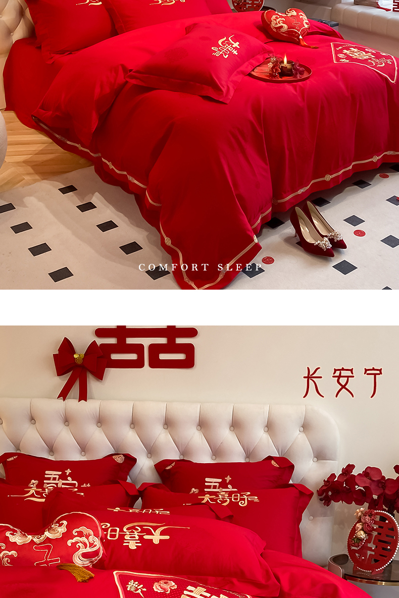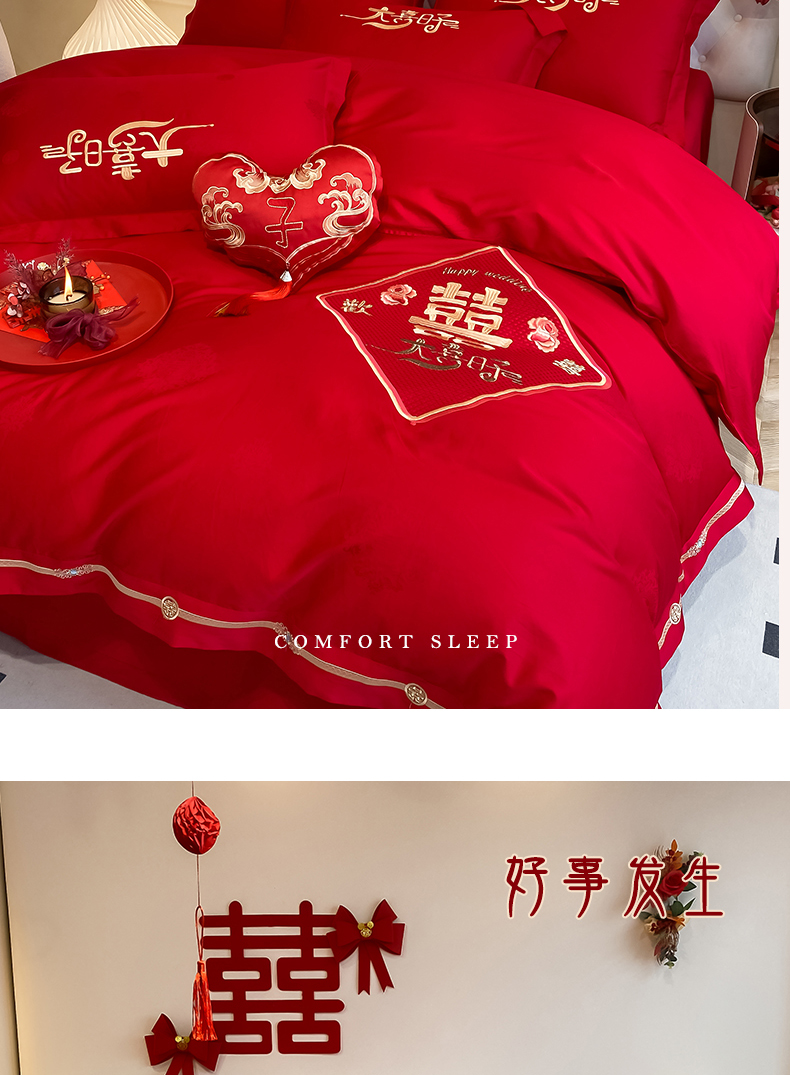 当前位置: 91家纺网 > 商品网购 > 床品套件 > 四件套 > 婚庆四件套 > 玉雅家纺 2025新款100支长绒棉高档提花刺绣婚庆四件套 大喜日子