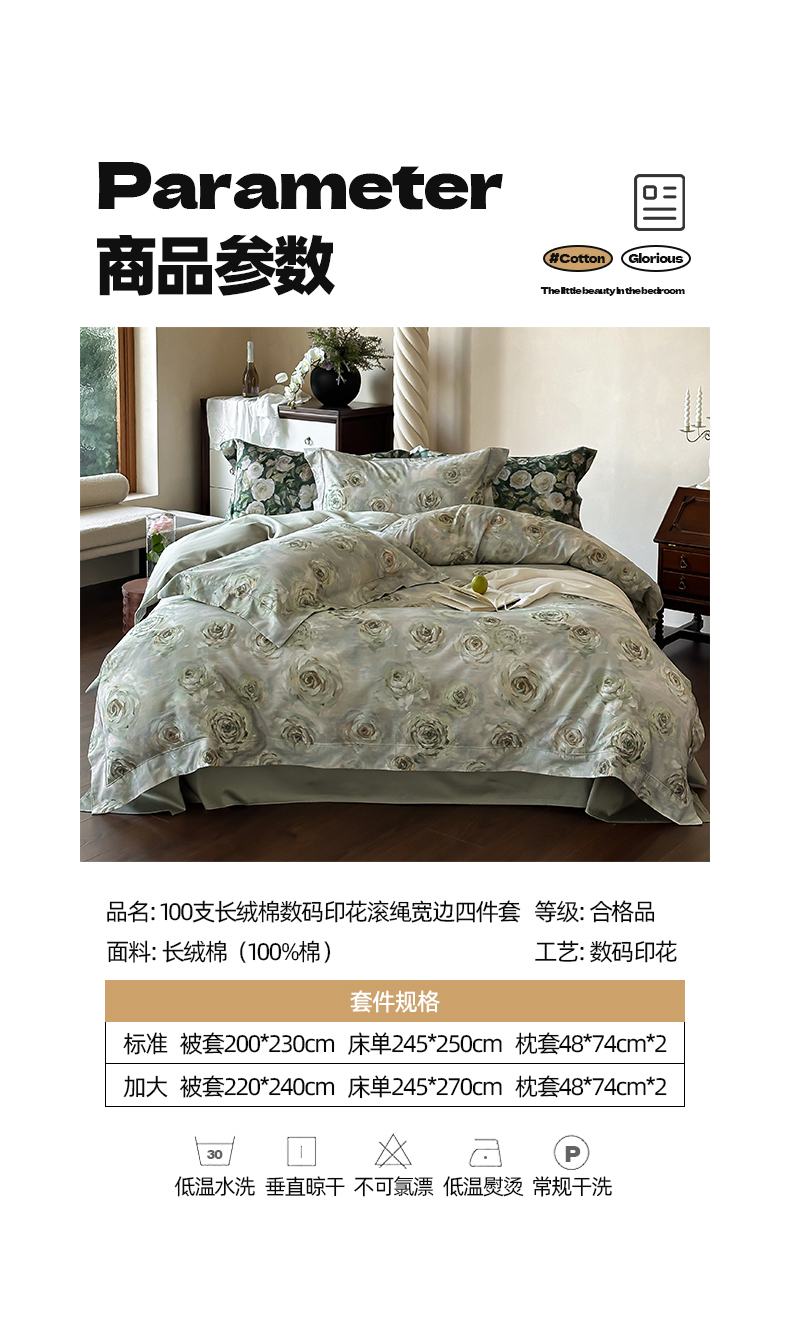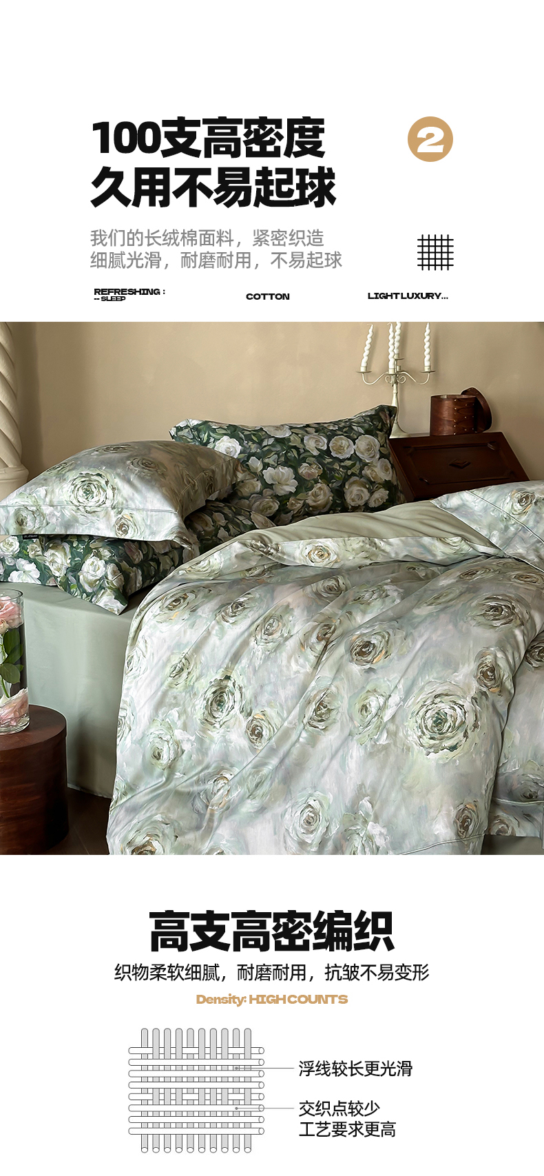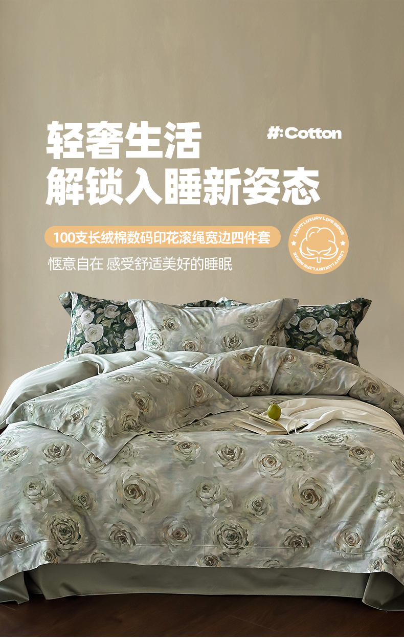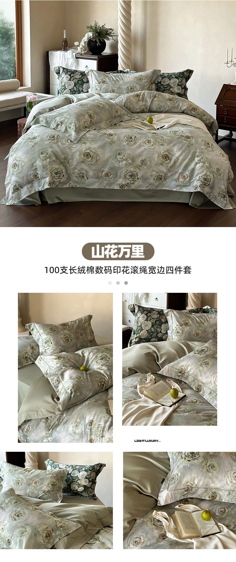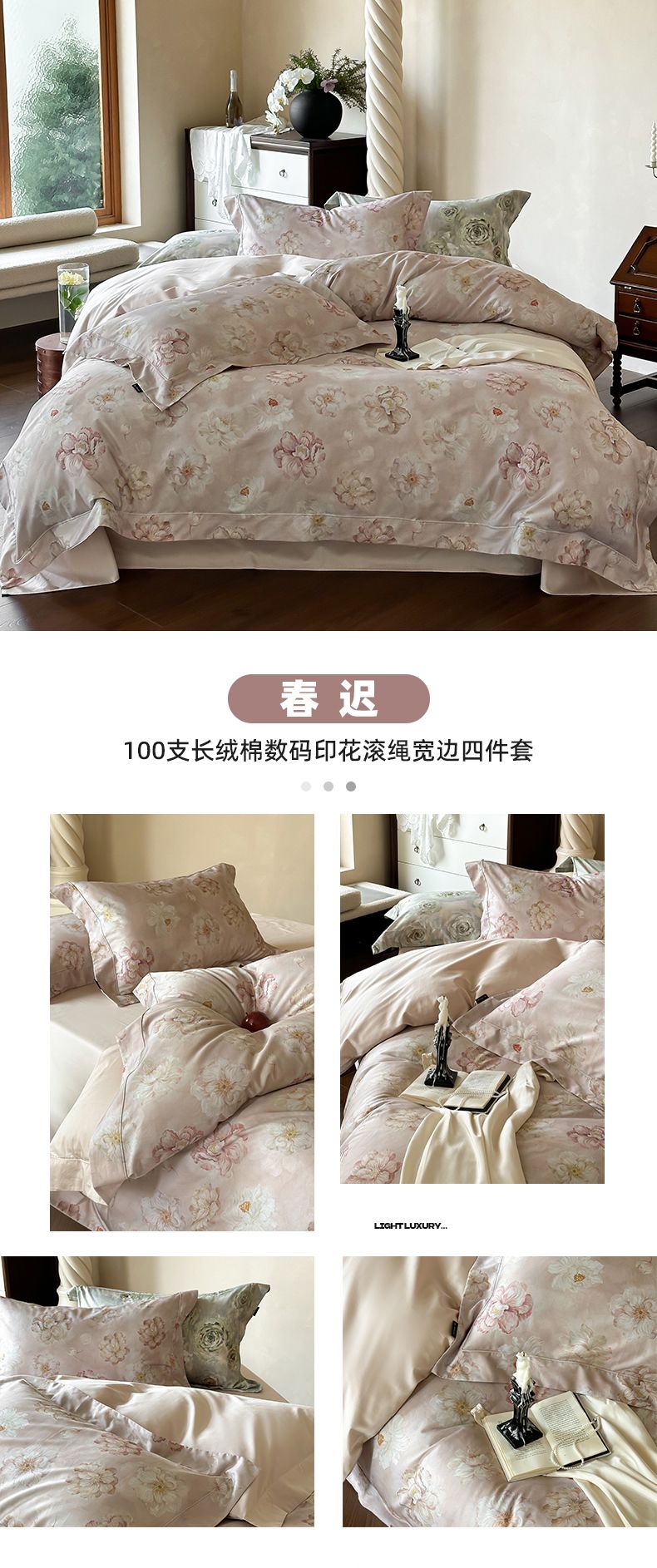 (总)窝米 2025新款数码印花100支长绒棉纯棉滚绳宽边工艺四件套,春迟,山花万里