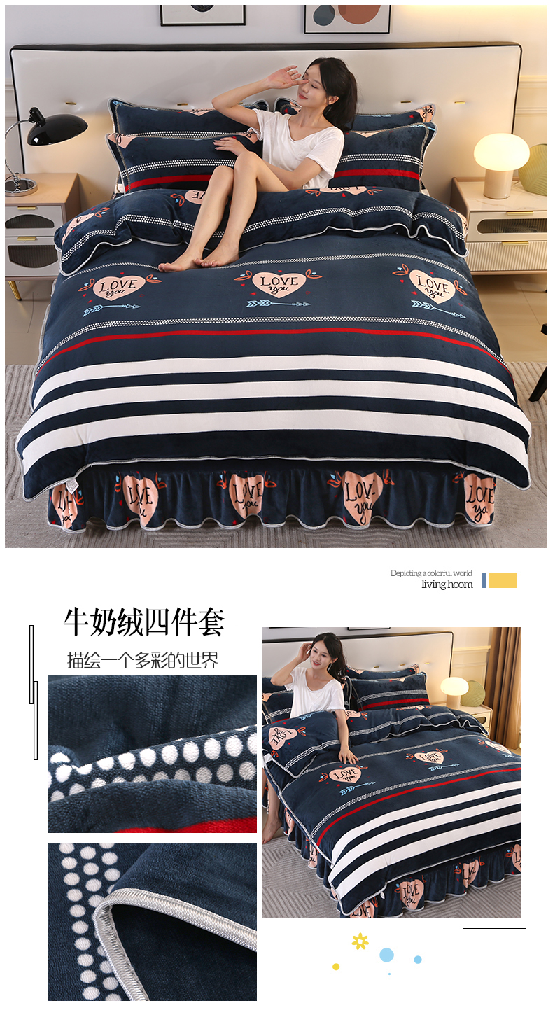 代芙家纺 7斤重牛奶绒金貂四件套抗静电法莱绒珊瑚绒床裙 爱心箭