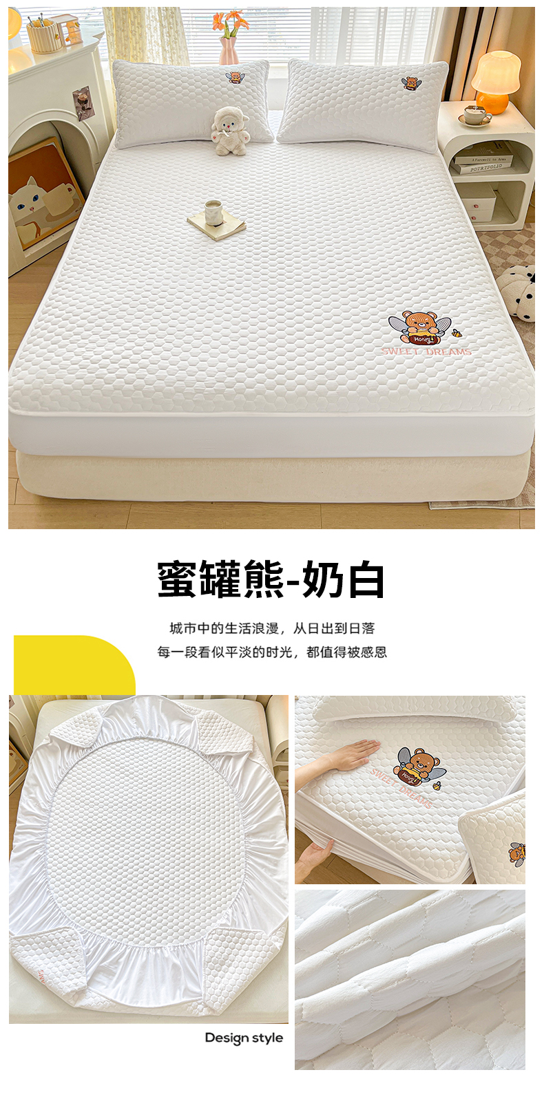 • 91家纺网 家纺一手货源 找家纺 九亭家纺 2024新款A类大豆刺绣夹棉床笠 蜜罐熊-奶白