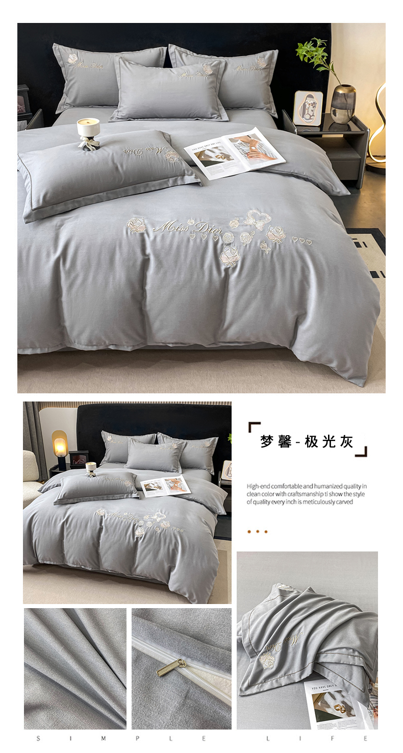 商品名称:昊翔家纺 2025新款全棉磨毛绣花四件套梦馨-极光灰