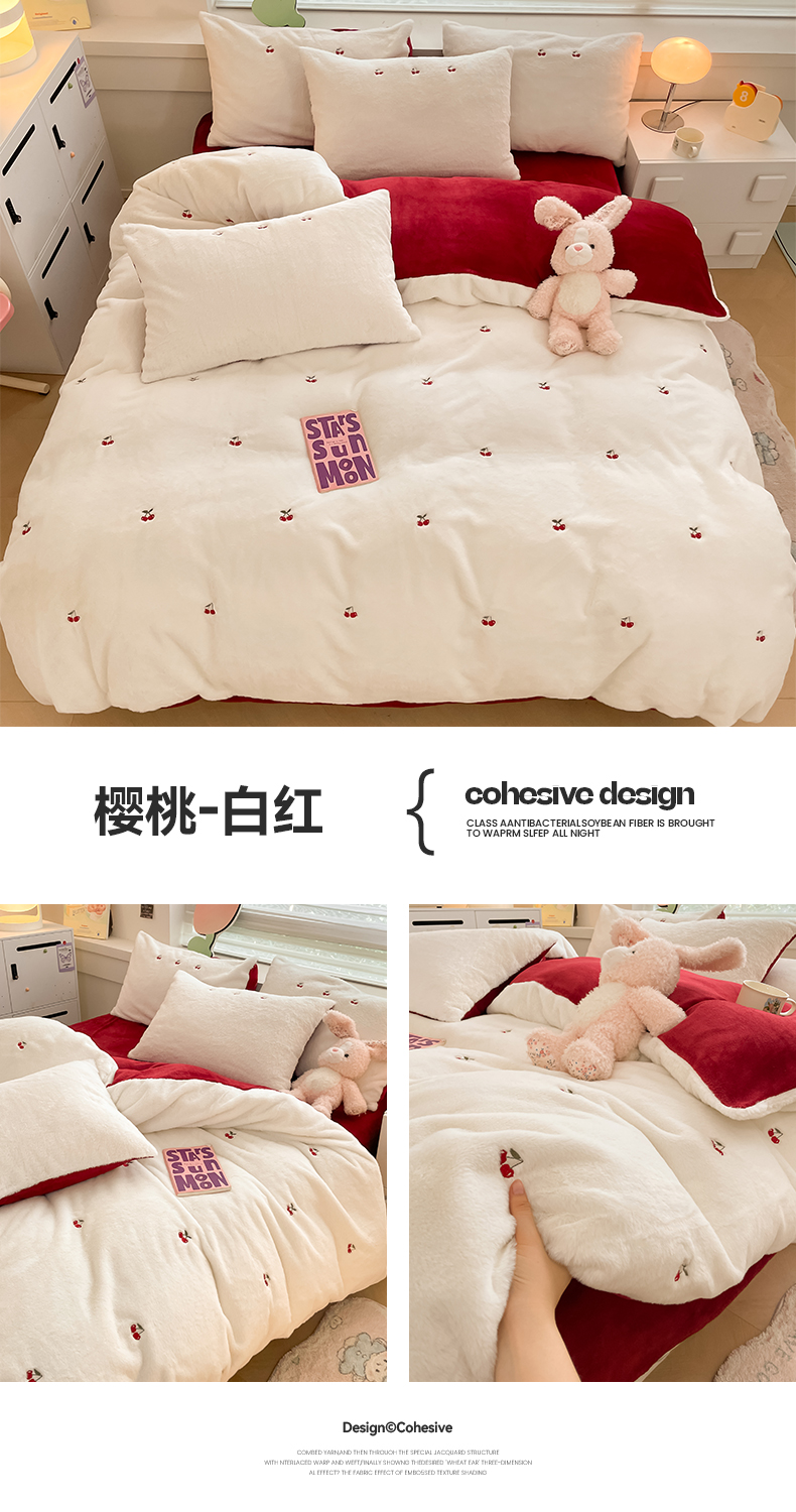 当前位置: 91家纺网 > 商品网购 > 床品套件 > 四件套 > 牛奶绒四件套 > 蜜柚 2024新款牛奶绒兔毛绒高克重小清新满版绣花四件套 樱桃红