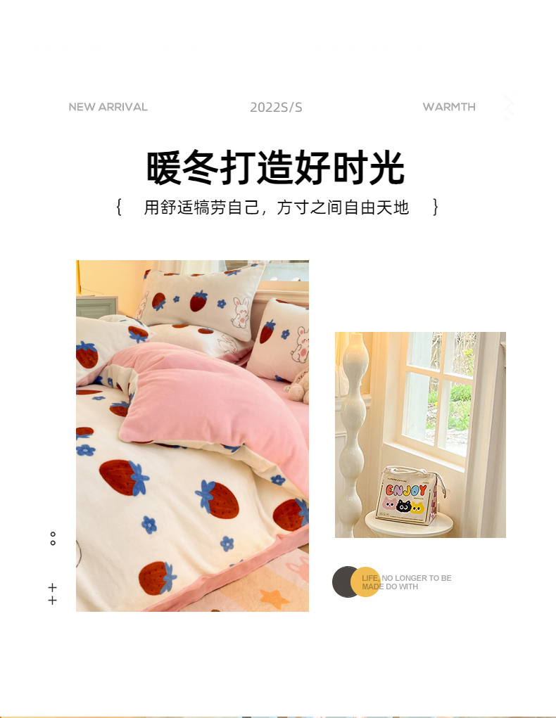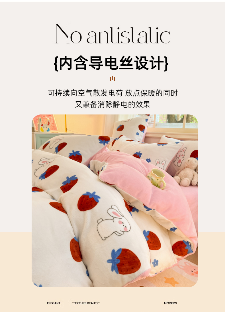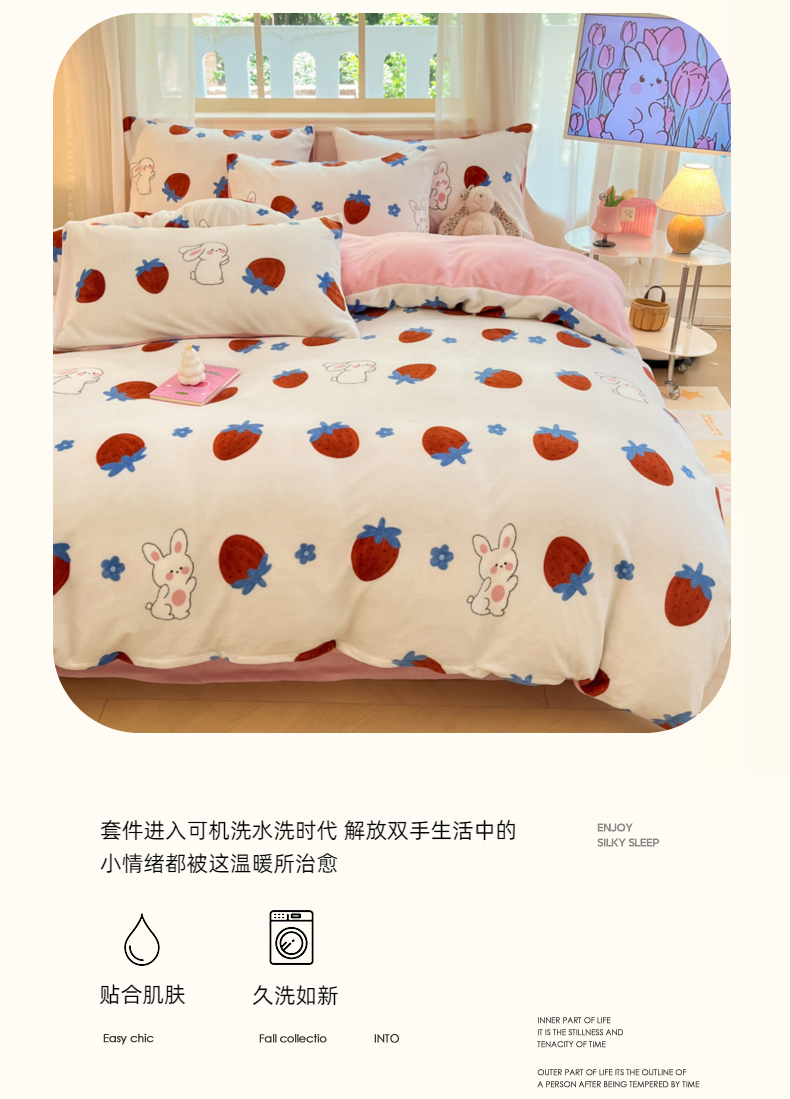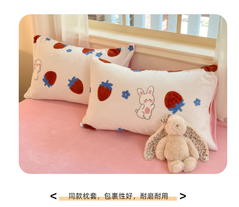 商品名称:卡派 2024新款冬季亲肤透气牛奶绒印花四件套 草莓兔