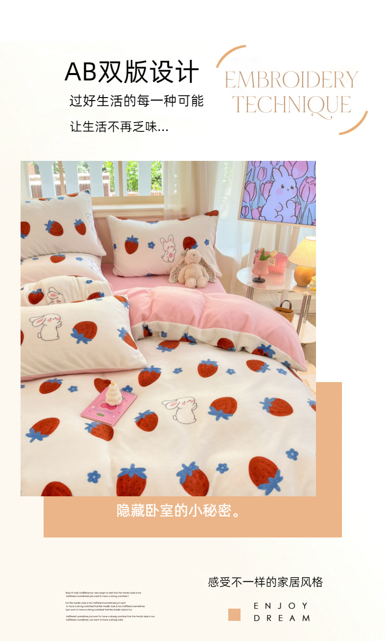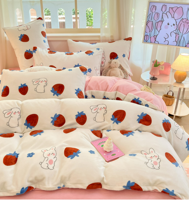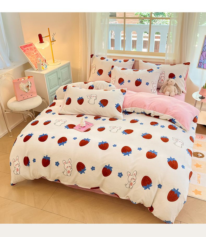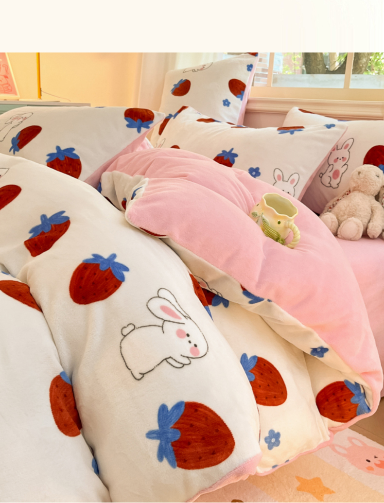 卡派 2024新款冬季亲肤透气牛奶绒印花四件套 草莓兔