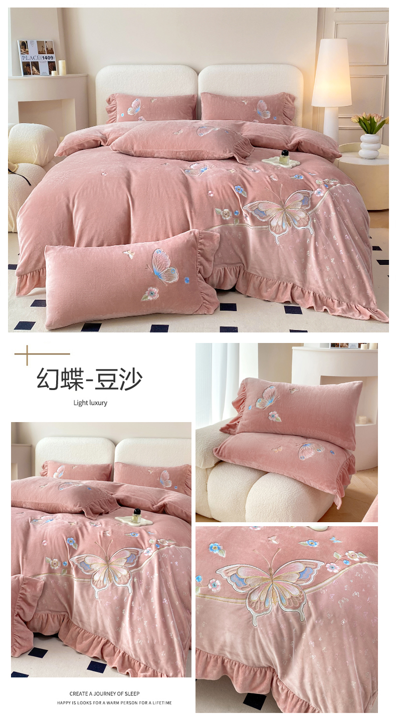 航途席业 2025新款高克重牛奶绒刺绣四件套-梦幻蝶舞 梦幻蝶舞-肉粉