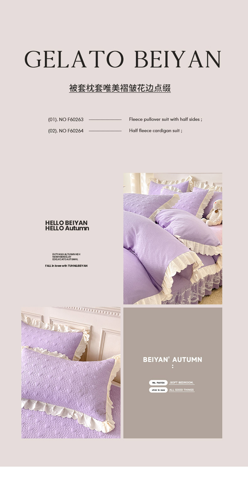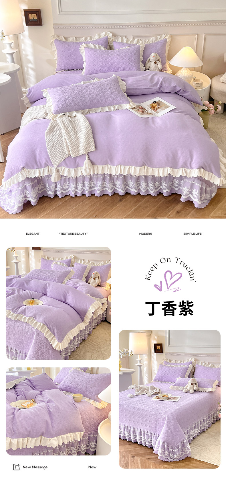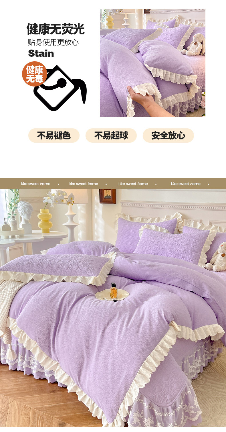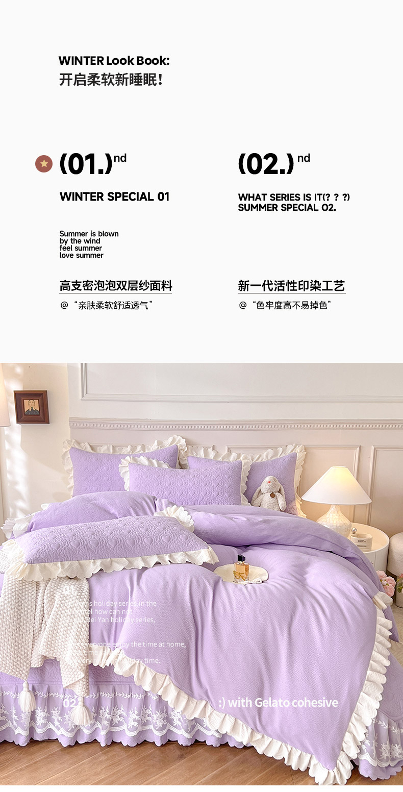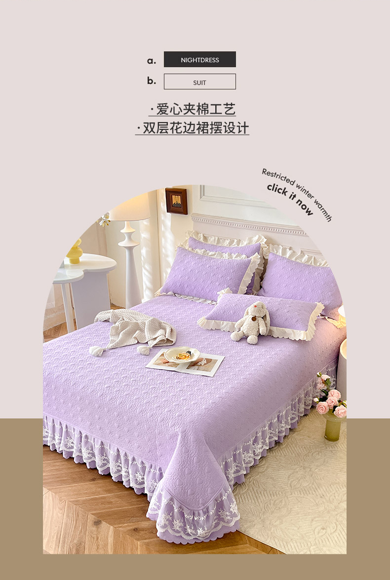 当前位置: 91家纺网 > 商品网购 > 床品套件 > 四件套 > 其它四件套 > 绒世界 2024新款秋冬泡泡双层纱夹棉床盖四件套 丁香紫