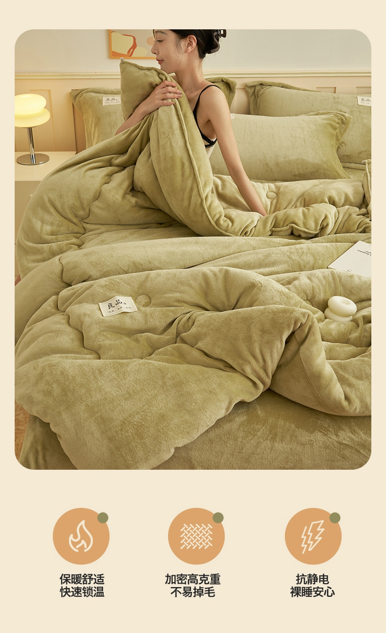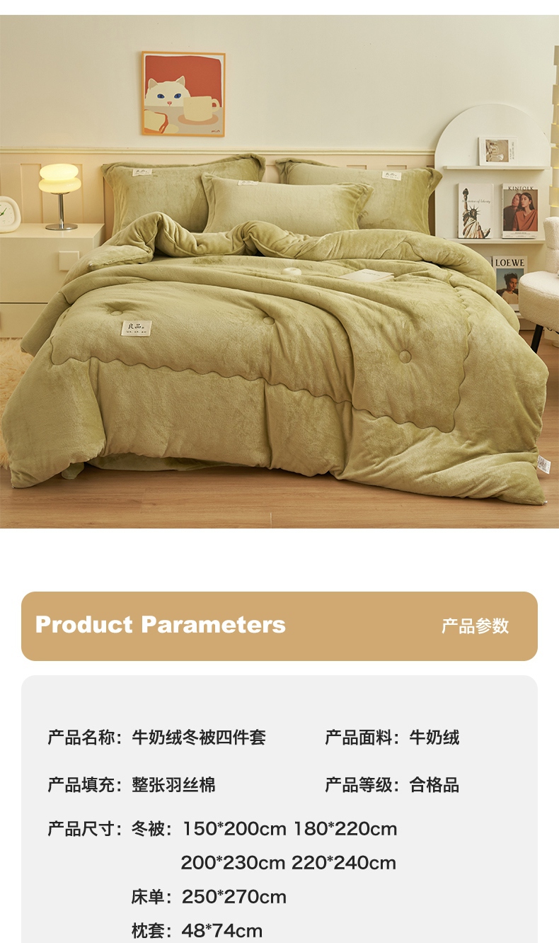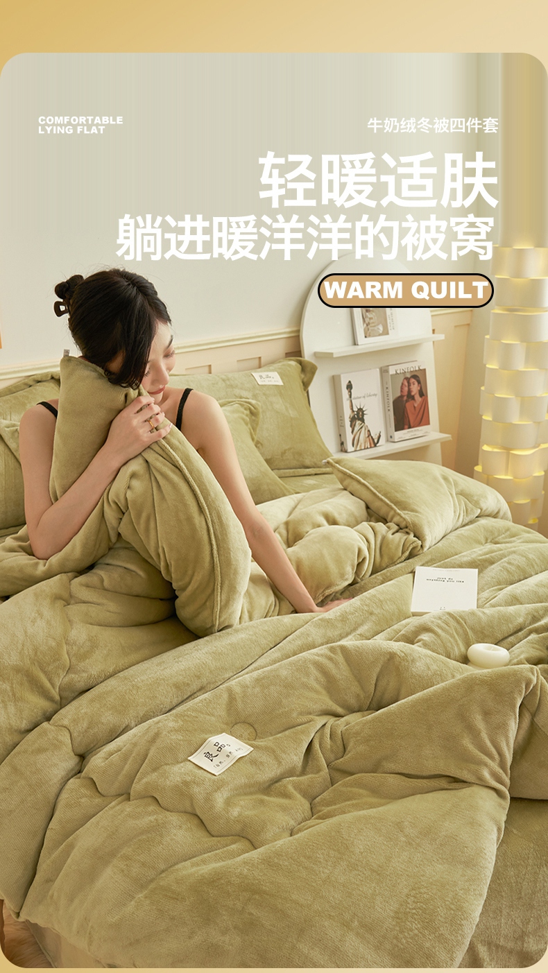 • 91家纺网 家纺一手货源 找家纺 2024新款保暖舒适牛奶绒冬被四件套 果绿