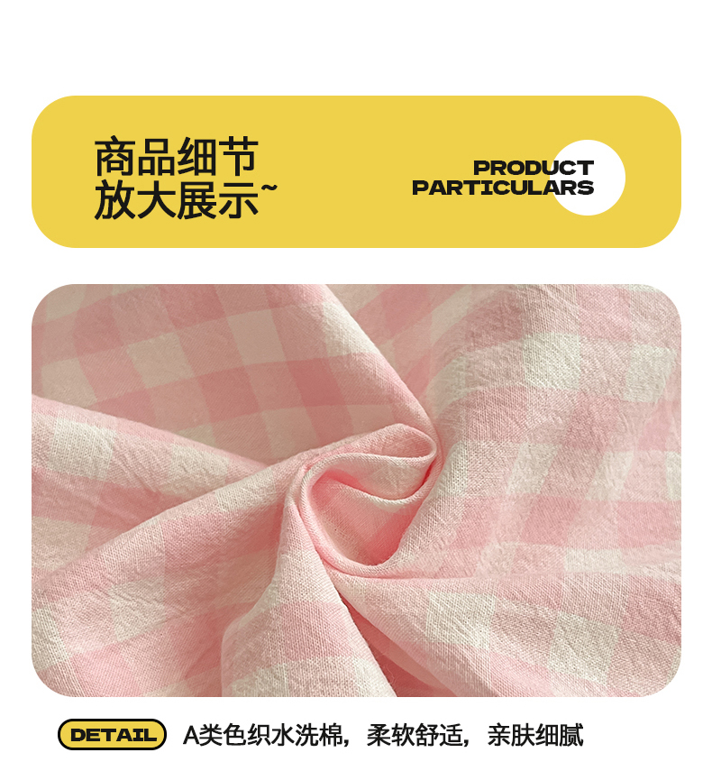 • 91家纺网 家纺一手货源 找家纺 桃子 2024新款ins纯棉色织水洗毛巾绣大眼仔单床单 色织水洗棉-大眼仔粉格