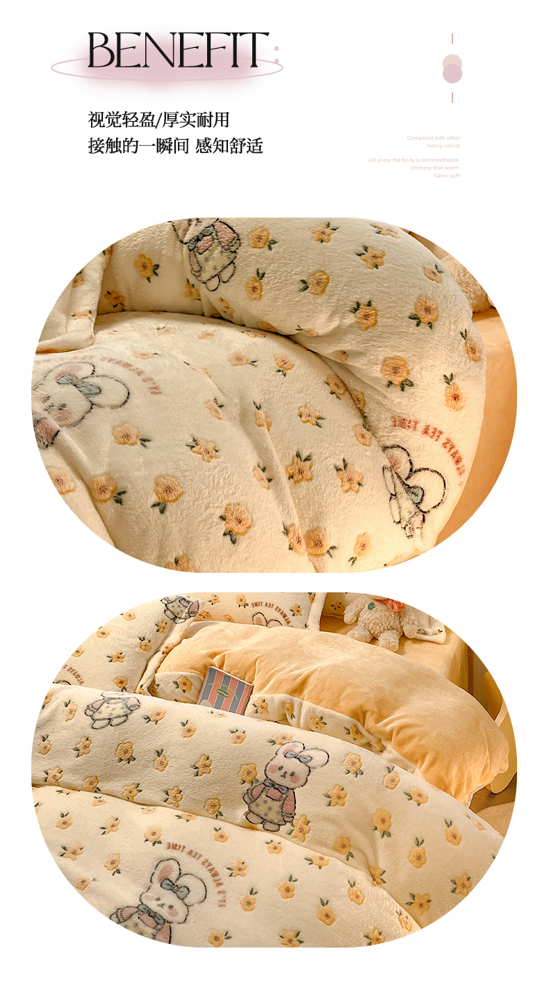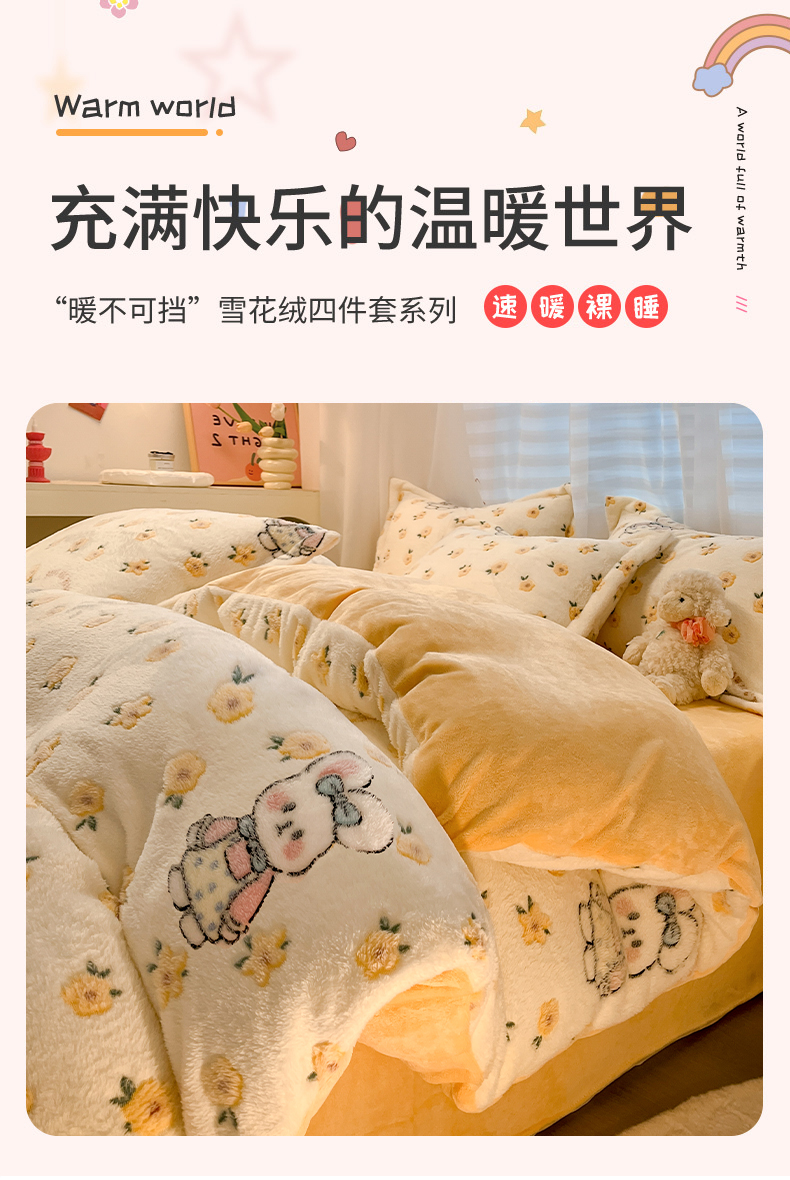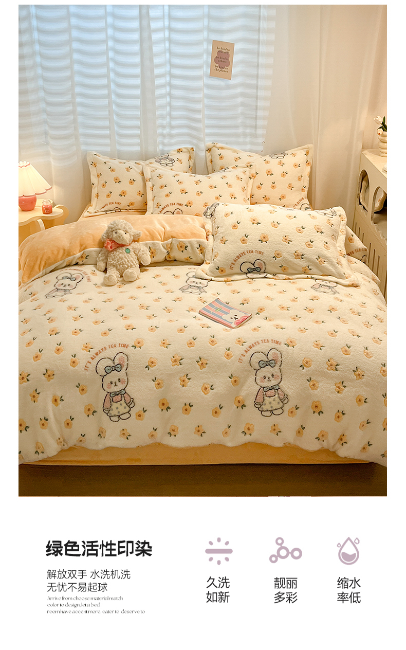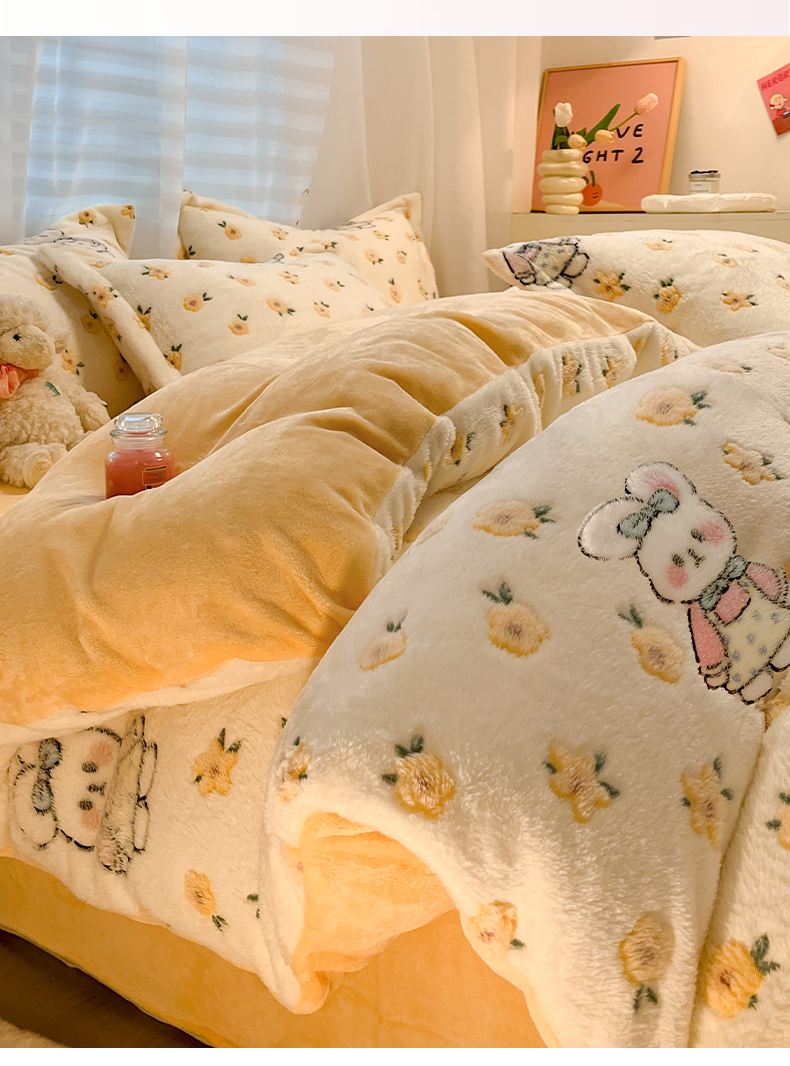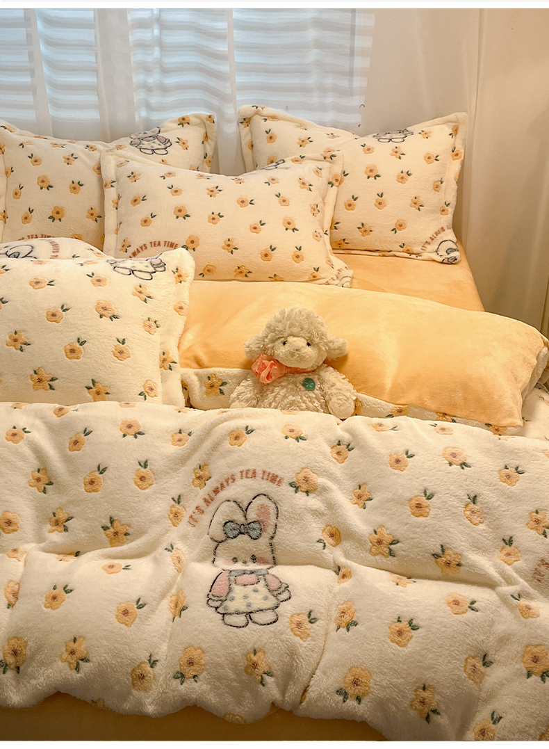当前位置: 91家纺网 > 商品网购 > 床品套件 > 四件套 > 其它四件套 > 韩巢家纺 2024新款加厚雪花绒印花四件套-风格一(提供卖家秀) 田园兔(黄)