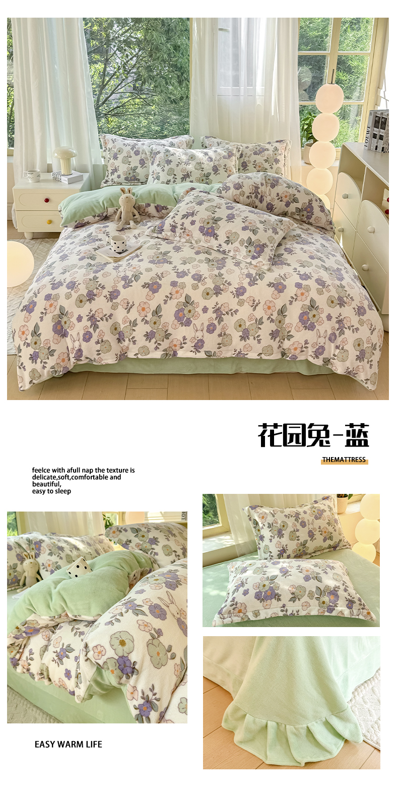 富之航家纺 2024新款高克重小清新牛奶绒四件套 花园兔-蓝