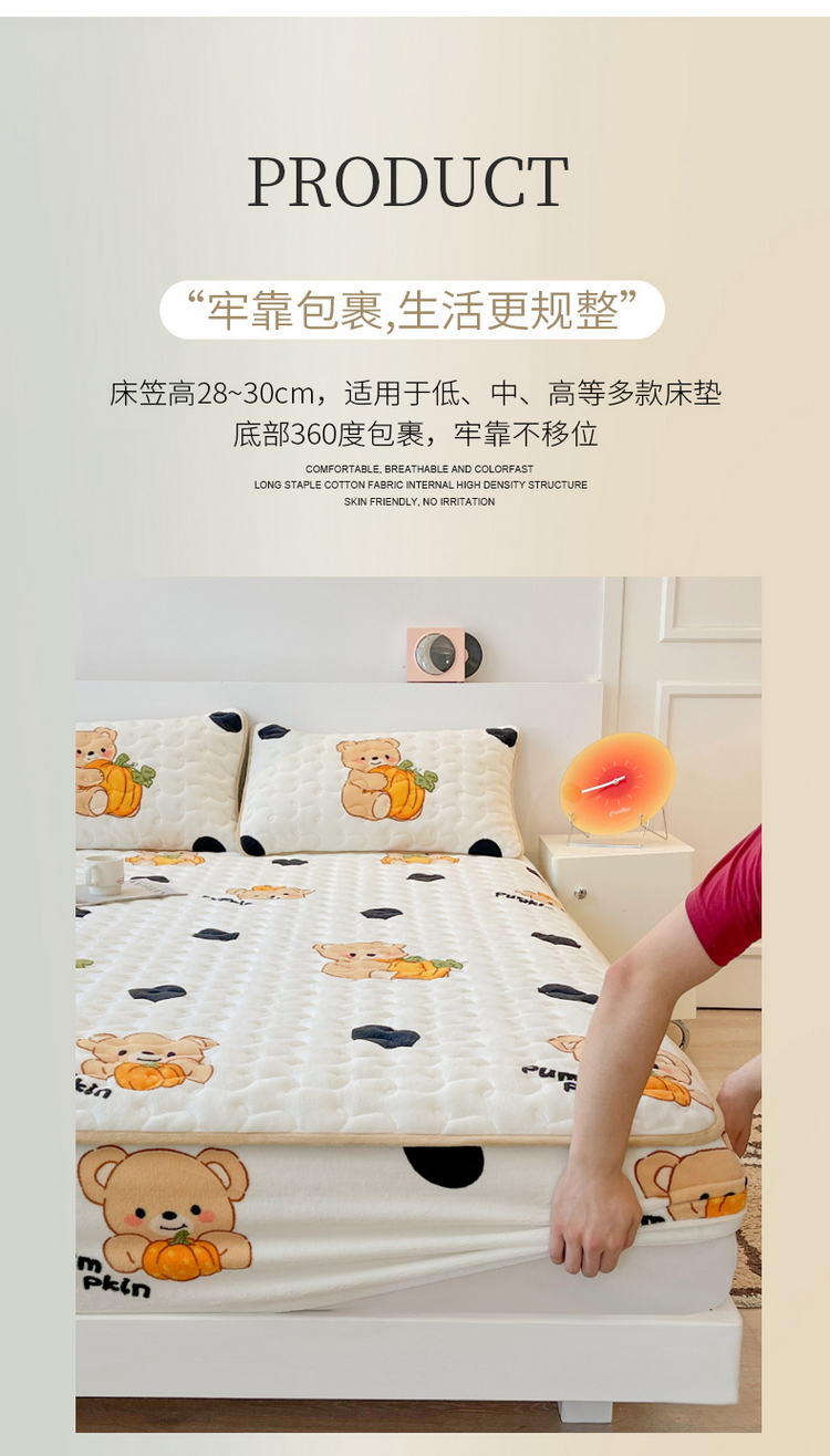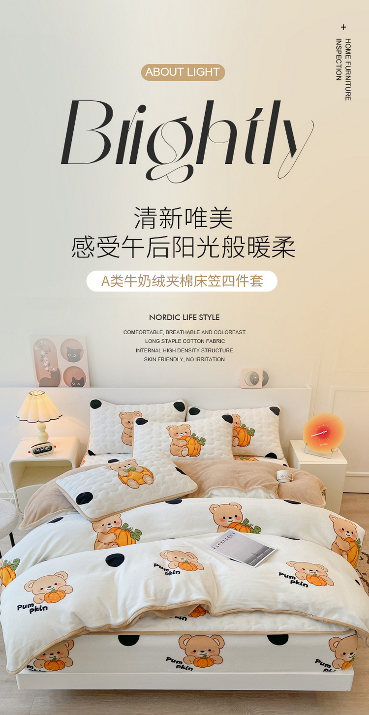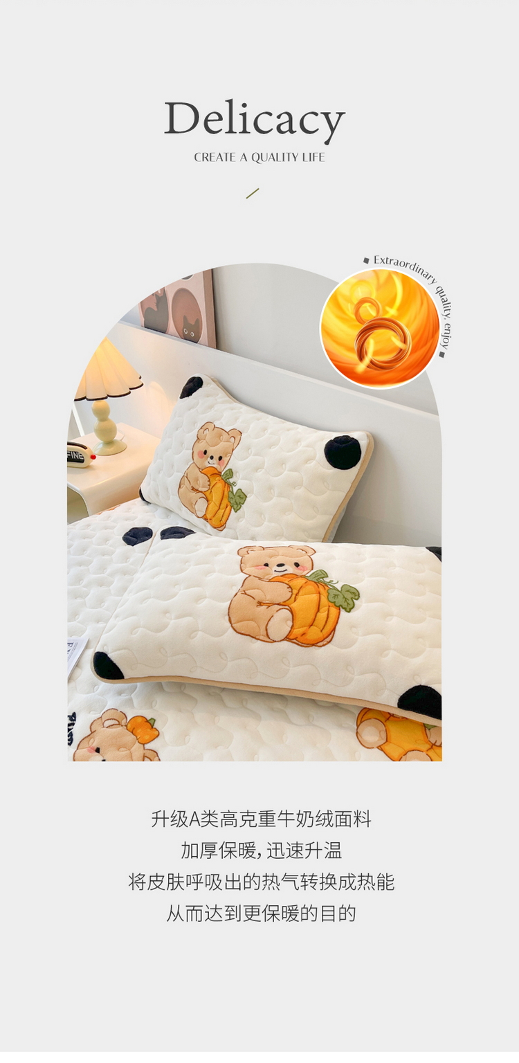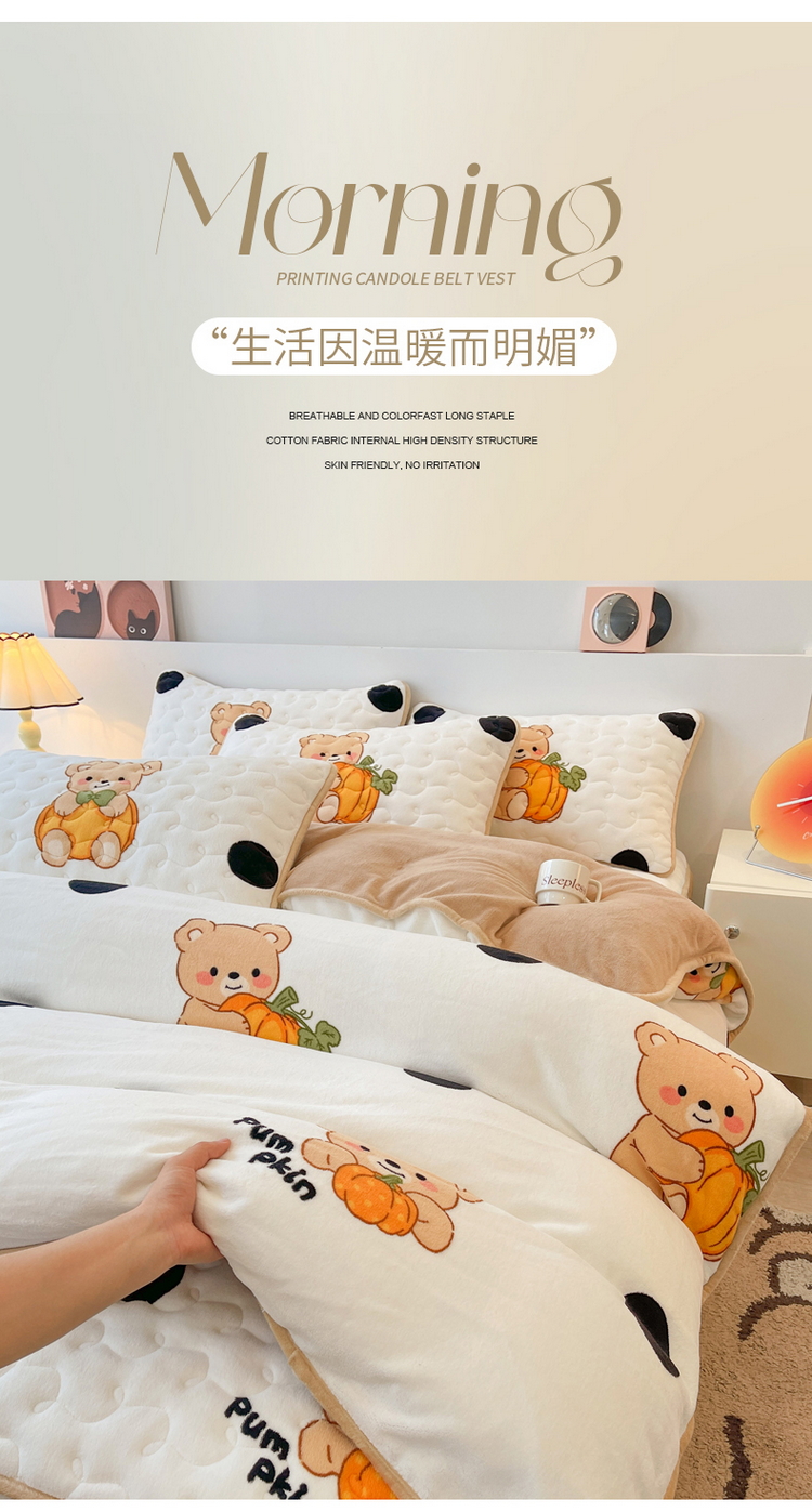2024秋冬A类牛奶绒加厚夹棉床笠+牛奶绒被套四件套波点熊