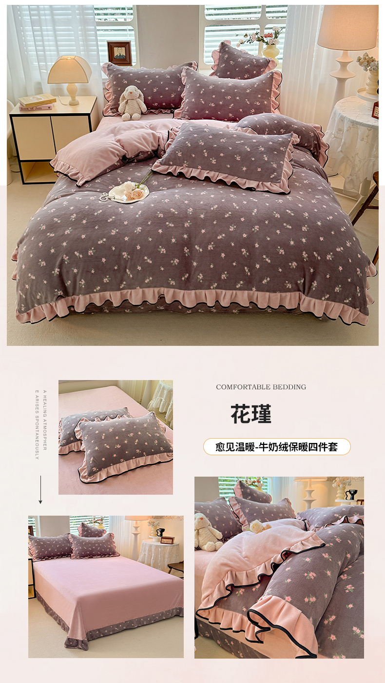 商品名称:韩约家纺 2024新款牛奶绒花边款印花四件套 花瑾