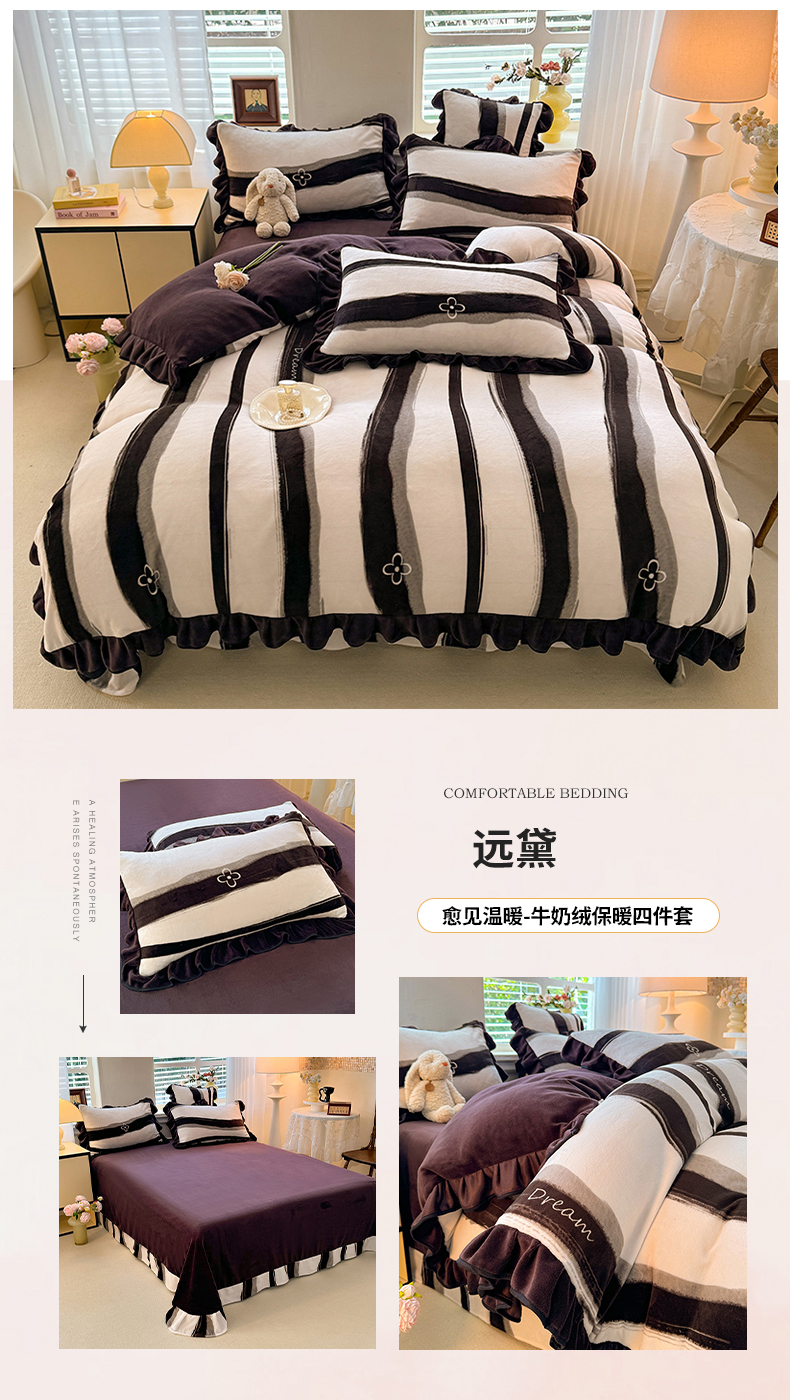 韩约家纺 2024新款牛奶绒花边款印花四件套 远黛