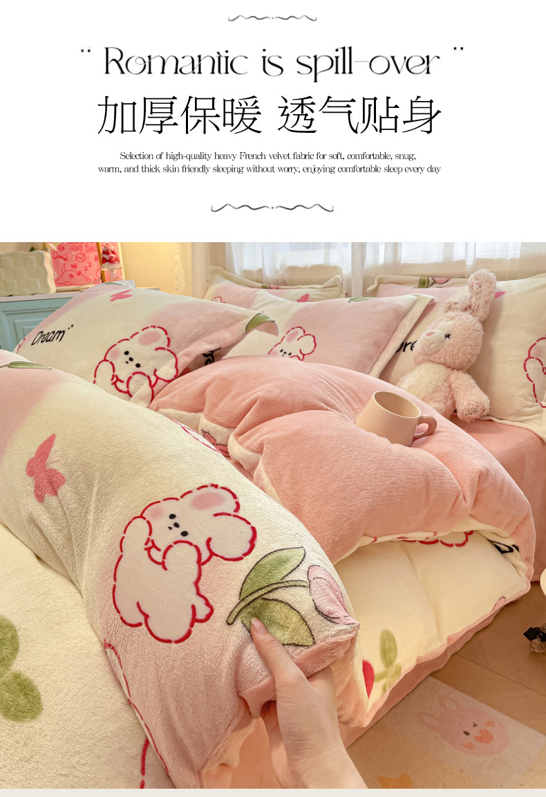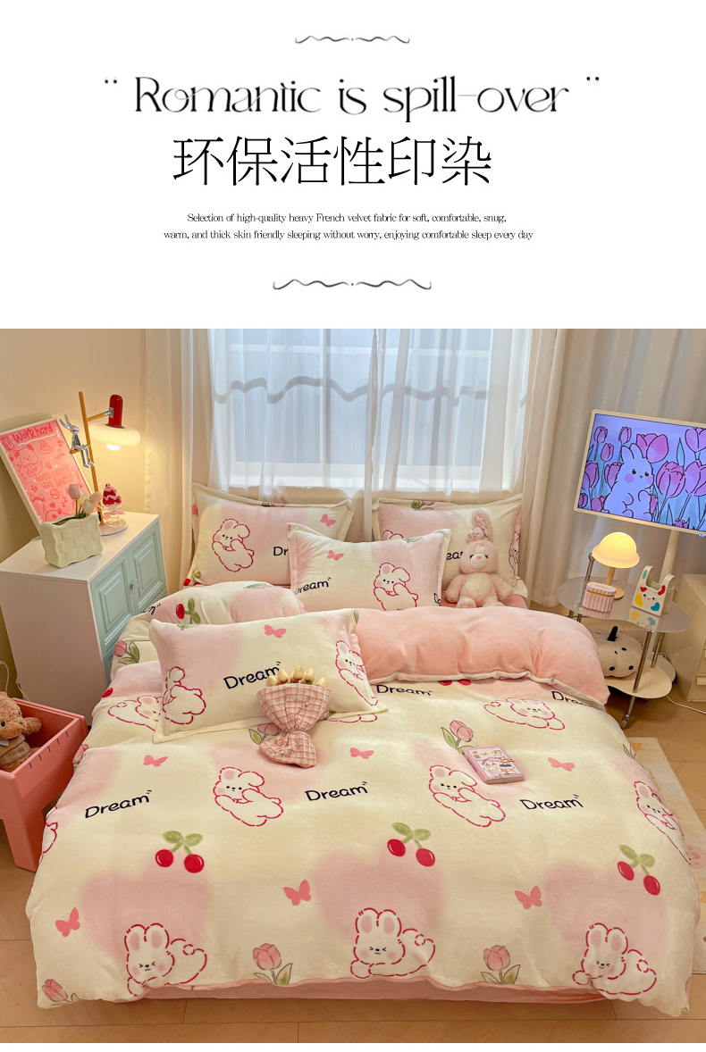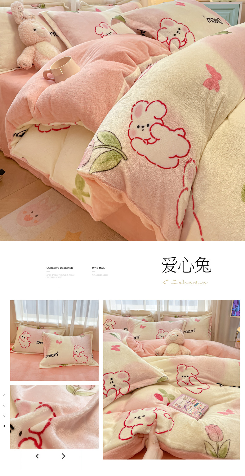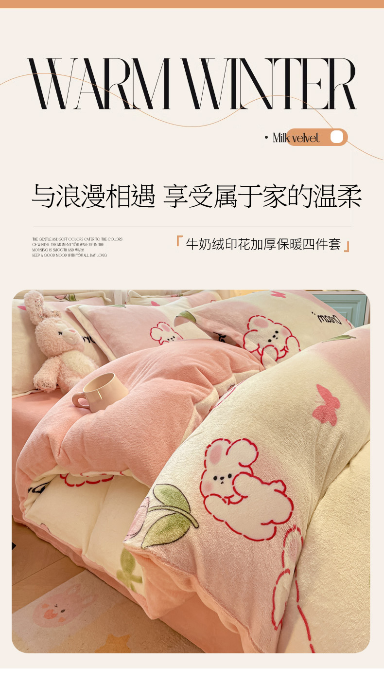 当前位置: 91家纺网 > 商品网购 > 床品套件 > 四件套 > 牛奶绒四件套 > 柒月 2024新款小清新牛奶绒印花加厚保暖四件套 爱心兔