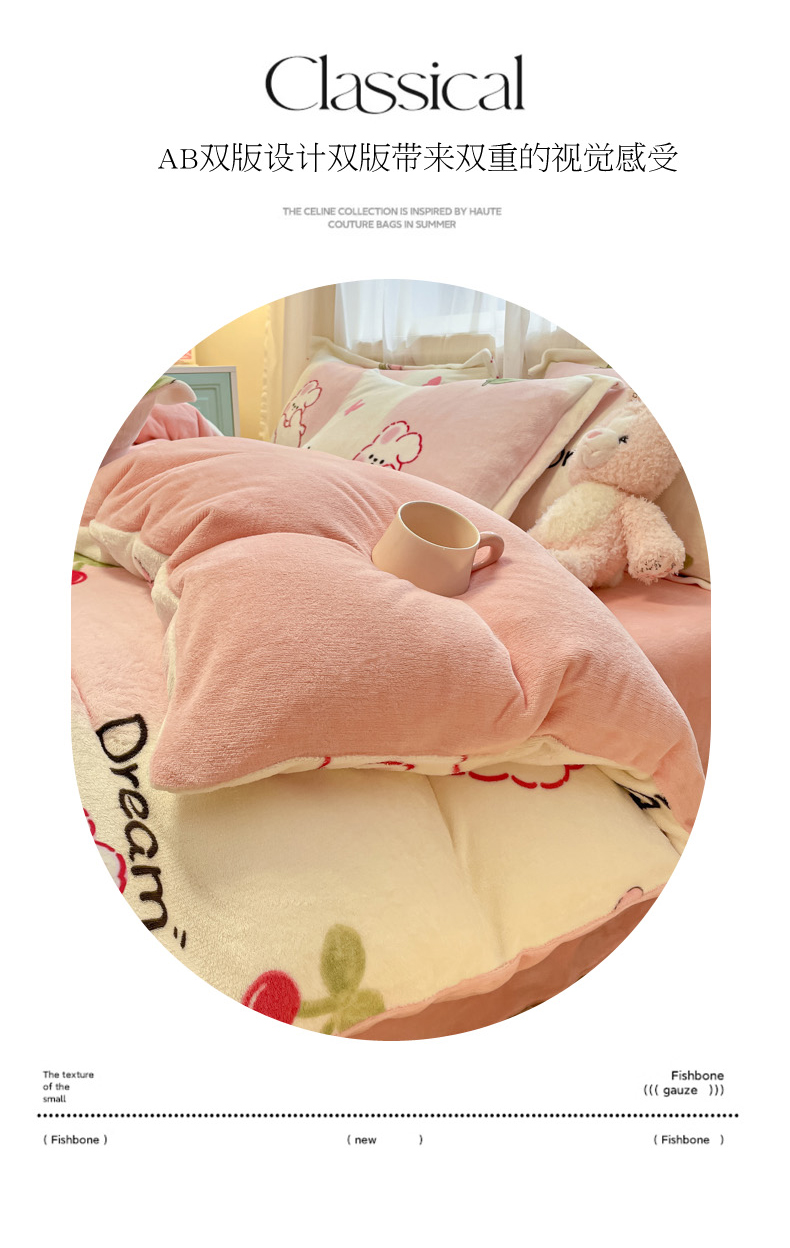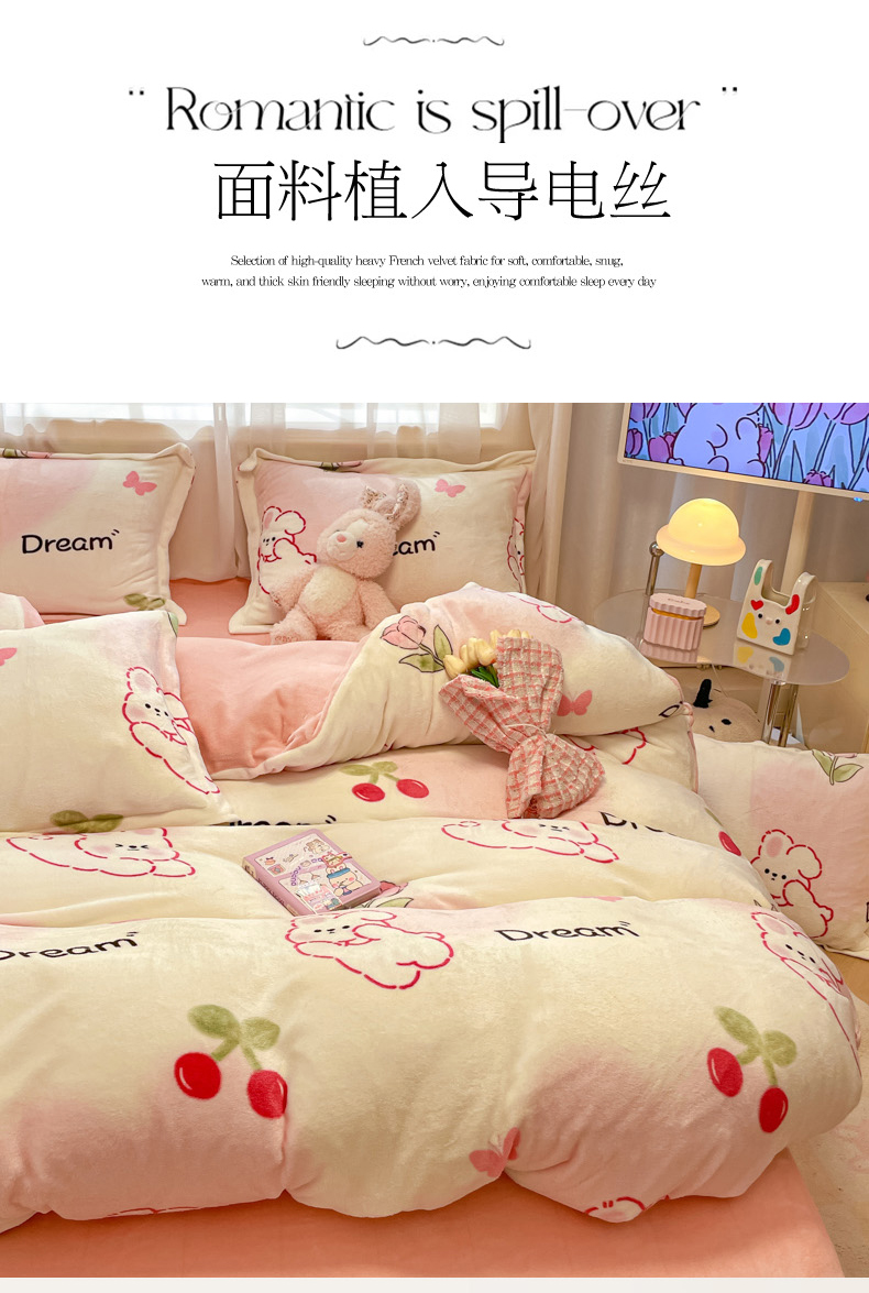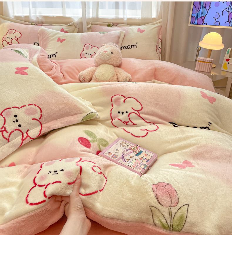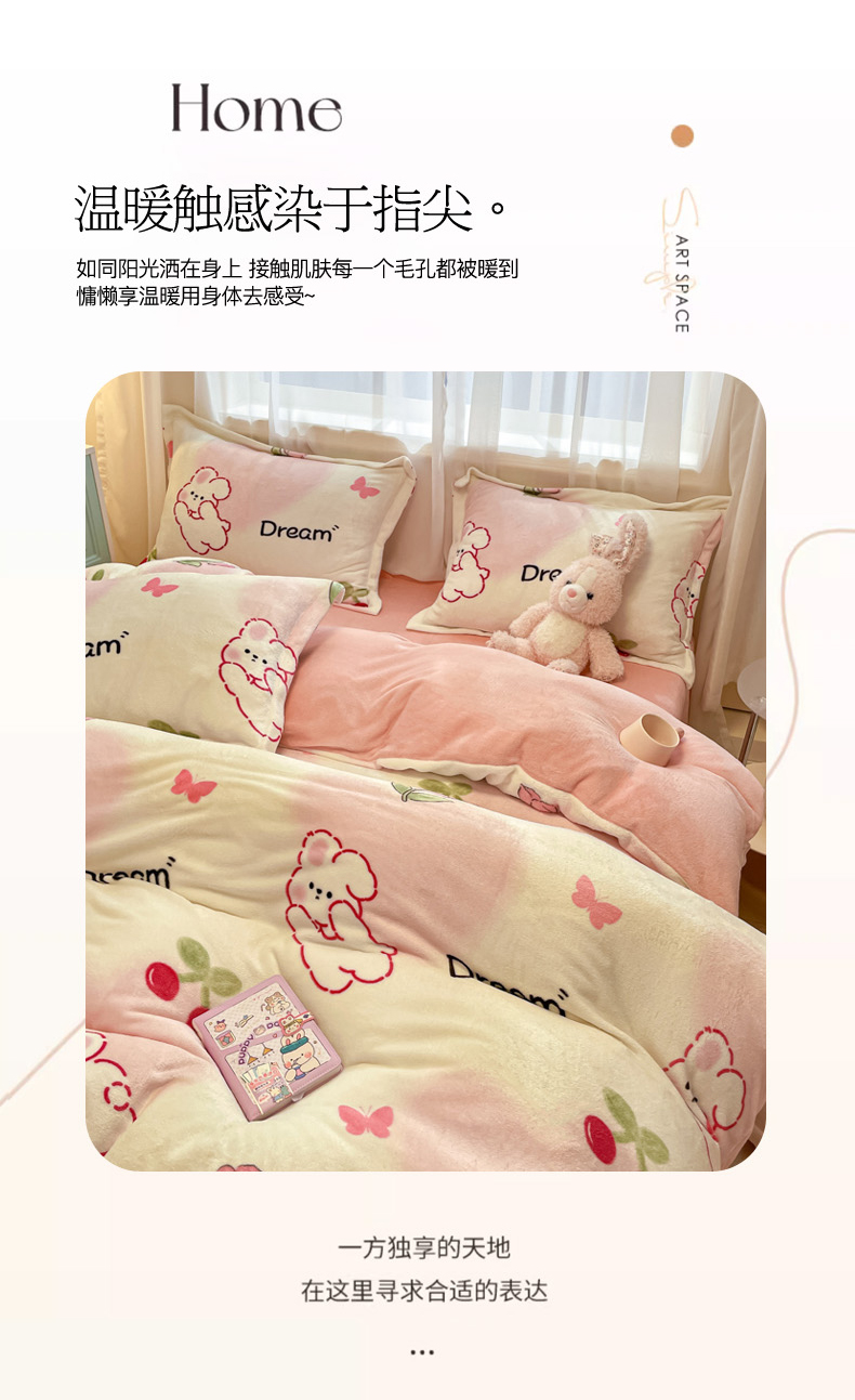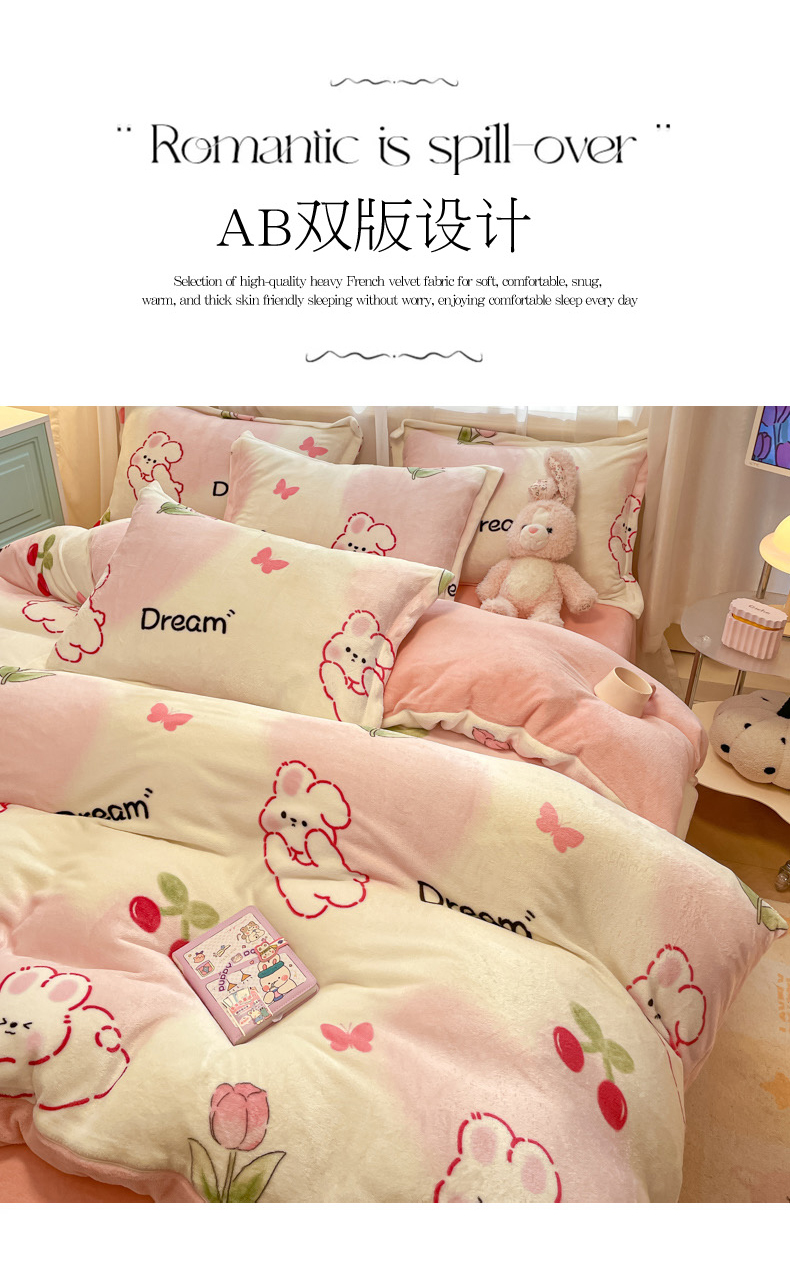 当前位置: 91家纺网 > 商品网购 > 床品套件 > 四件套 > 牛奶绒四件套 > 柒月 2024新款小清新牛奶绒印花加厚保暖四件套 爱心兔