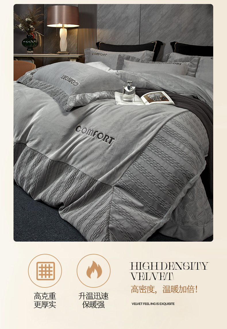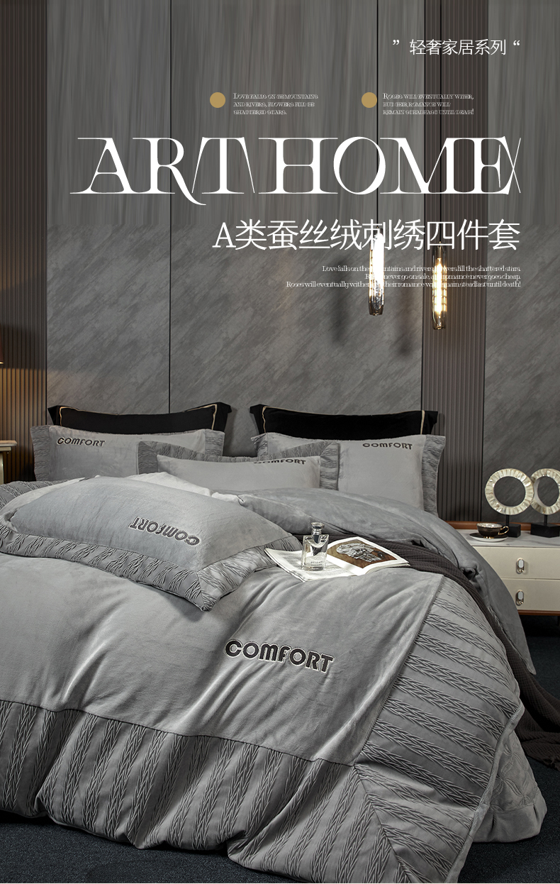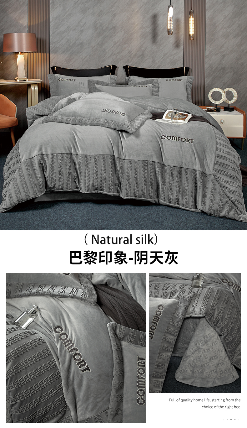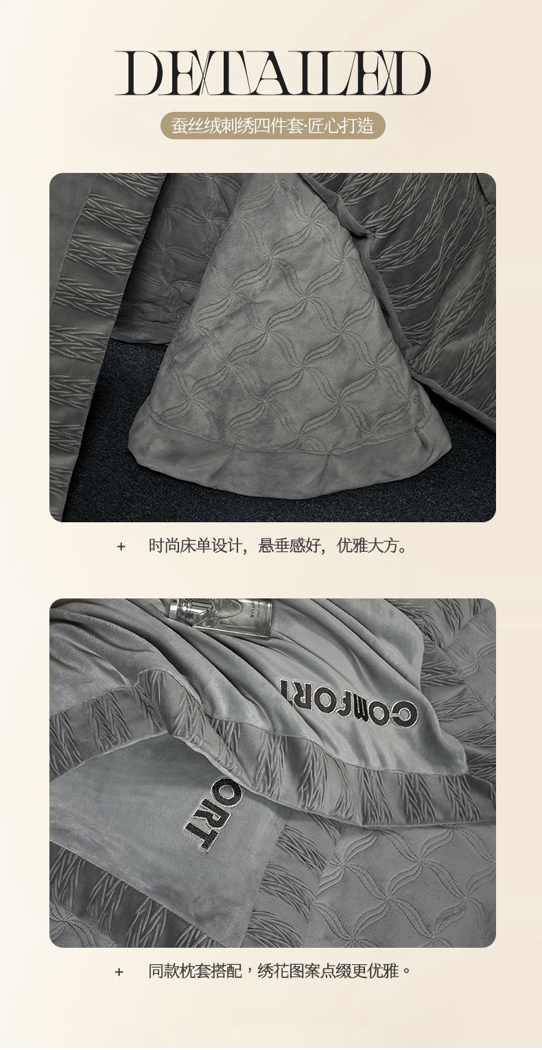 商品名称:2024新款高克重牛奶绒刺绣四件套-巴黎印象 巴黎印象-阴天灰