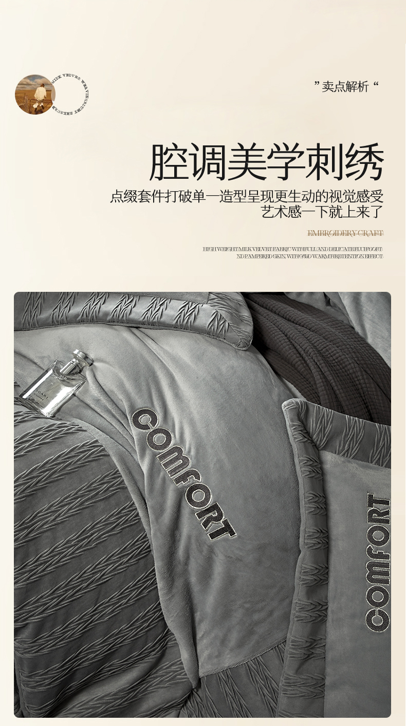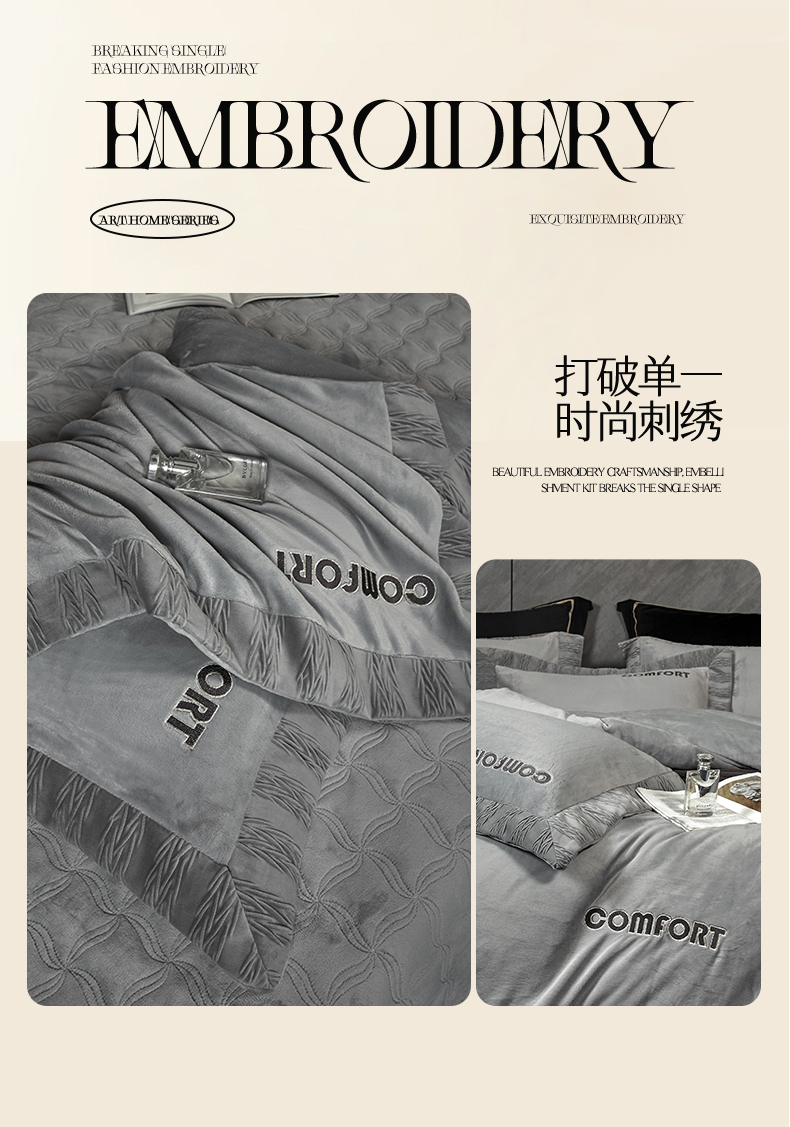 2024新款高克重牛奶绒刺绣四件套-巴黎印象 巴黎印象-阴天灰