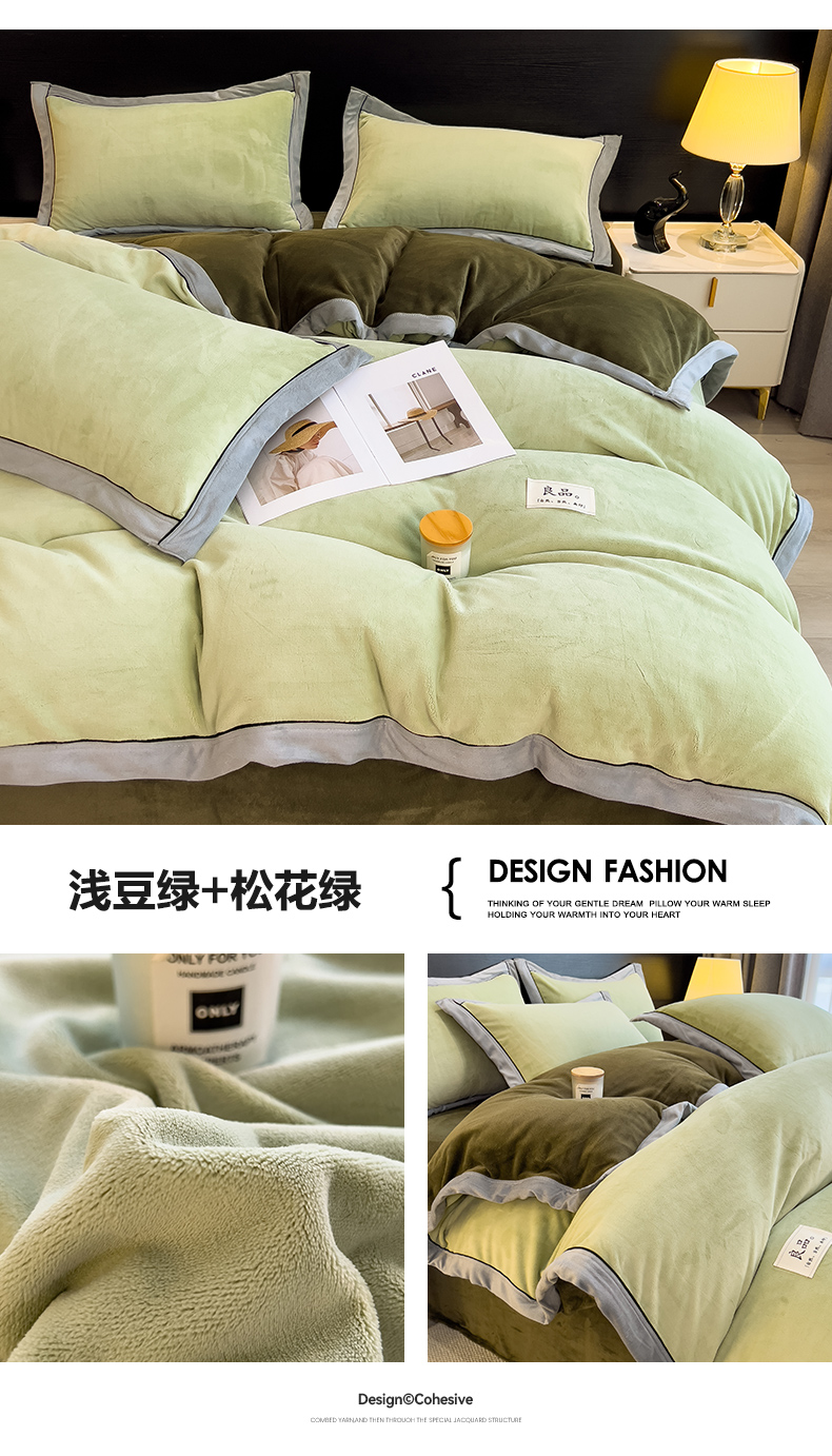 商品名称:孩子王家纺 2024新款高克重牛奶绒双拼宽边四件套 浅豆绿+松花绿