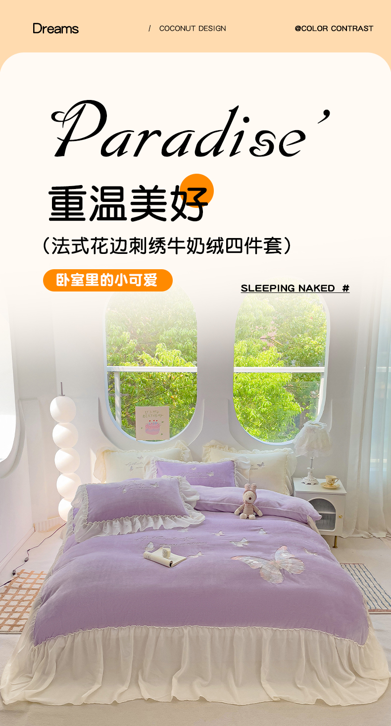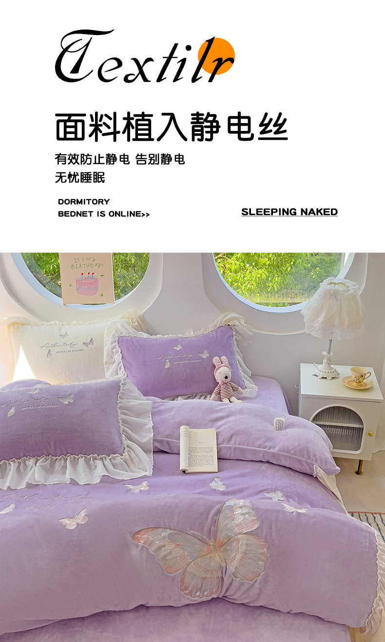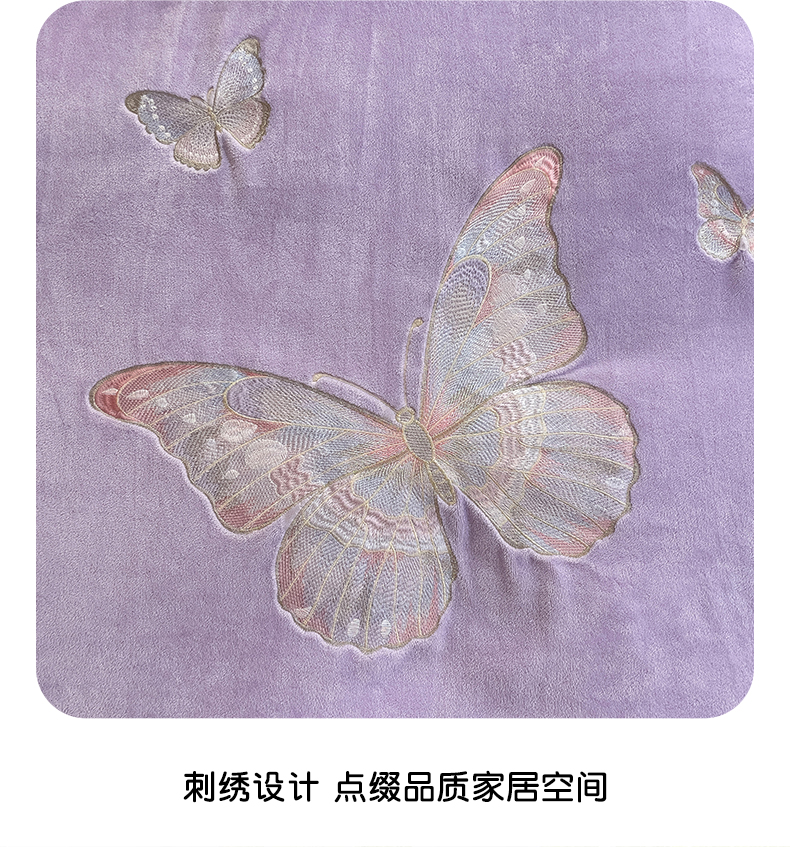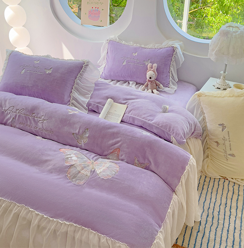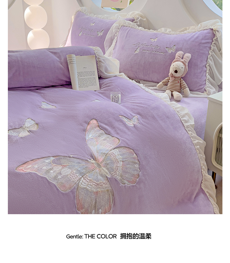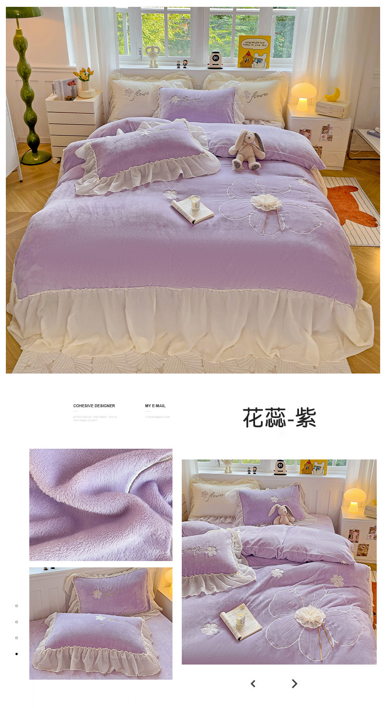 商品名称:娜娜 2024新款法式花边牛奶绒刺绣四件套-花蕊-花香引蝶系列 花香引蝶-紫