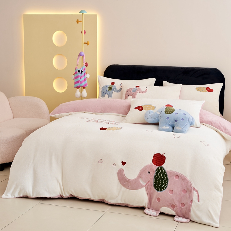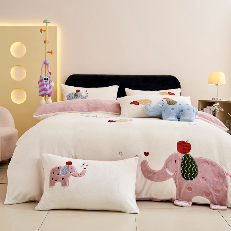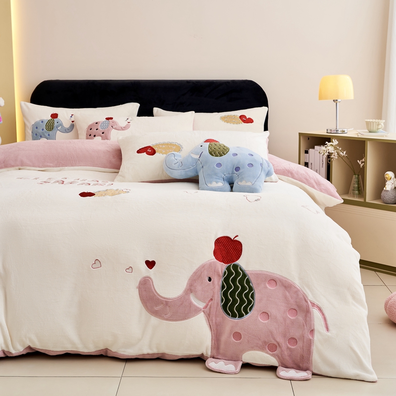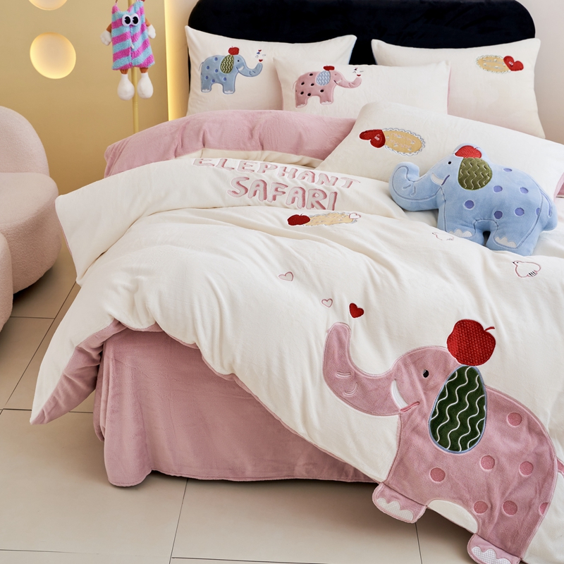 商品名称:黛舒家居 2024新款240克臻棉绒立体贴布绣四件套 顽皮象粉