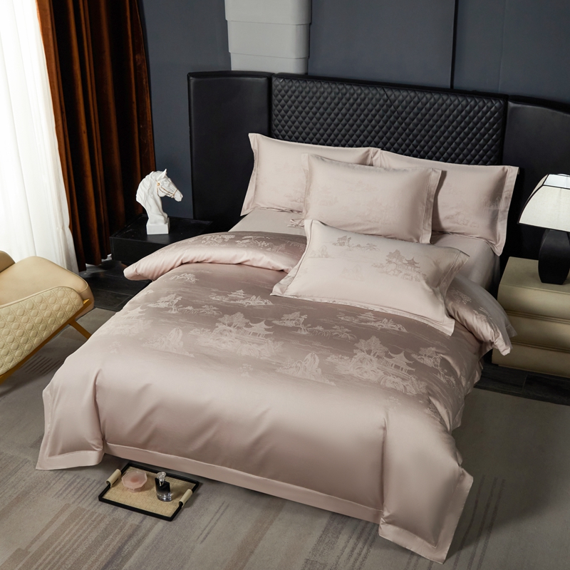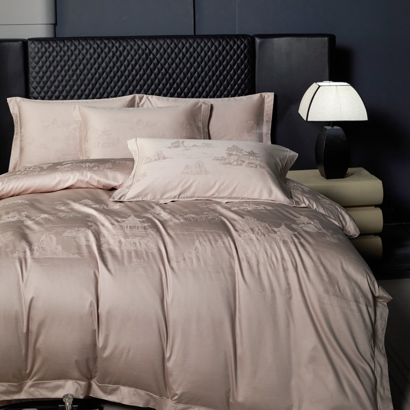 商品名称:淳绵家居 2024新款50*50S双股长绒棉大版定位提花四件套 亭香叶影-香槟色
