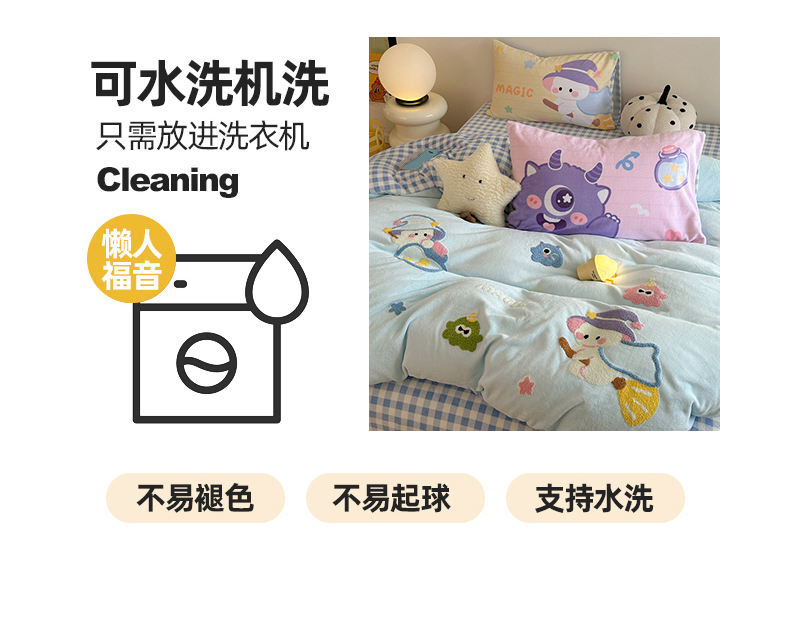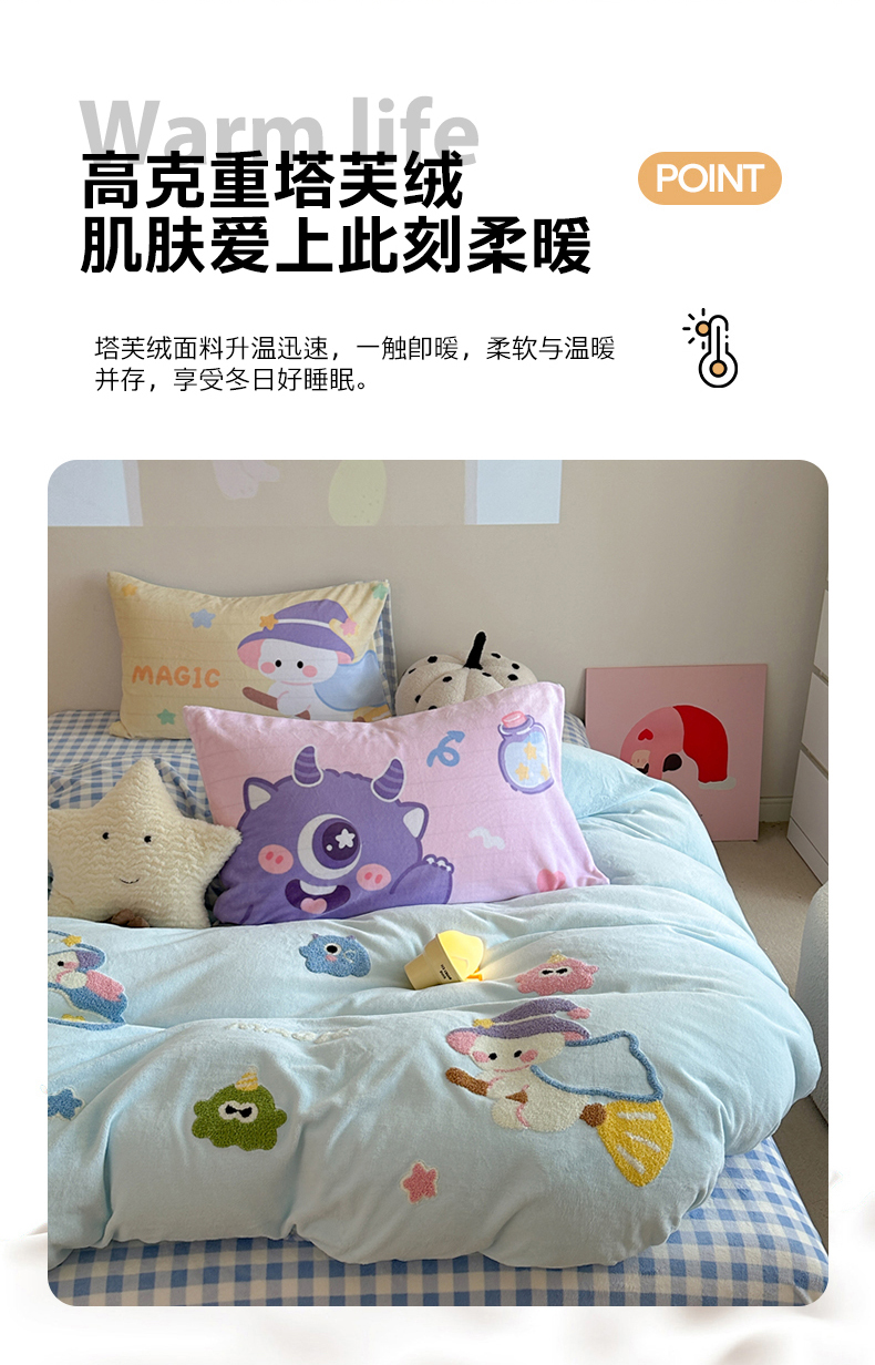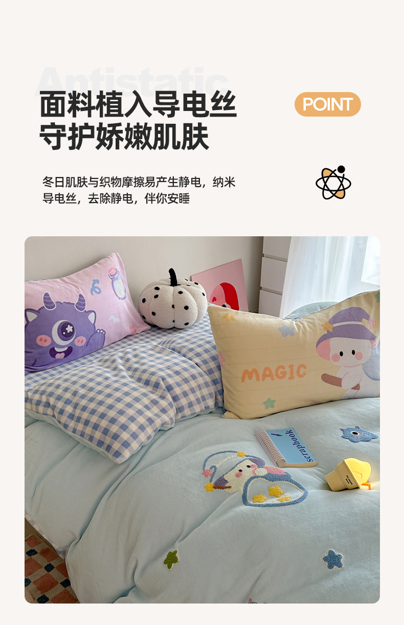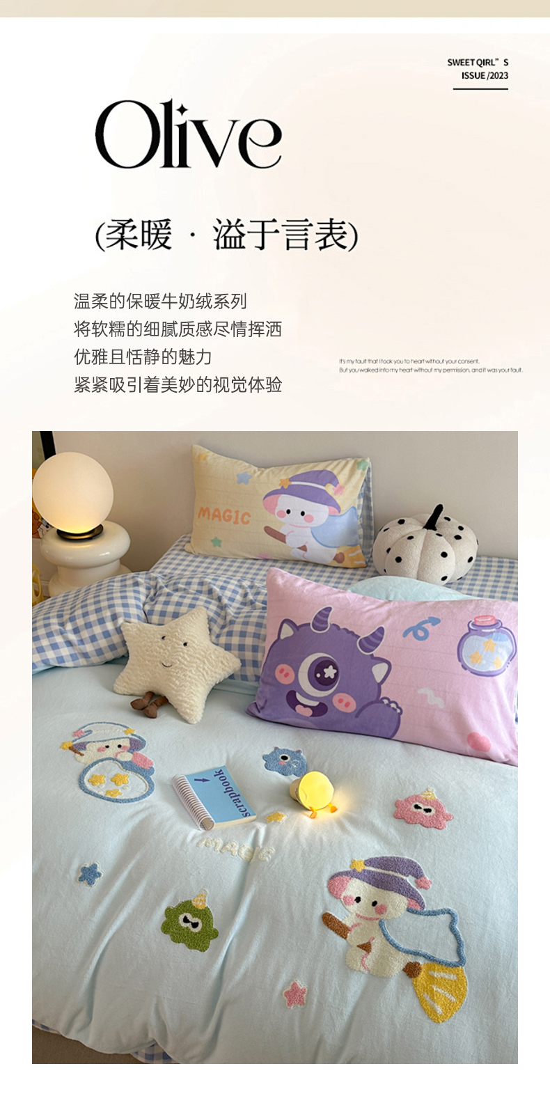 商品名称:眠屿家纺 2024新款牛奶绒毛巾绣四件套 牛奶绒星星魔法师