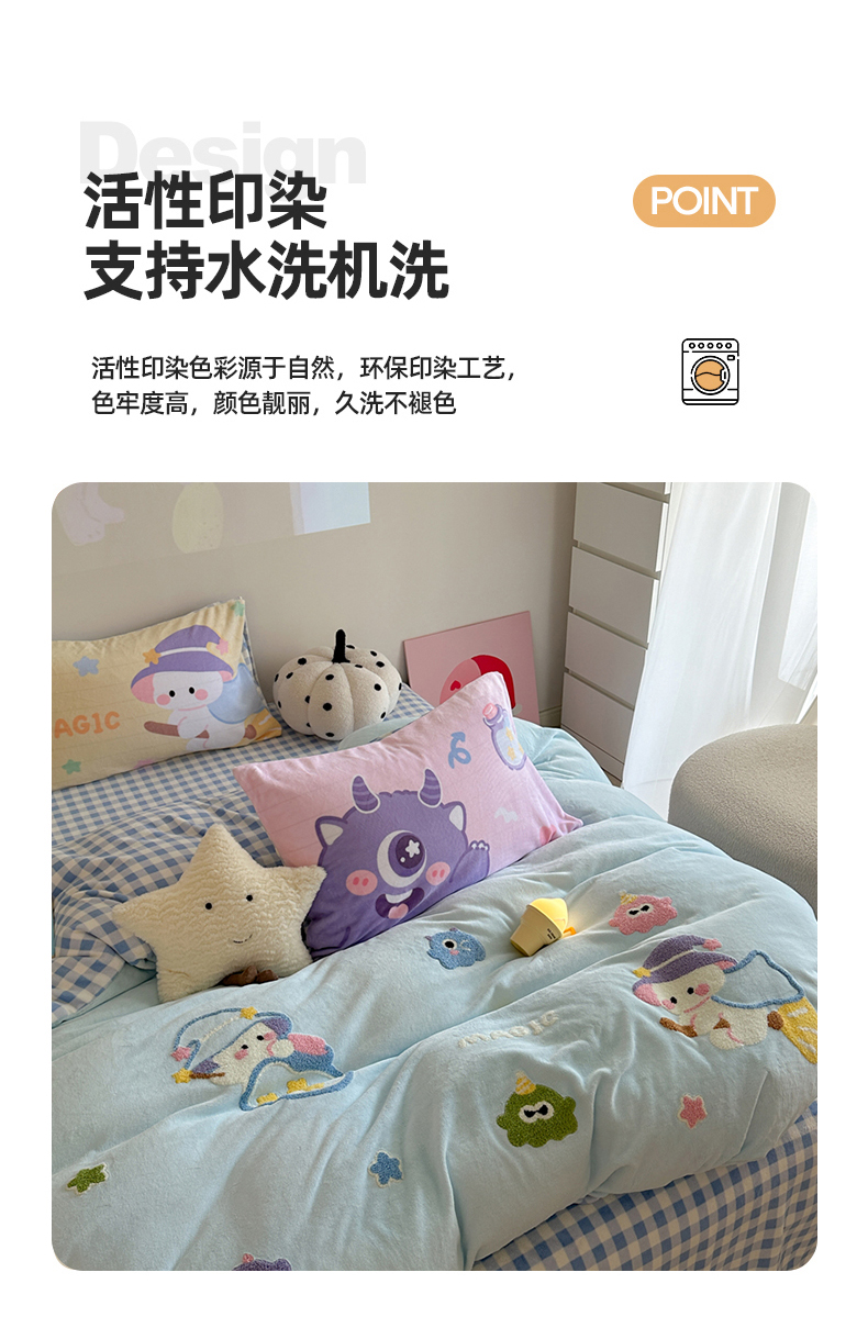 (总)眠屿家纺 2025新款加厚牛奶绒毛巾绣四件套,乐趣,面包狗,玩偶,玩泡泡