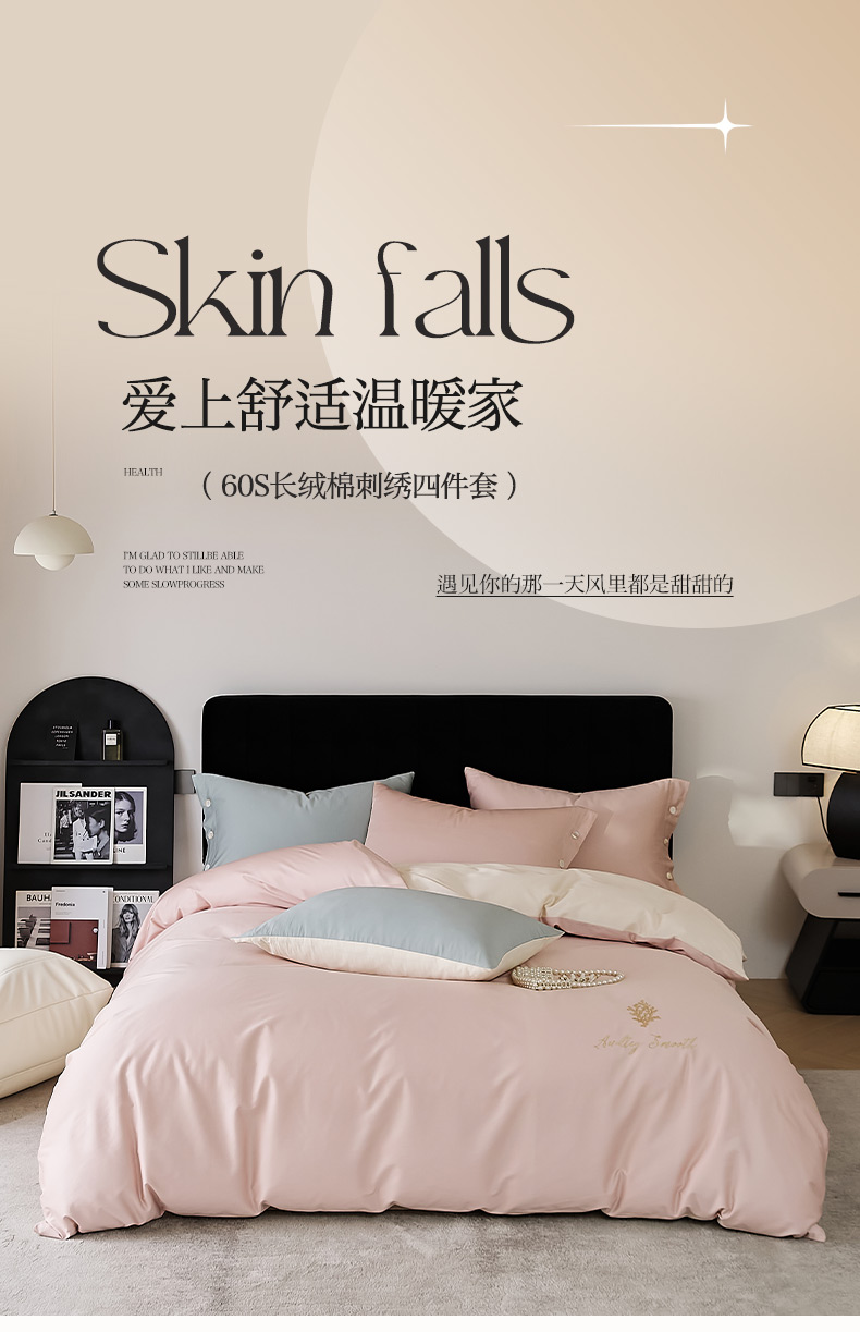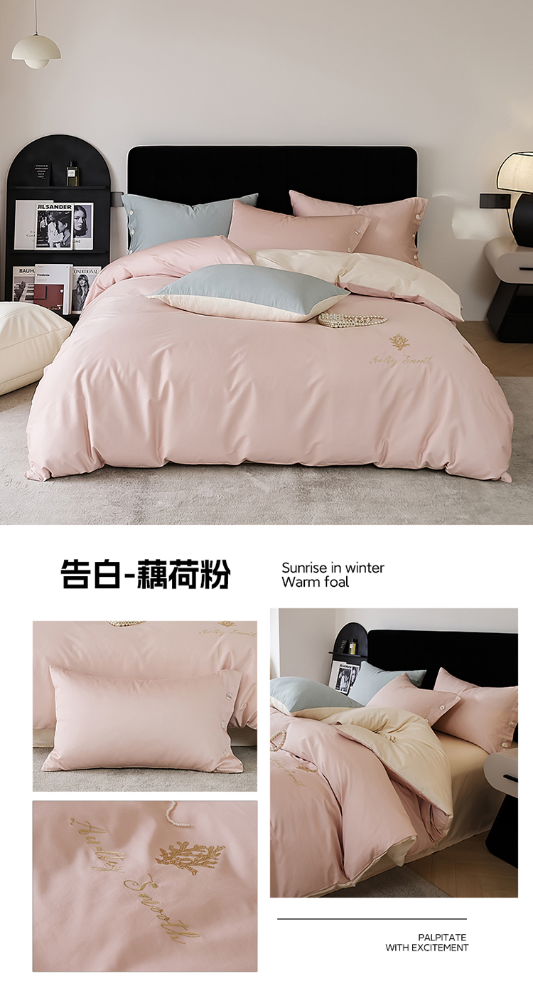 当前位置: 91家纺网 > 商品网购 > 床品套件 > 四件套 > 长绒棉四件套 > 2024新款60S长绒棉珊瑚绣花款四件套-告白系列(英文版) 告白-藕荷粉