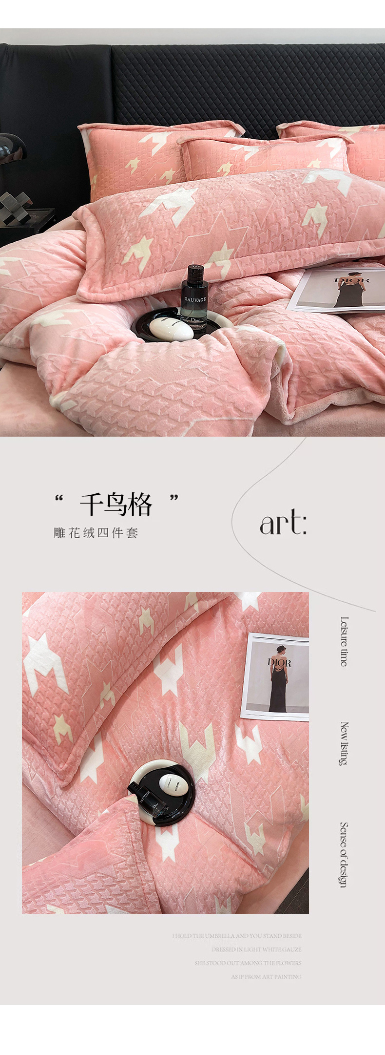 (总)金喜 2024新款加厚保暖230克高克重牛奶绒四件套雕花绒四件套-牛奶绒雕花系列,波西米亚,春色,冬雪,林深见鹿,曼哈顿,木槿-粉,木槿-绿,千鸟格,青露,秋意浓,雪柳,幽兰,幽香恋曲,花海