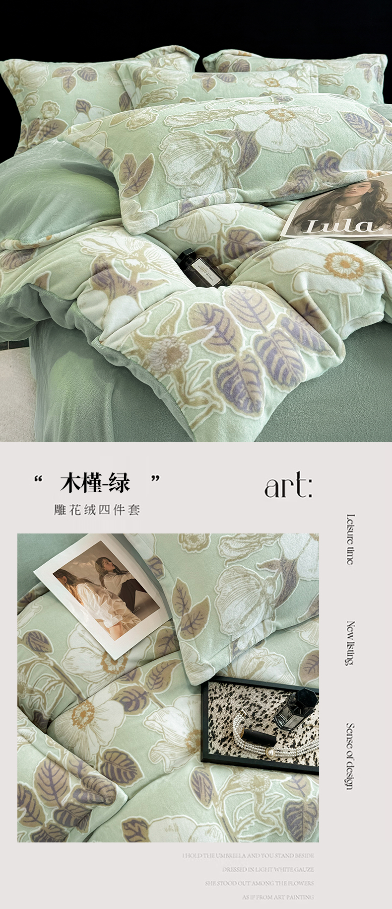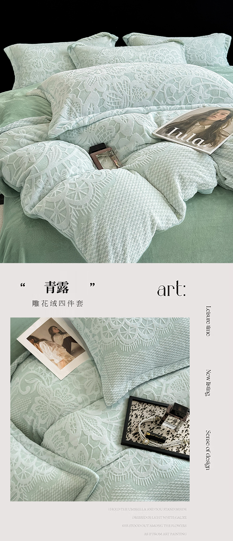 (总)金喜 2024新款230克高克重牛奶绒雕花四件套优雅风牛奶绒套件-木槿系列,木槿-粉,木槿-绿