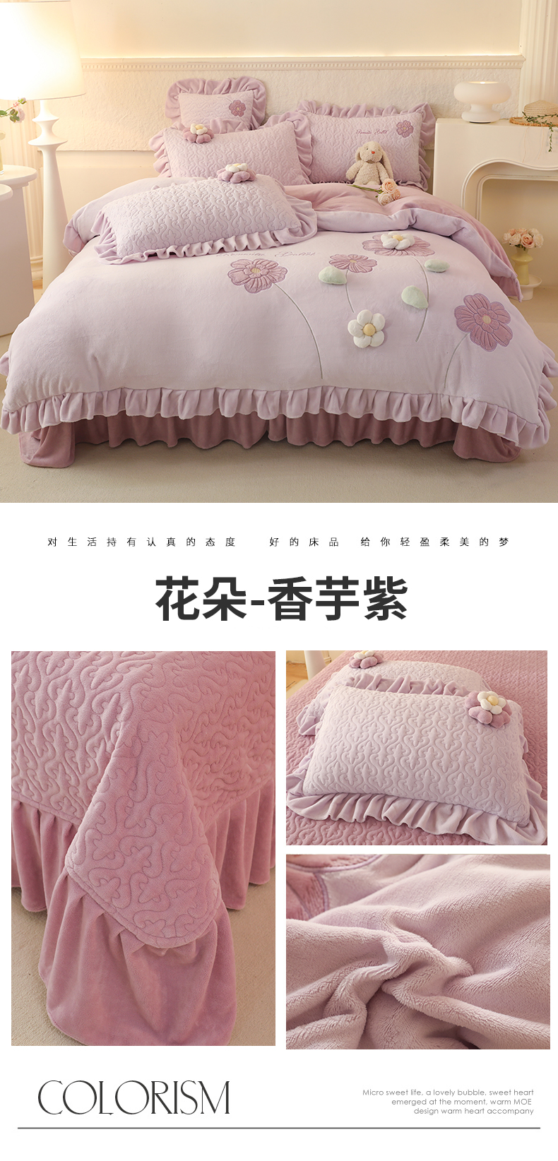 绒棉世家 2025A类高克重牛奶绒床盖款韩版立体花四件套-花朵系列香芋紫
