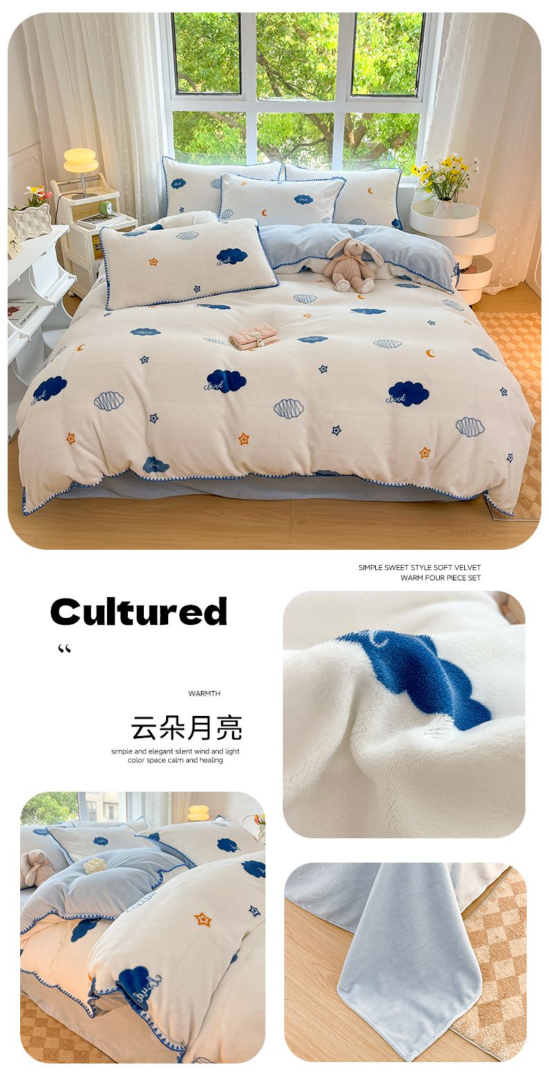 当前位置: 91家纺网 > 商品网购 > 床品套件 > 四件套 > 牛奶绒四件套 > (买家秀 爆款不断货)A类母婴级双面牛奶绒四件套三角针珊瑚绒雪花绒四件套高克重卡通牛奶绒四件套花卉 云朵月亮