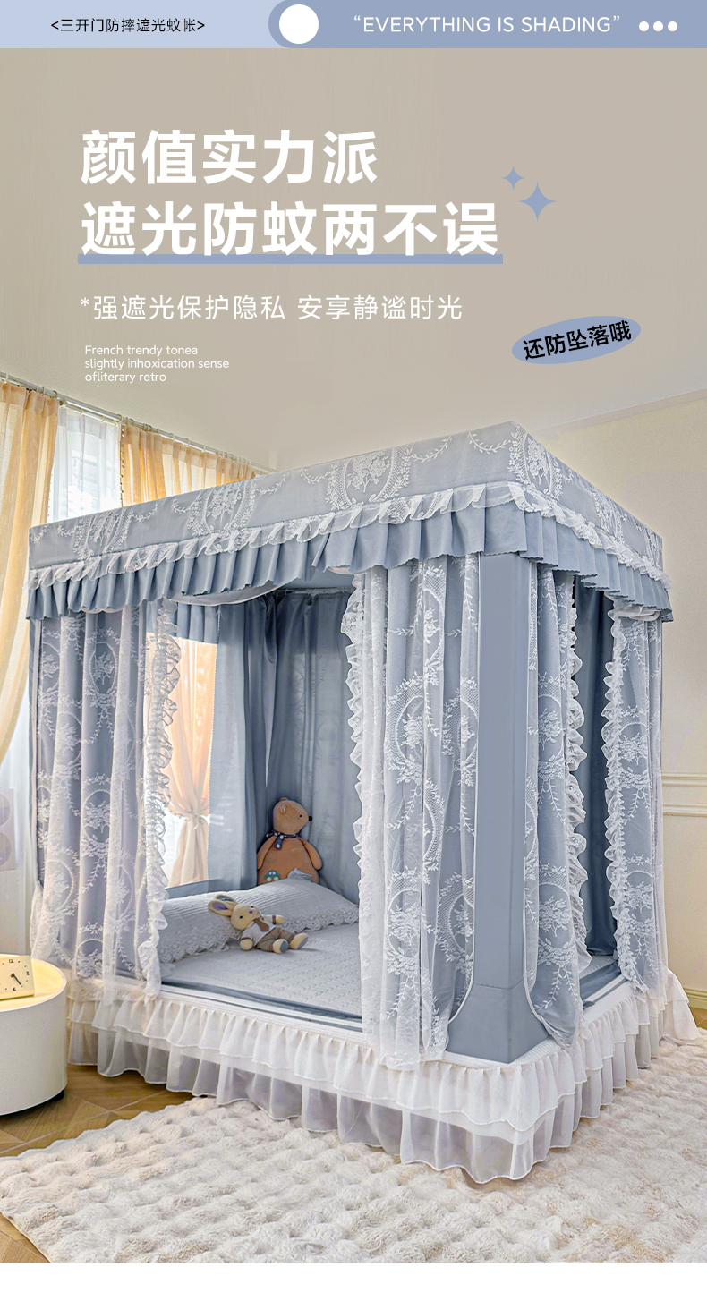 当前位置: 91家纺网 > 商品网购 > 床上用品 > 蚊帐 > 坐床式蚊帐 > 都市缘蚊帐 2025新款遮光坐床布帘蚊帐拉链方帐婴儿防摔蚊帐-501 baby蓝