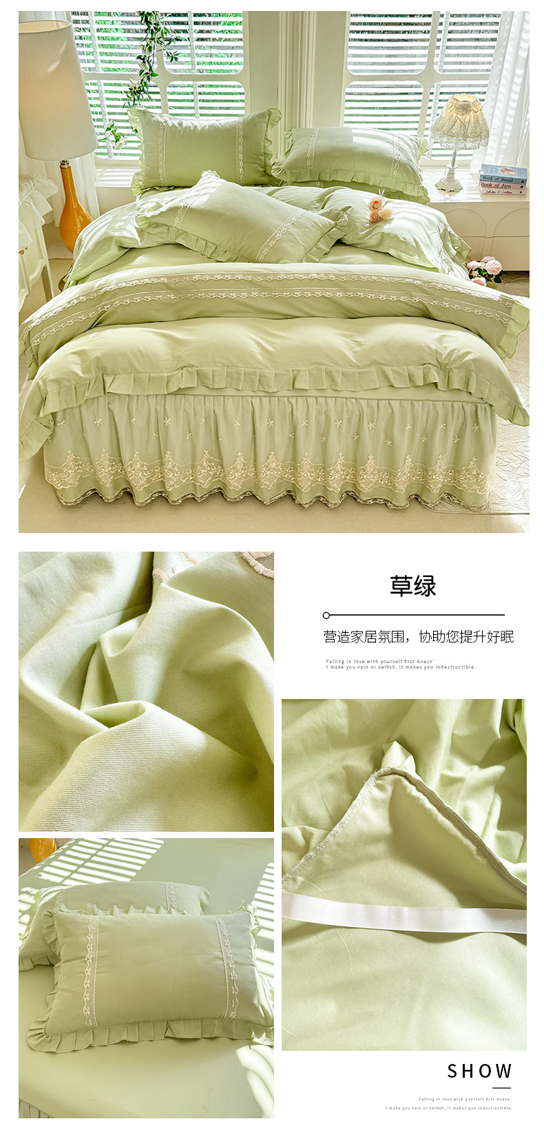 当前位置: 91家纺网 > 商品网购 > 床品套件 > 四件套 > 全棉普通四件套 > 美达家纺 2025新款山茶花系列纯色A类全棉单层床裙四件套 山茶花-草绿