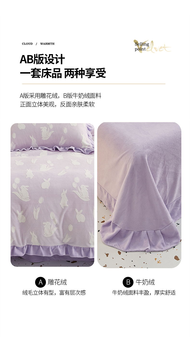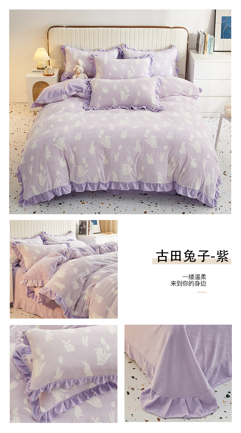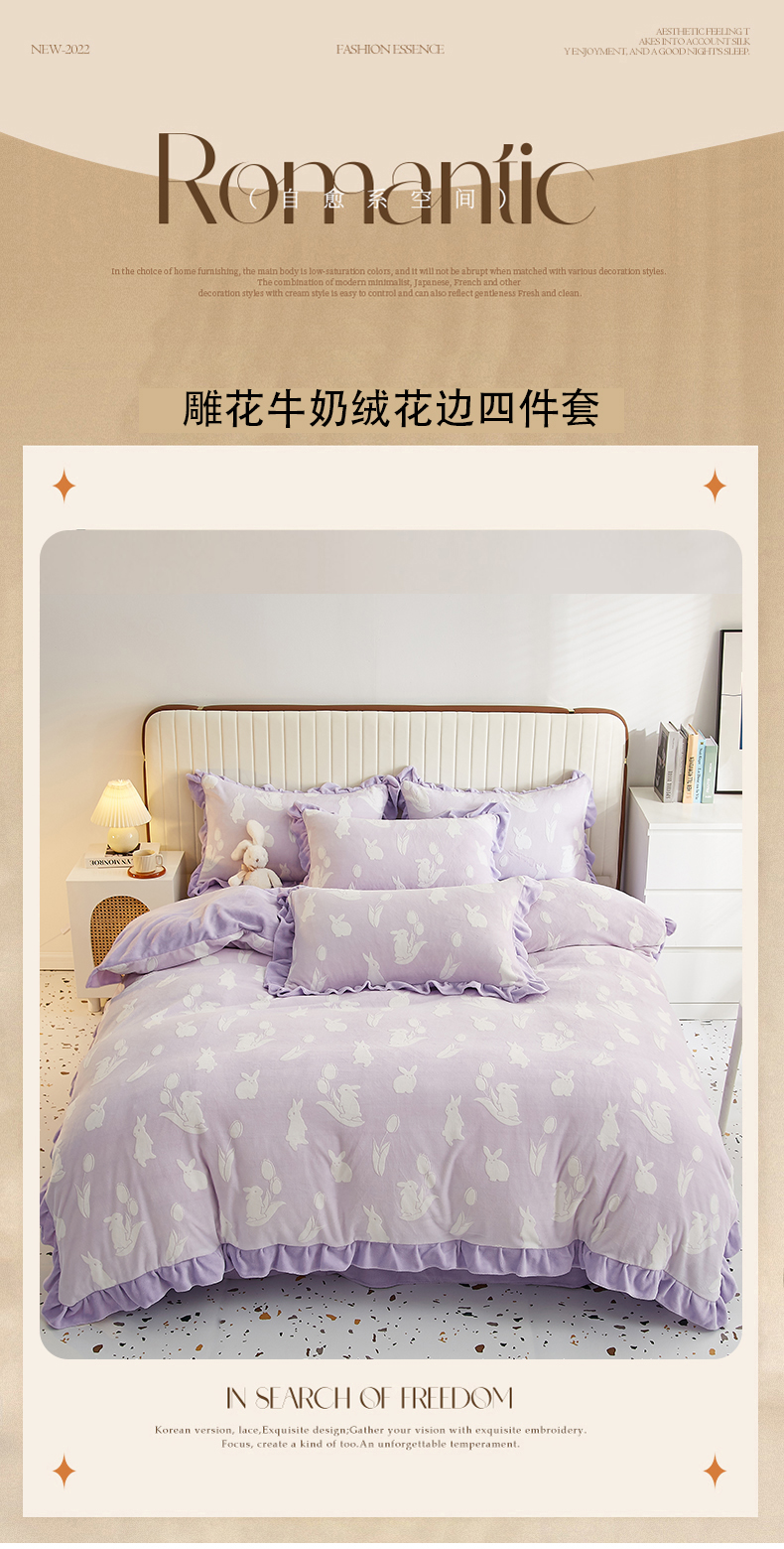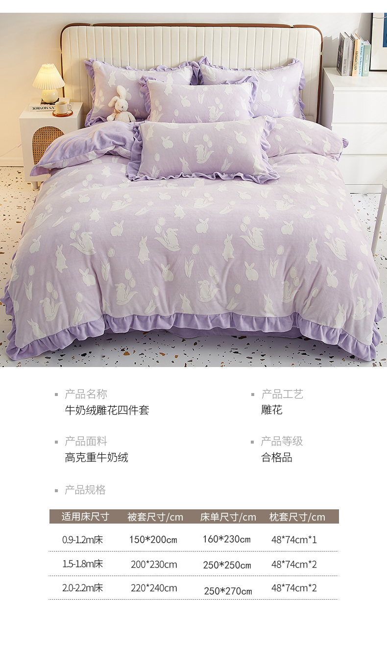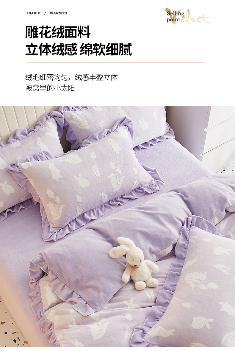 当前位置: 91家纺网 > 商品网购 > 床品套件 > 四件套 > 牛奶绒四件套 > (买家秀爆款不断货)A类母婴级牛奶雕花绒四件套珊瑚绒四件套雪花绒四件套韩版公主风雕花牛奶绒床盖四件套 古田兔子-紫