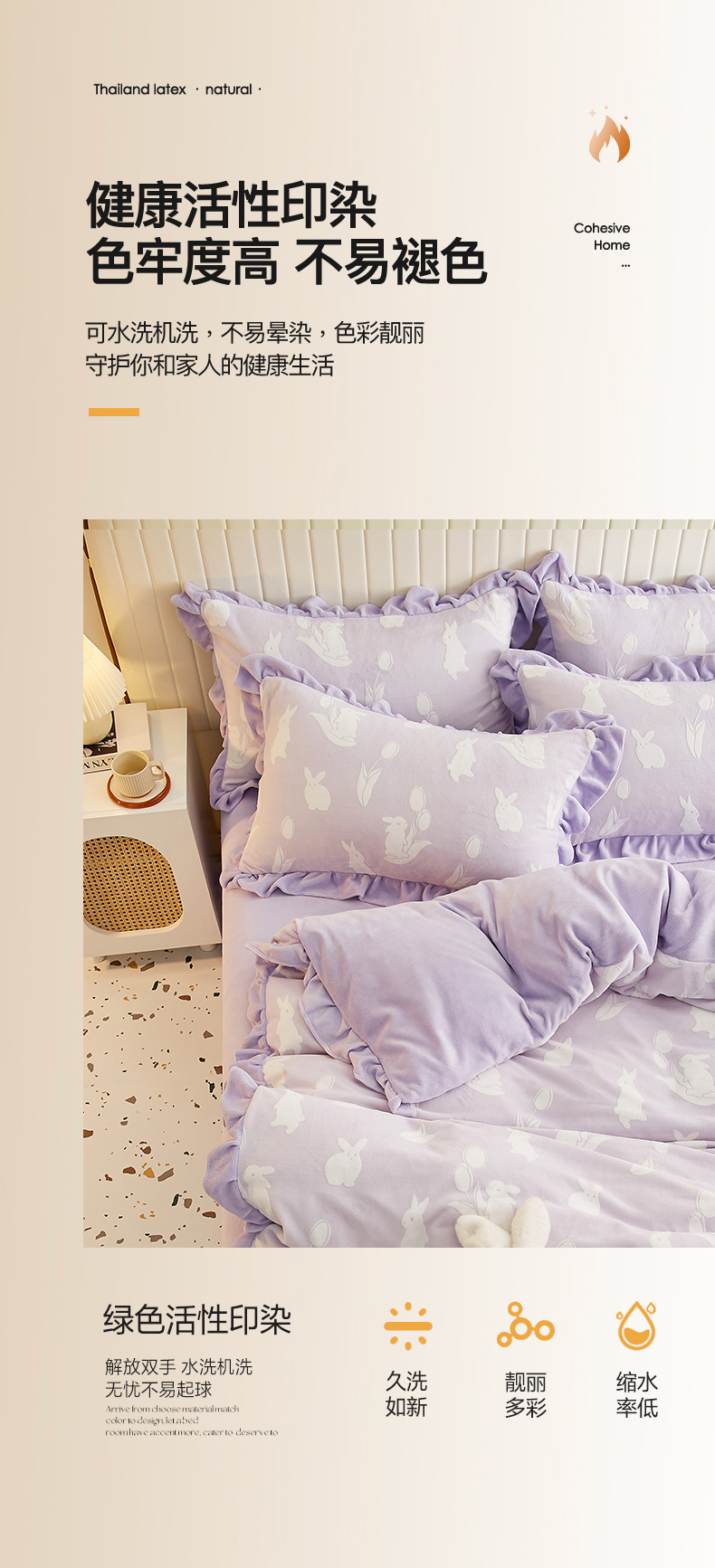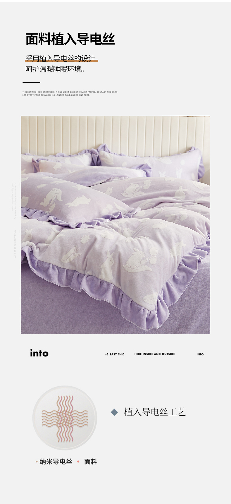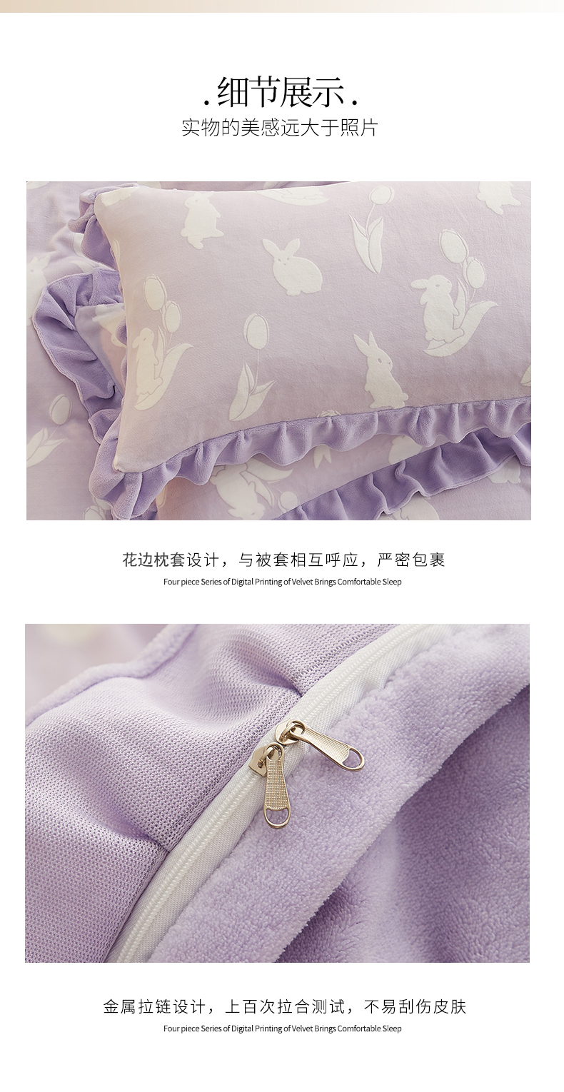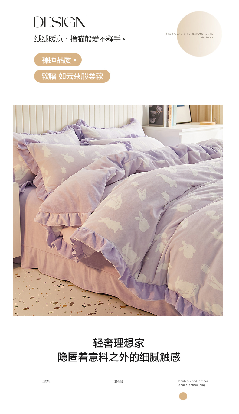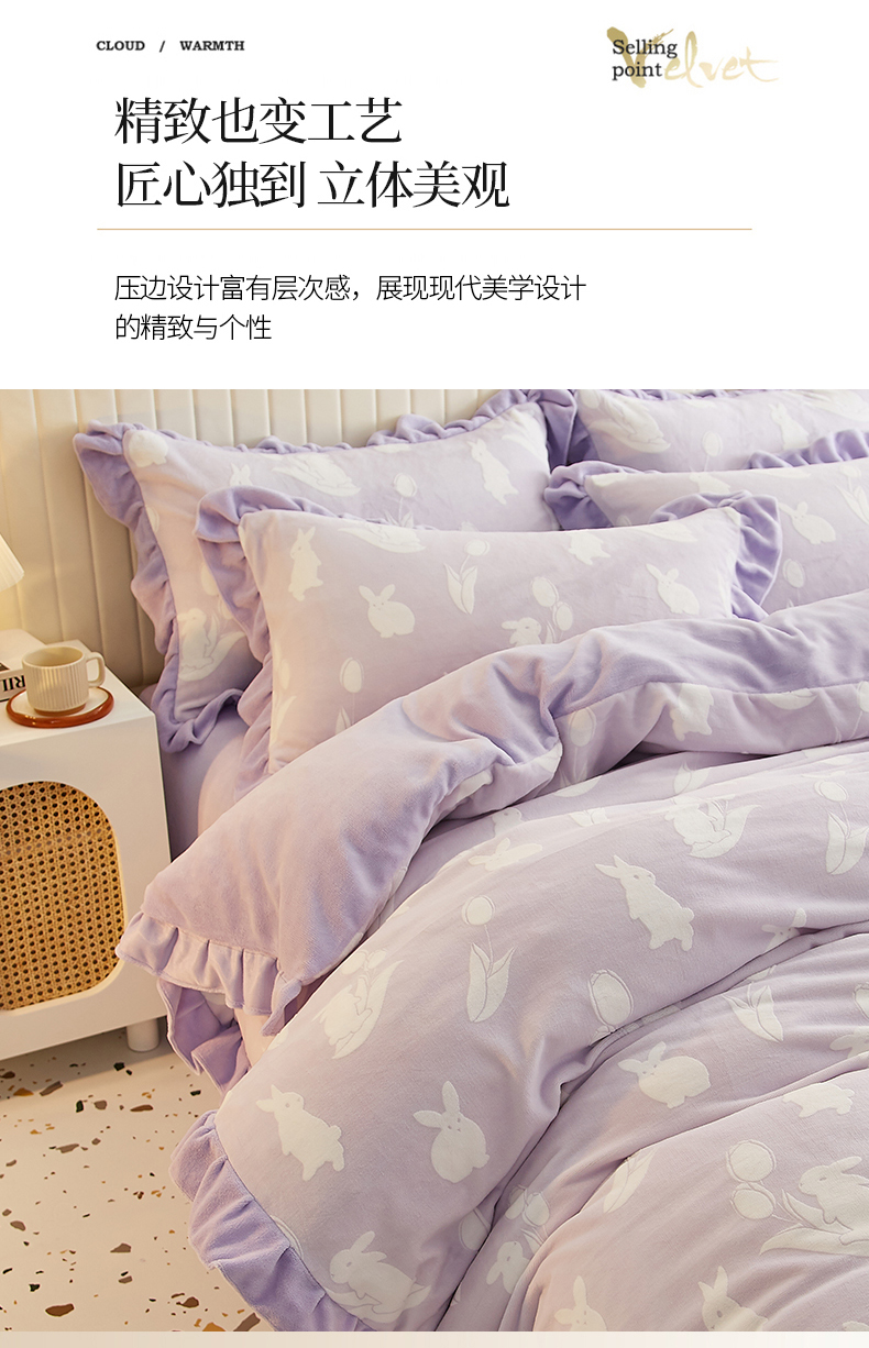 当前位置: 91家纺网 > 商品网购 > 床品套件 > 四件套 > 牛奶绒四件套 > (买家秀爆款不断货)A类母婴级牛奶雕花绒四件套珊瑚绒四件套雪花绒四件套韩版公主风雕花牛奶绒床盖四件套 古田兔子-紫