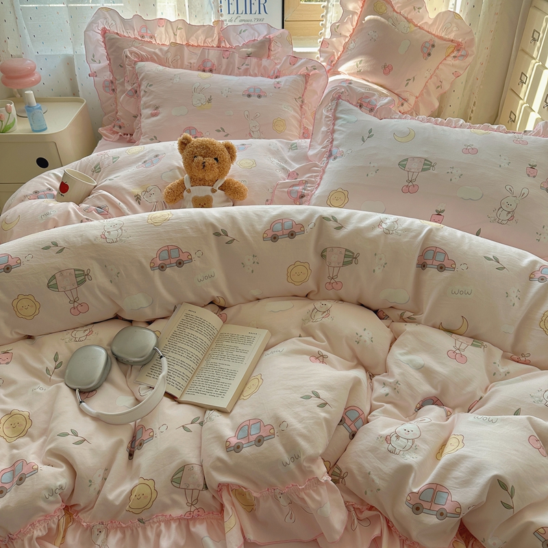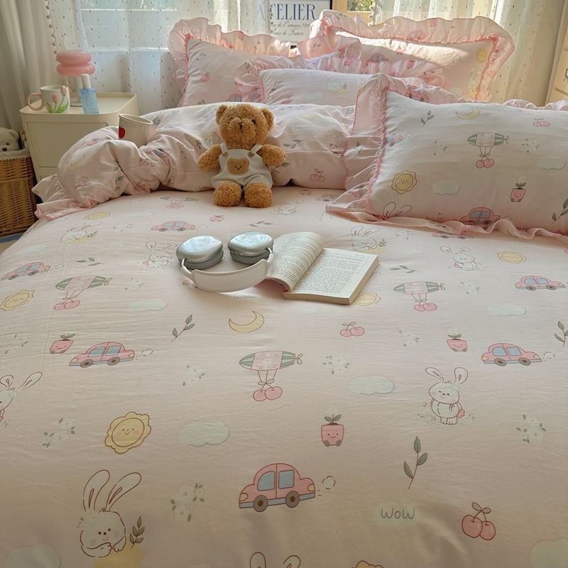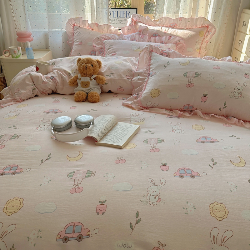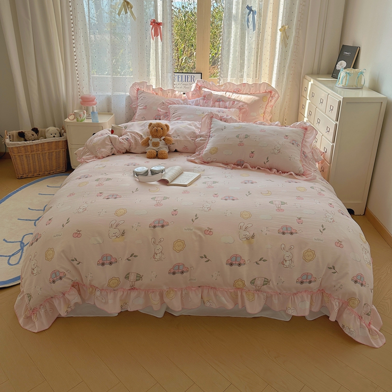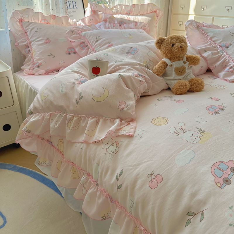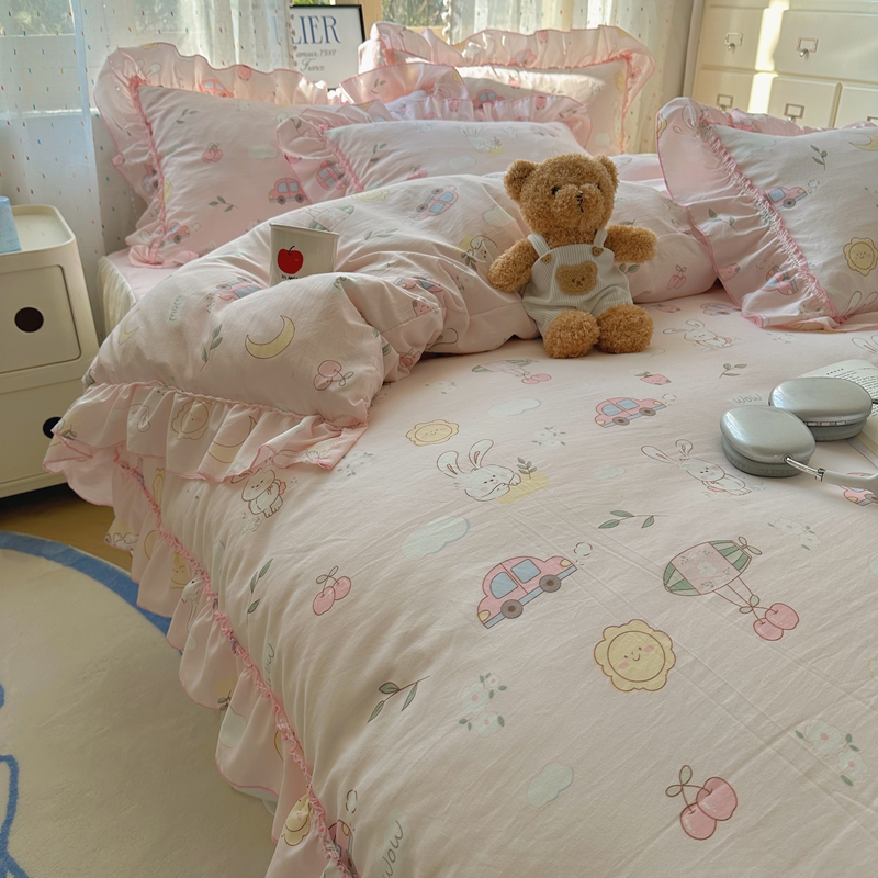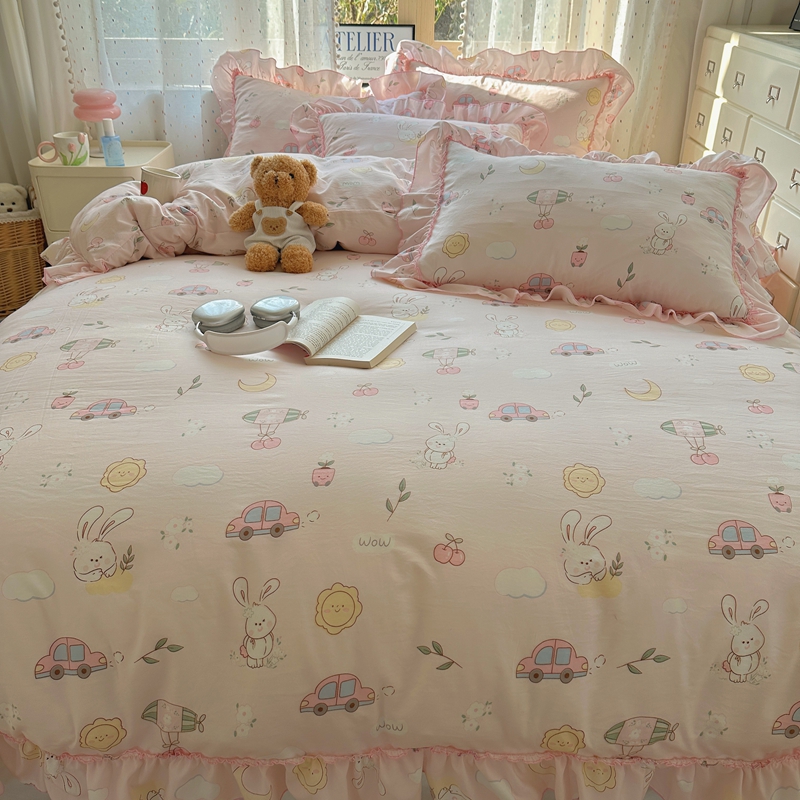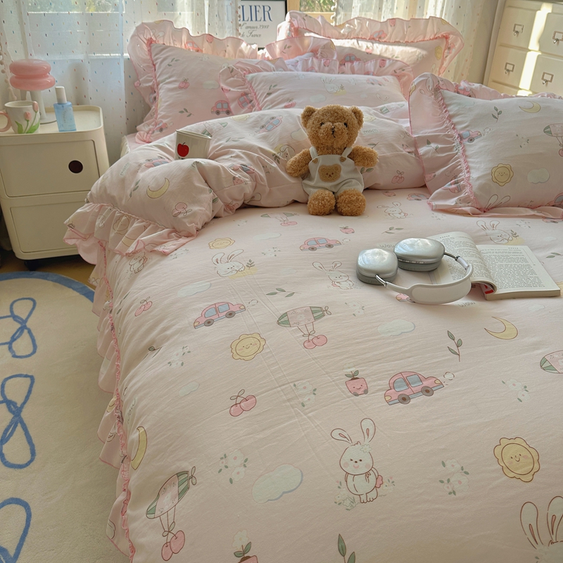 当前位置: 91家纺网 > 商品网购 > 床品套件 > 四件套 > 其它四件套 > 盼季家纺 2025新款公主风花边小清新水洗棉床上四件套床单被套床裙三件套-风格二 兔兔乐园