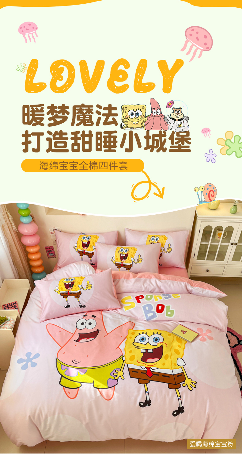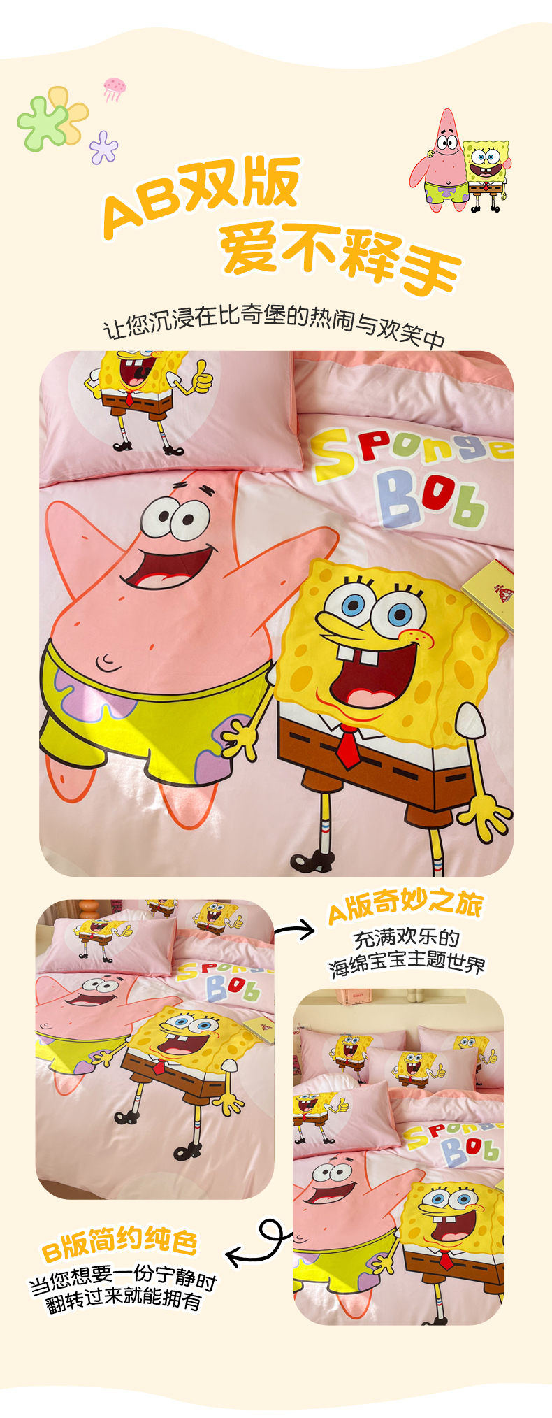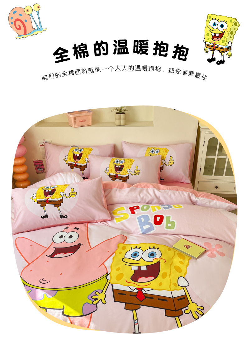 当前位置: 91家纺网 > 商品网购 > 床品套件 > 四件套 > 全棉普通四件套 > 金爱家纯棉数码印花系列四件套-海绵宝宝 棉D-粉粉海绵宝宝
