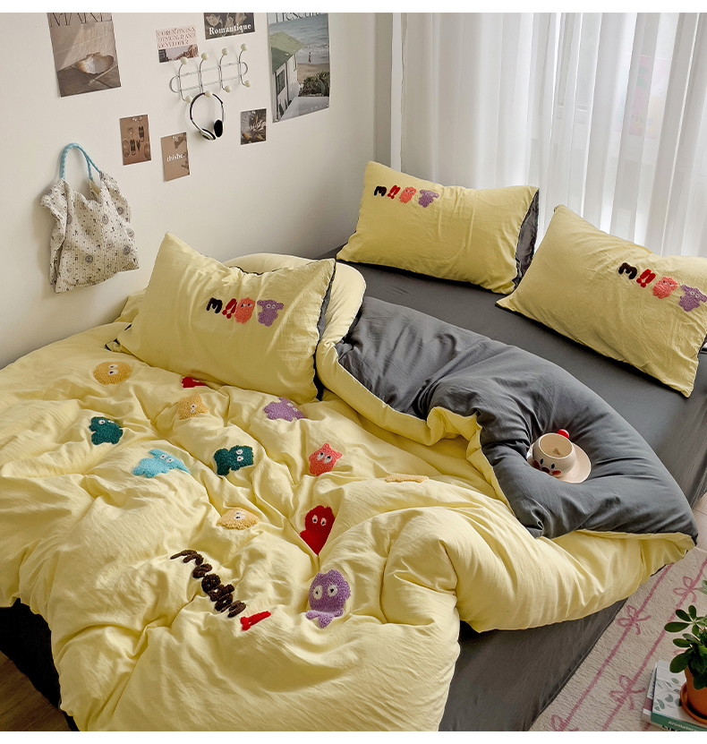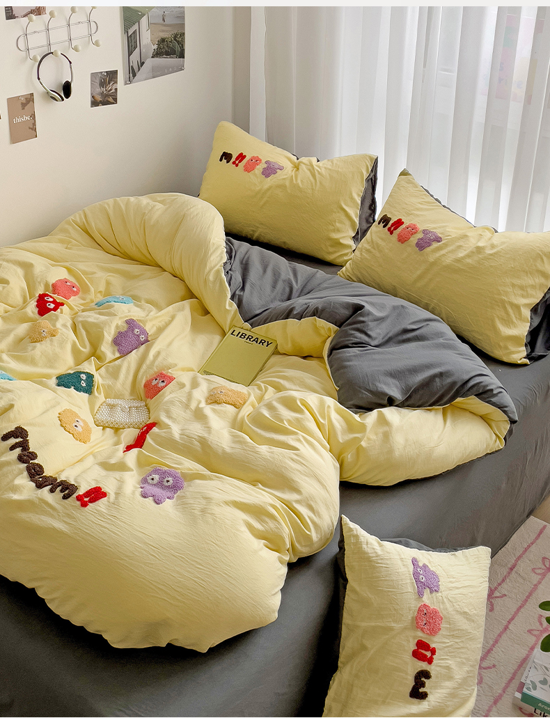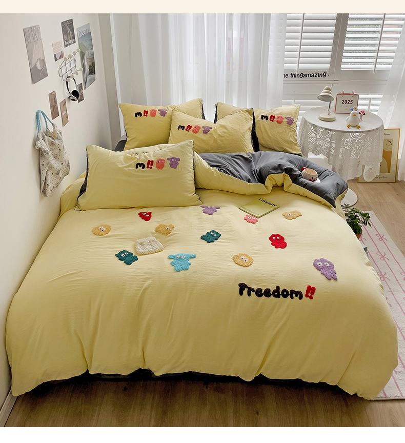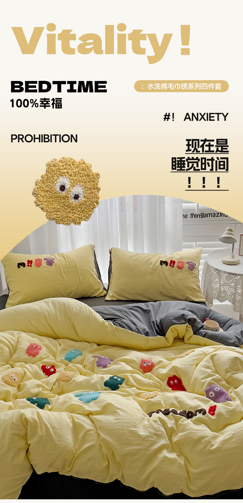 当前位置: 91家纺网 > 商品网购 > 床品套件 > 四件套 > 水洗棉四件套 > 花伞家居 2025新款可爱毛巾绣水洗棉四件套-自由自在(提供买家秀) 自由自在-黄深灰