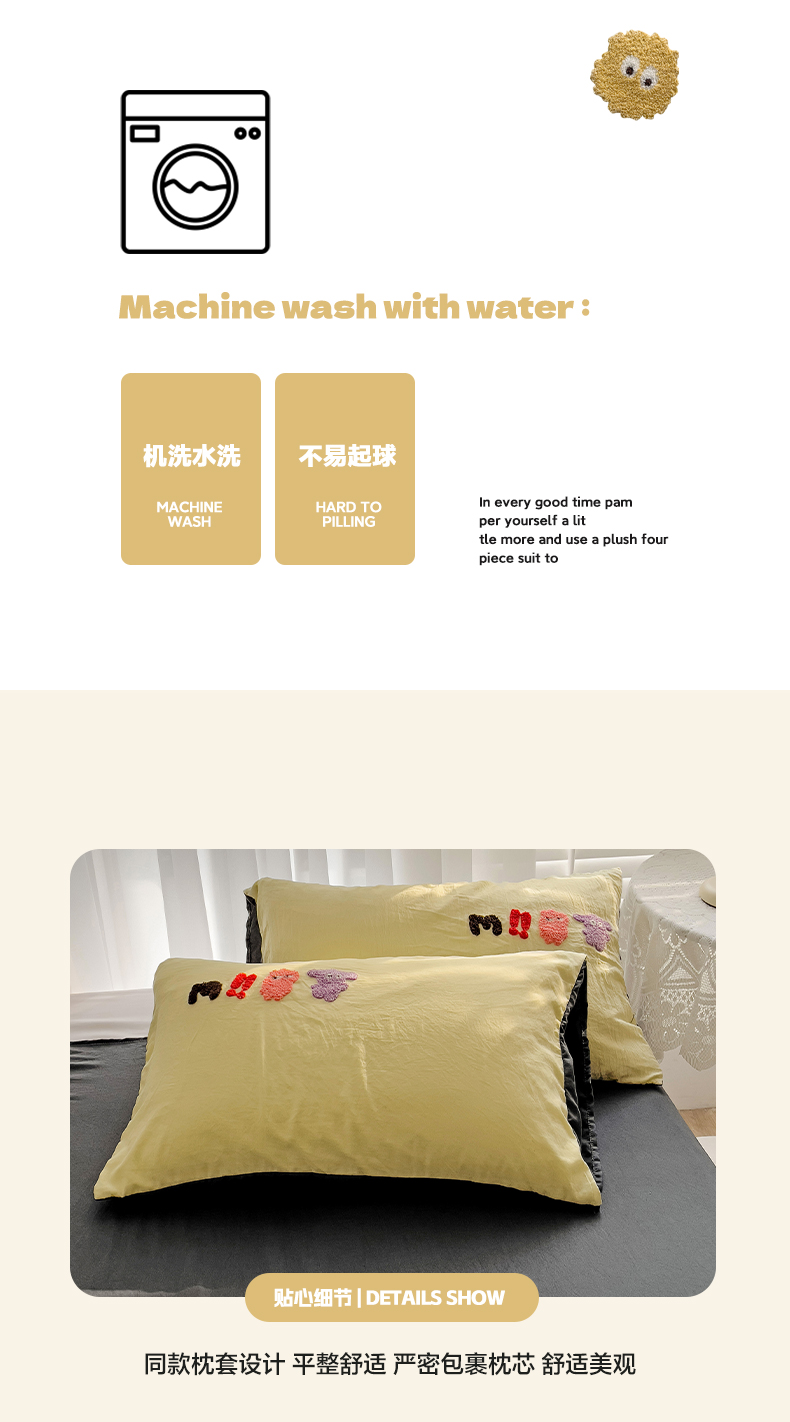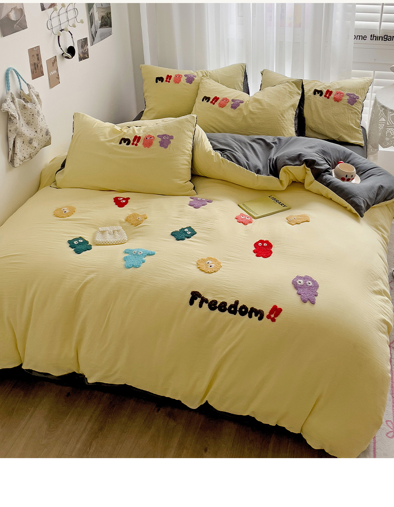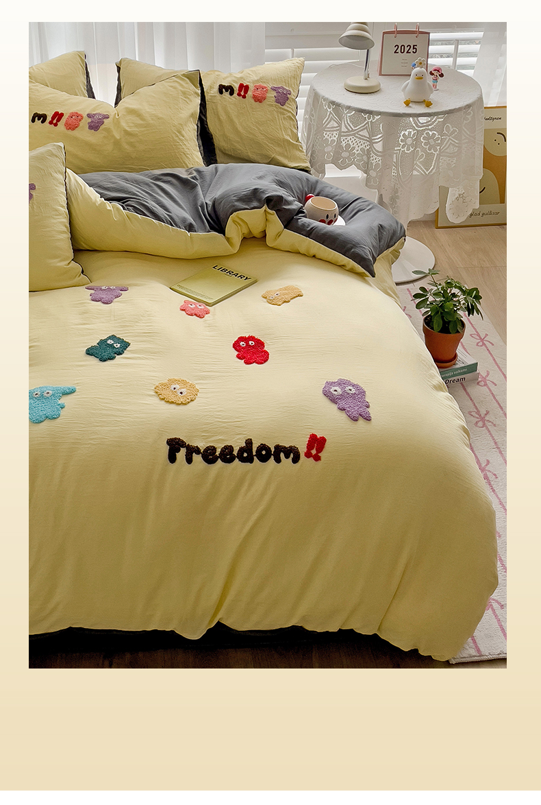 当前位置: 91家纺网 > 商品网购 > 床品套件 > 四件套 > 水洗棉四件套 > 花伞家居 2025新款可爱毛巾绣水洗棉四件套-自由自在(提供买家秀) 自由自在-黄深灰
