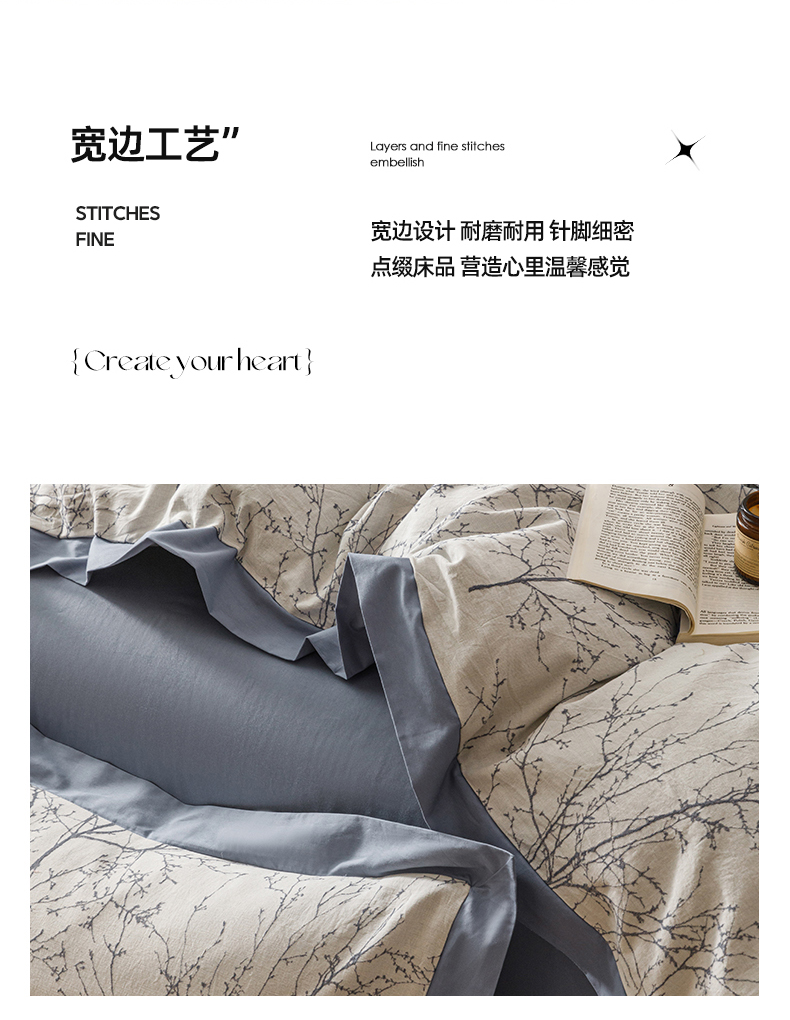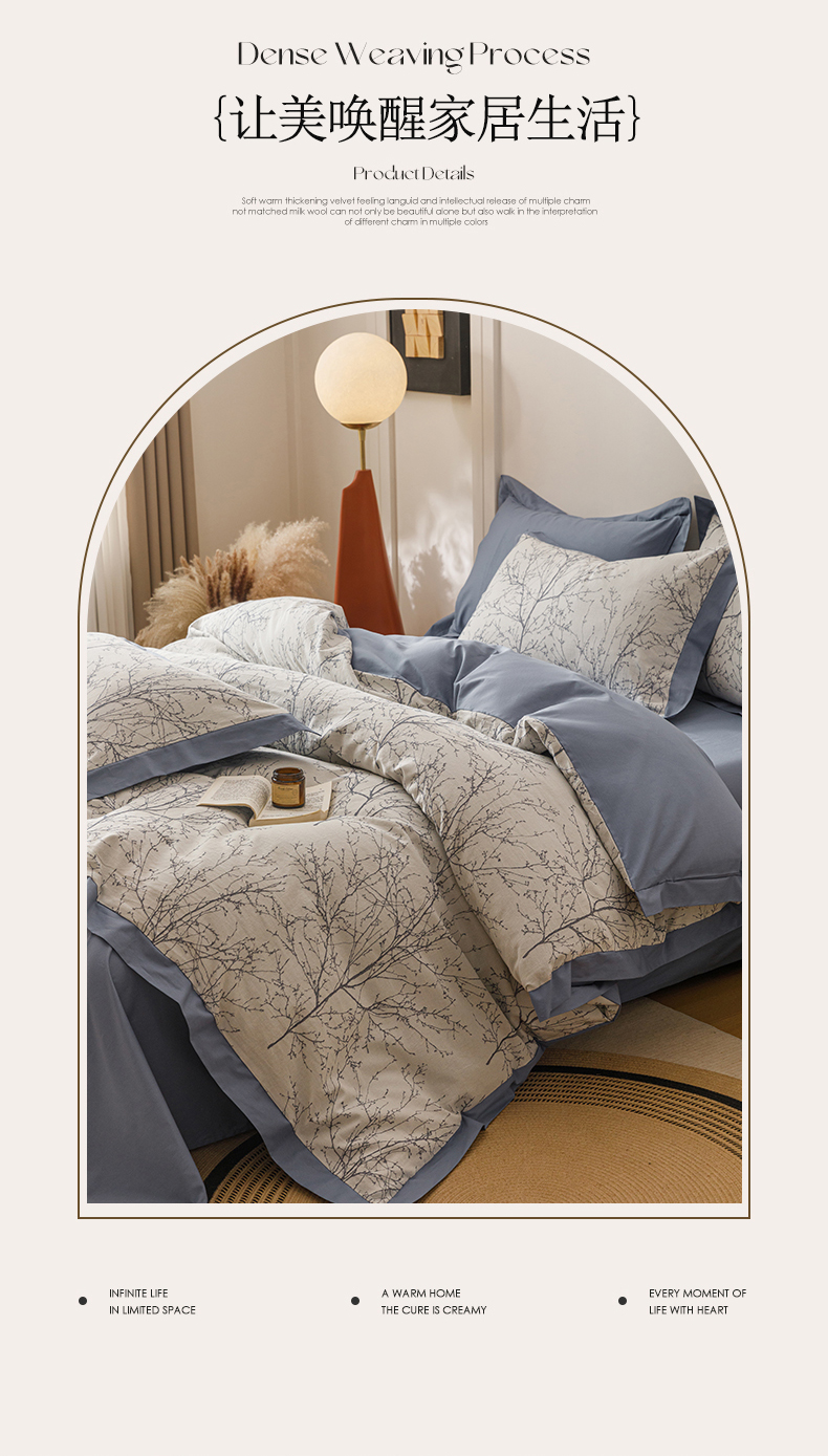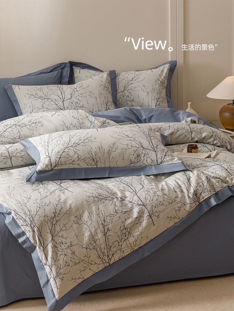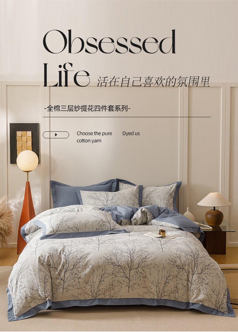 简宜家居(朝初家纺) 2025新款全棉宽边三层纱提花四件套 枝桠-牛仔蓝