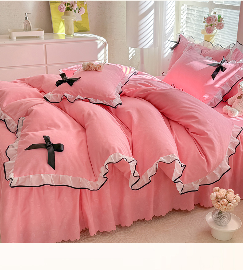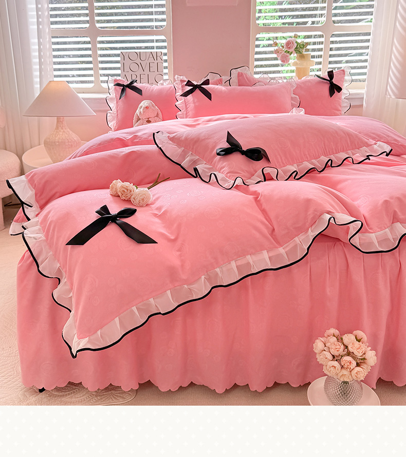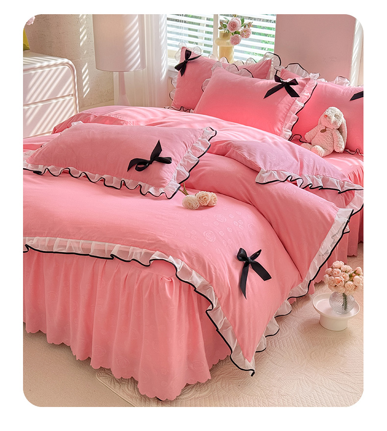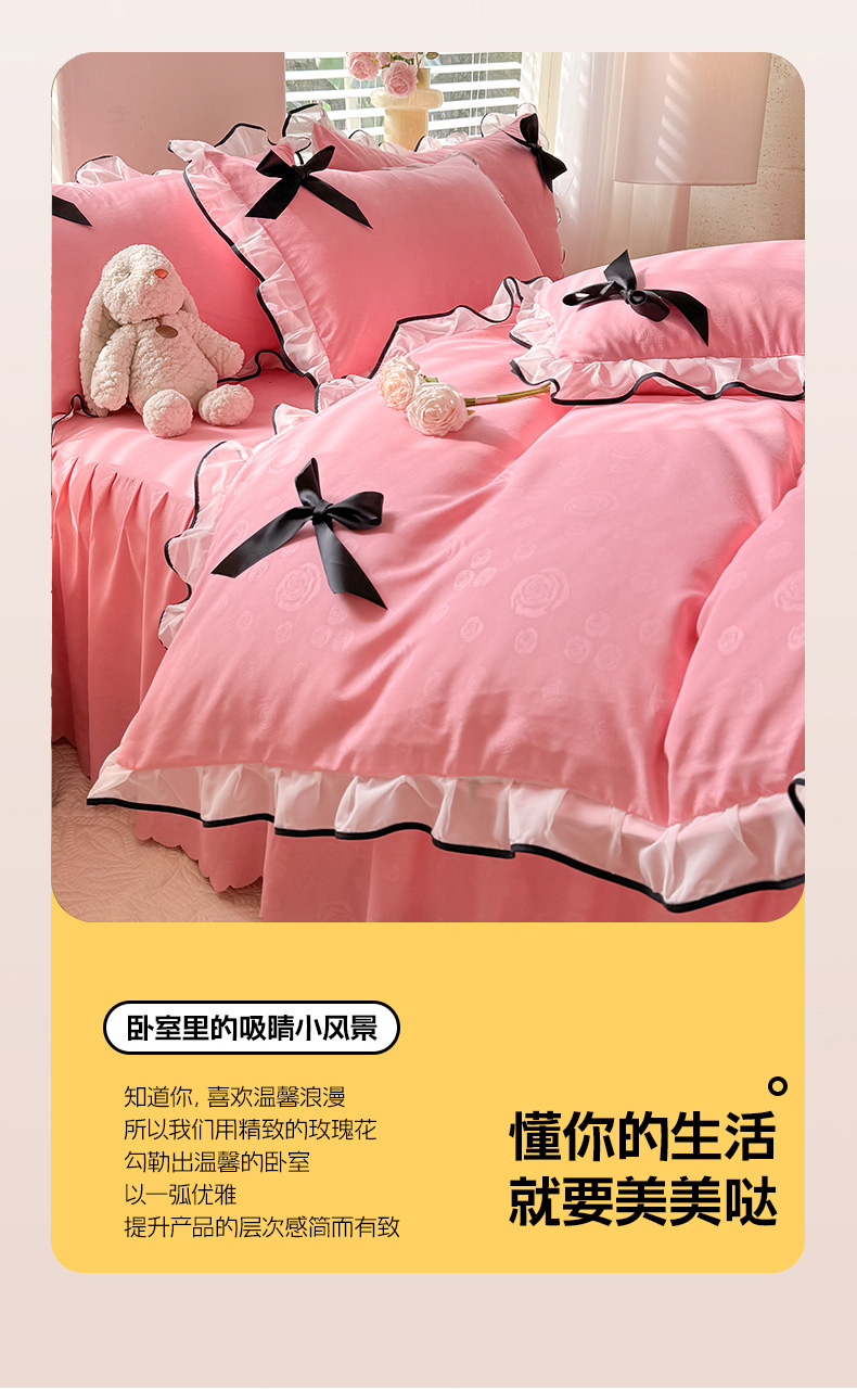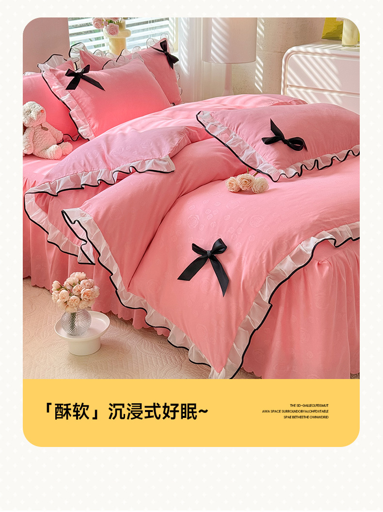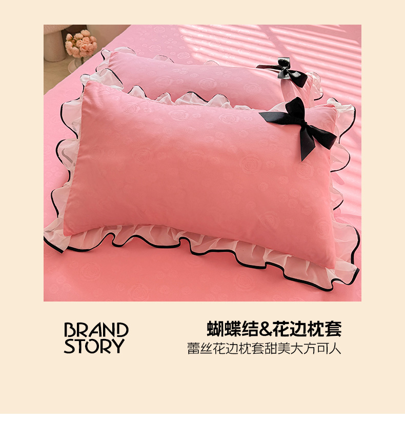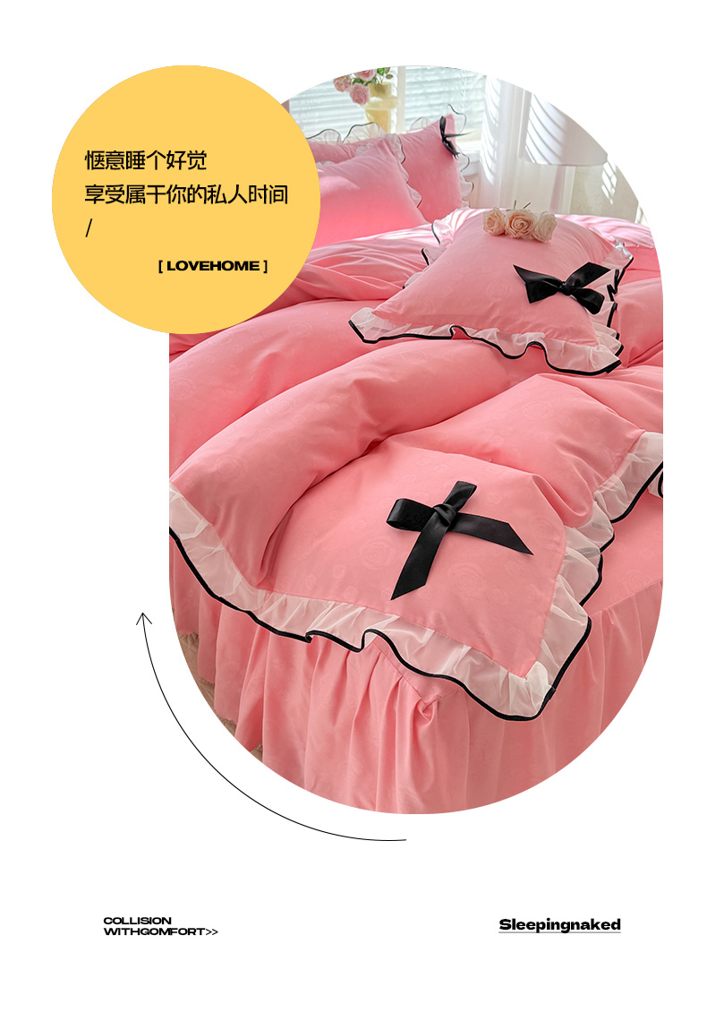 商品名称:莉莉安家纺 2025新款韩版亲肤磨毛花边蝴蝶结浪漫蕾丝花边款四件套--甜心系列【提供买家秀】 甜心-蜜桃粉